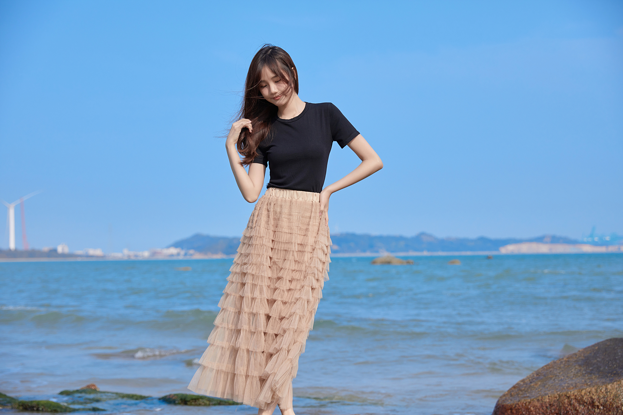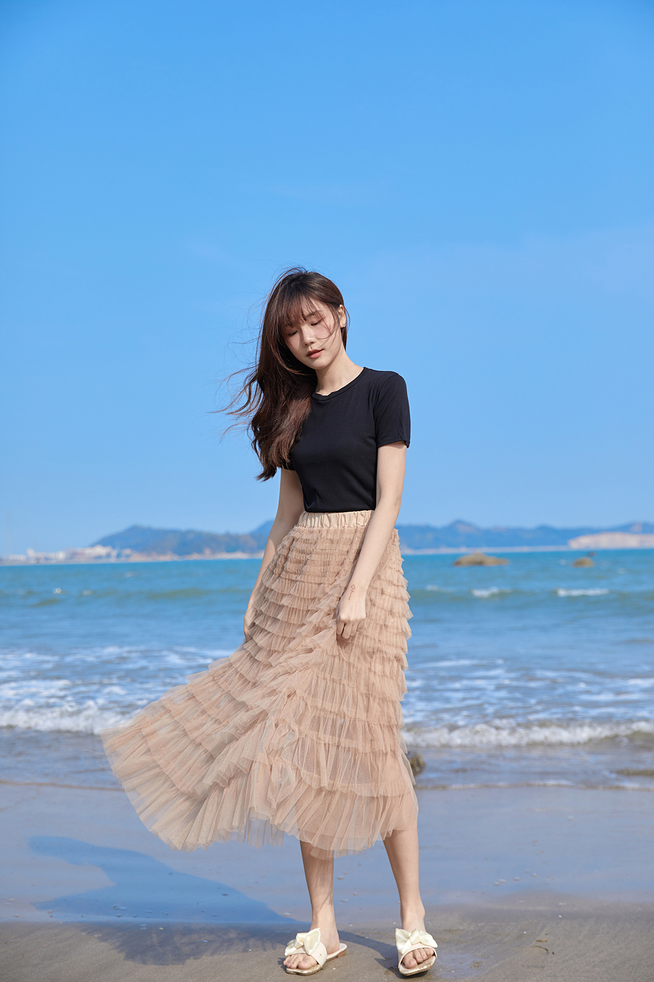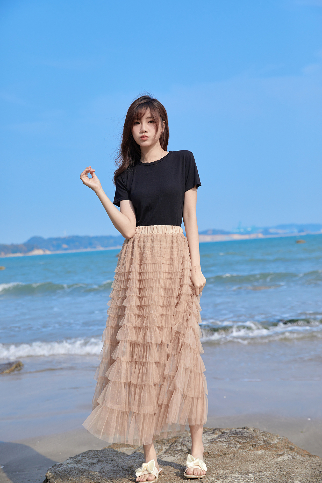 RM5363#纯色高腰层层网纱蛋糕裙a字百褶小个子半身裙仙女纱裙配显瘦黑T夏