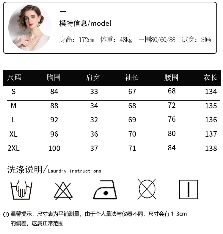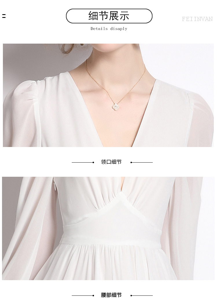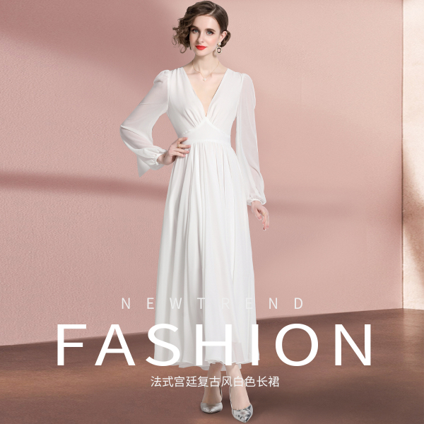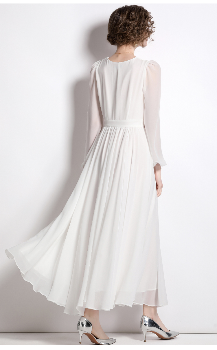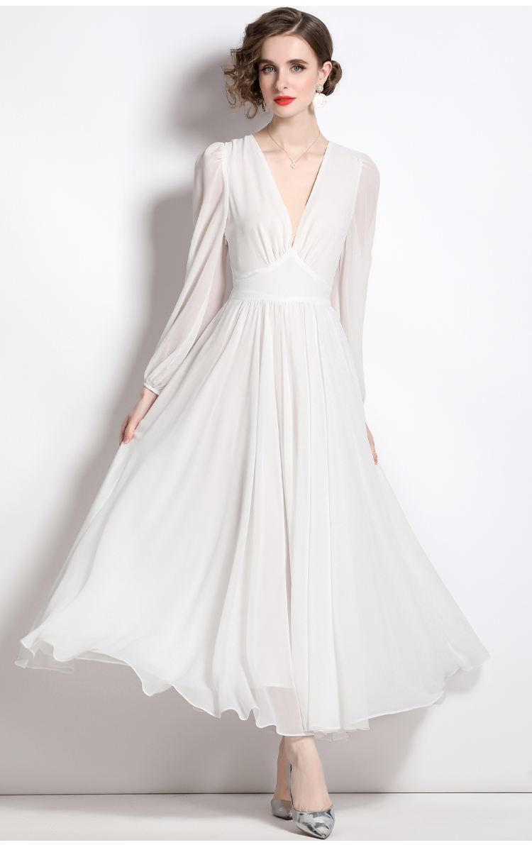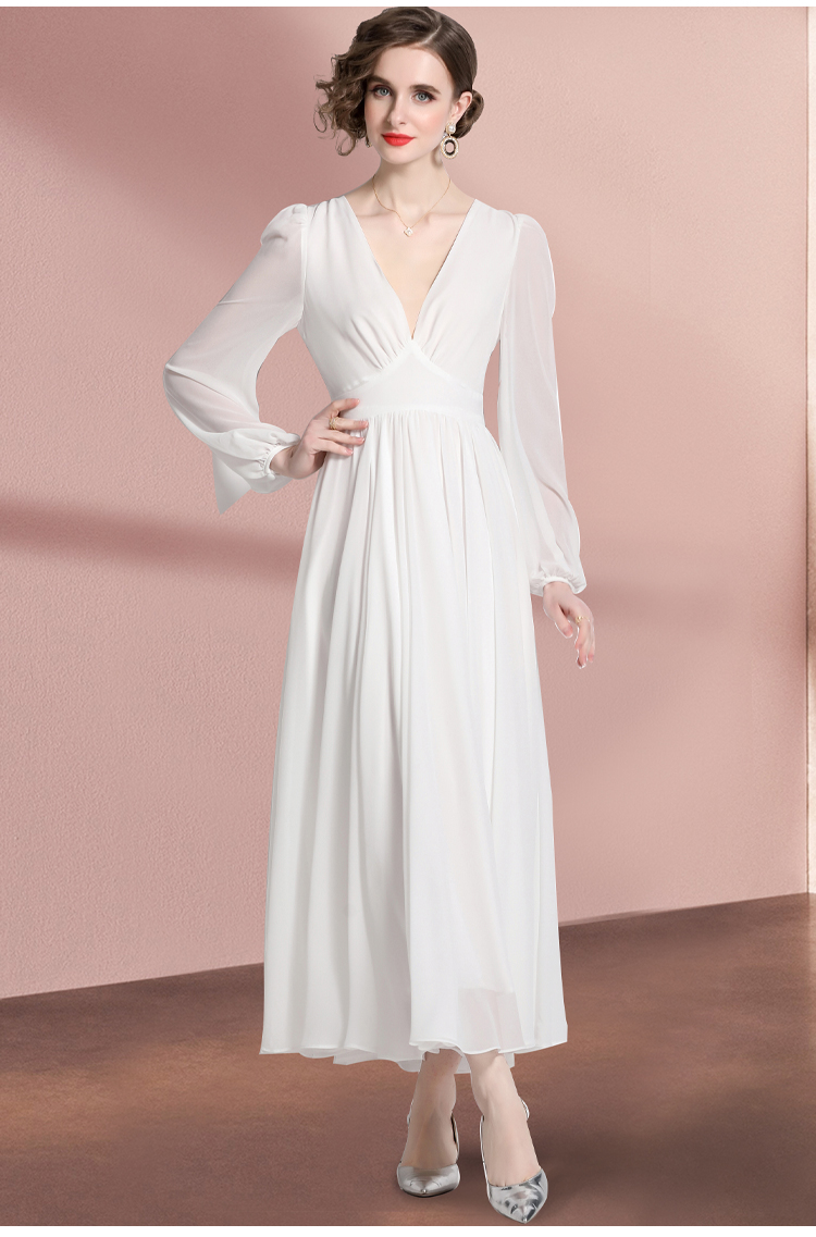 RM5413#法式宫廷复古风显瘦白色连衣裙长袖V领长裙