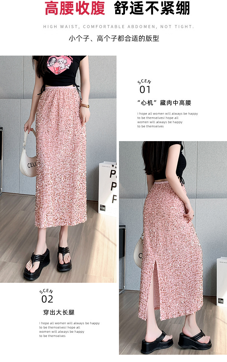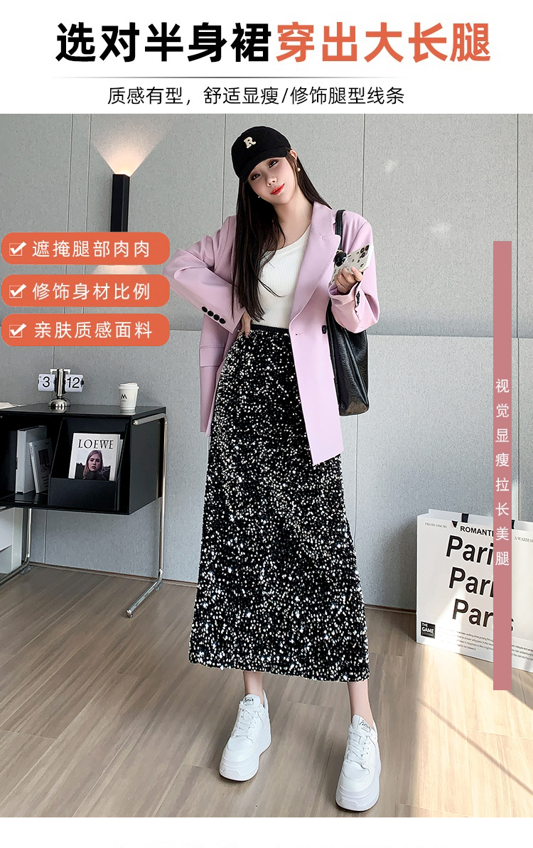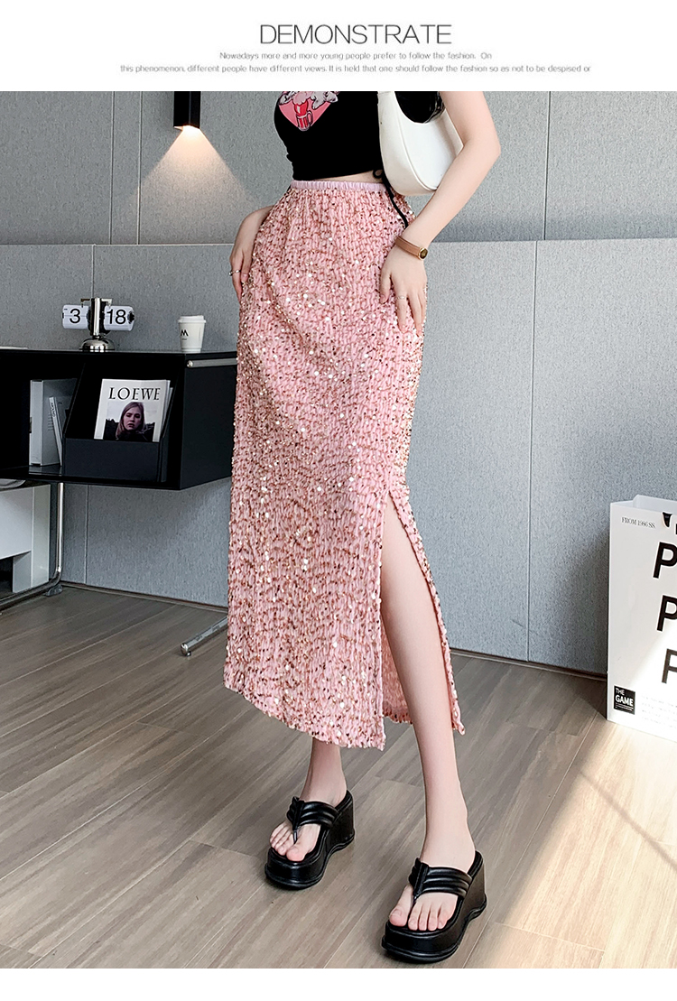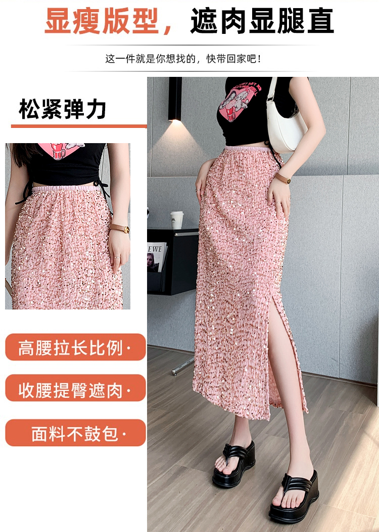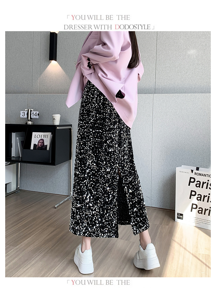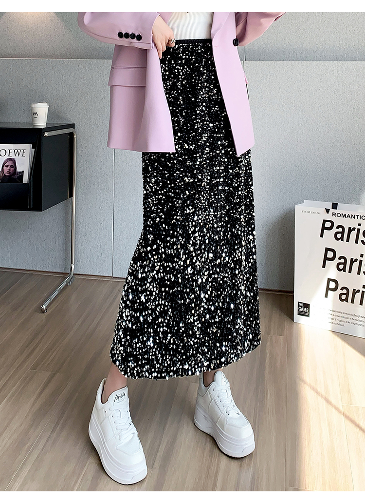 RM5644#春夏韩版高腰显瘦中长款重工亮片闪闪丝绒直筒开叉半身裙