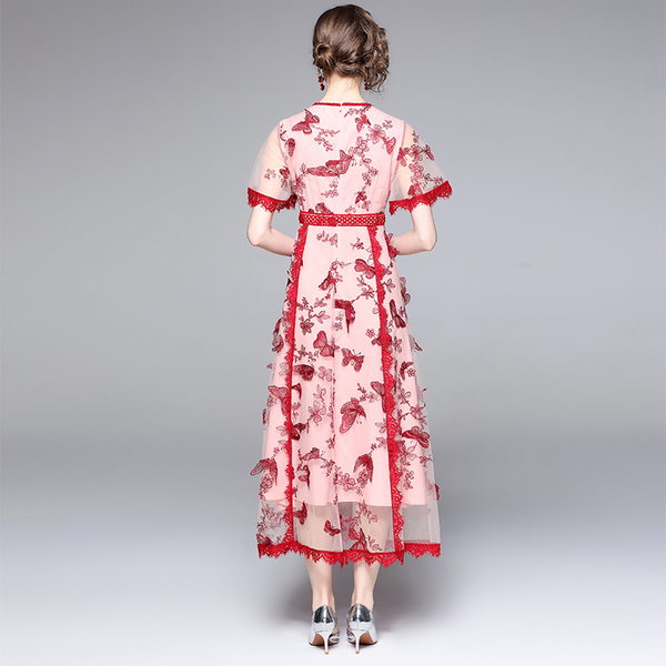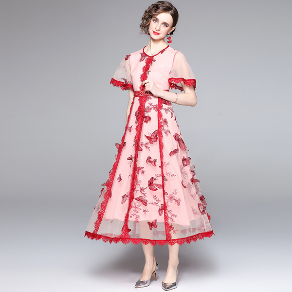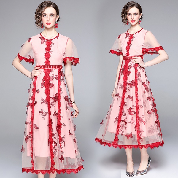 RM6001#圆领喇叭袖水溶花拼接刺绣蝴蝶收腰大摆网纱连衣裙