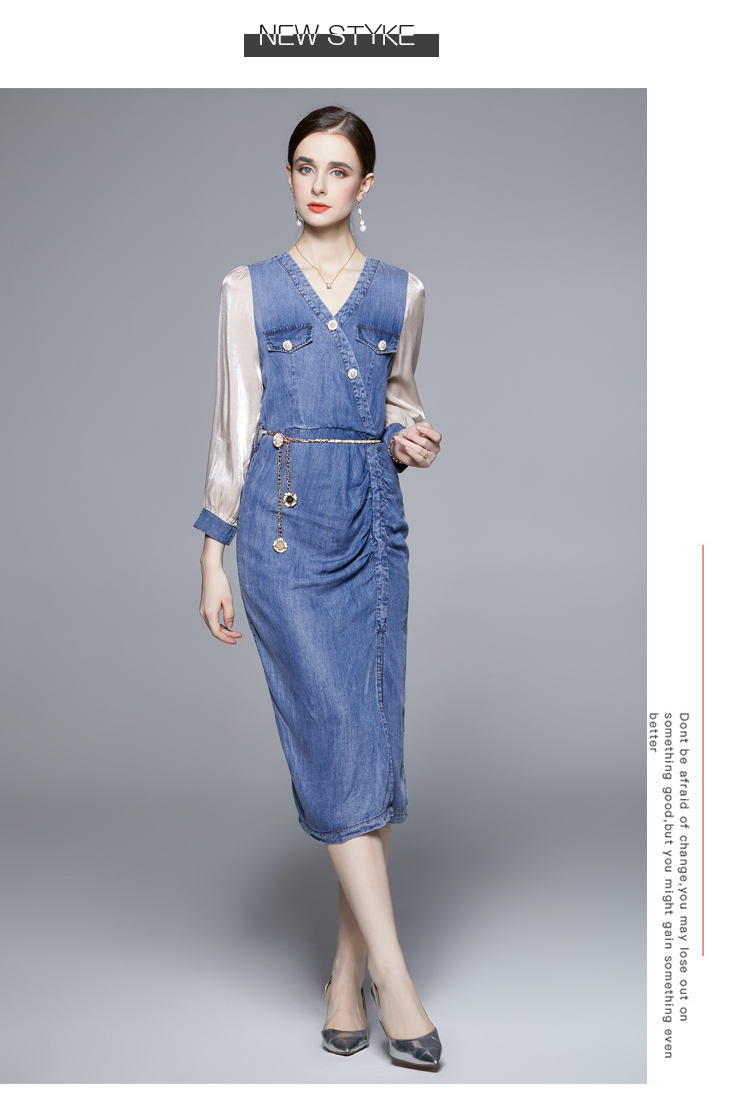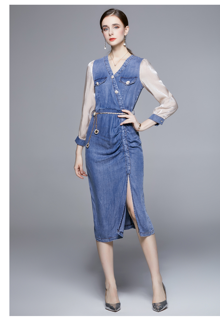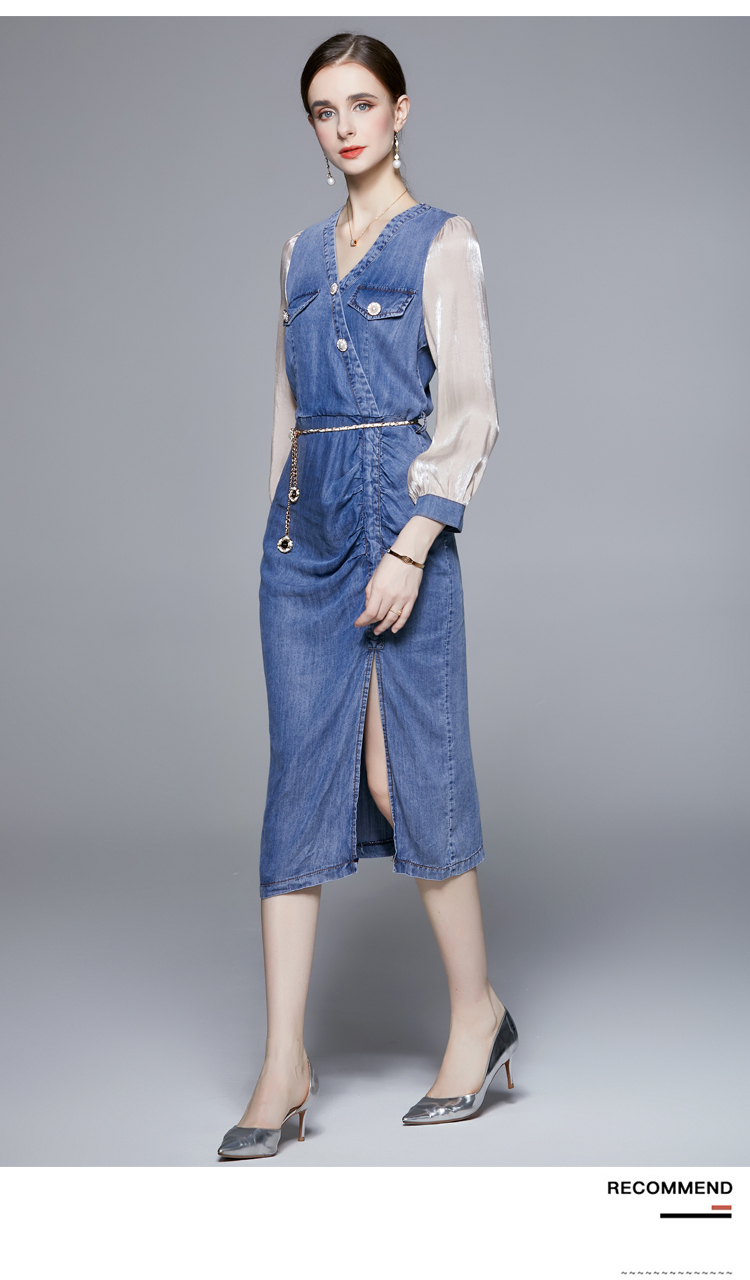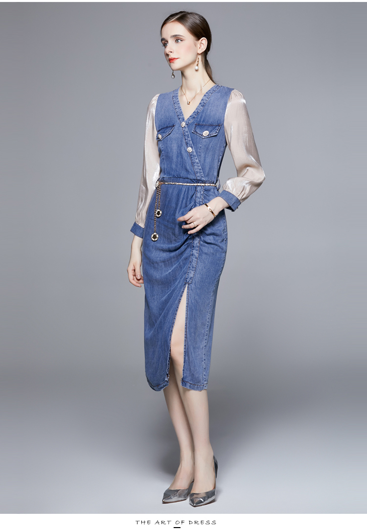 RM6170#小众设计长袖拼接天丝牛仔开叉紧身不规则连衣裙女