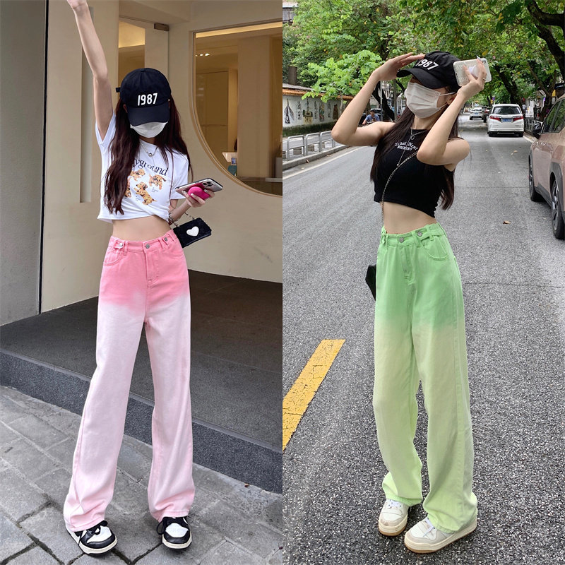 RM6686#新款渐变色高腰显瘦宽松直简拖地牛仔裤