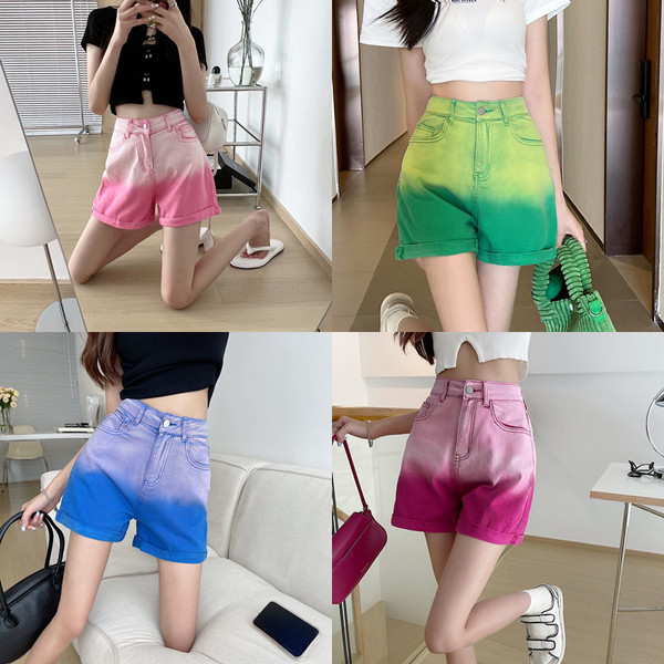 RM6689#新款女高腰显瘦晕染渐变色韩版弹力牛仔短裤