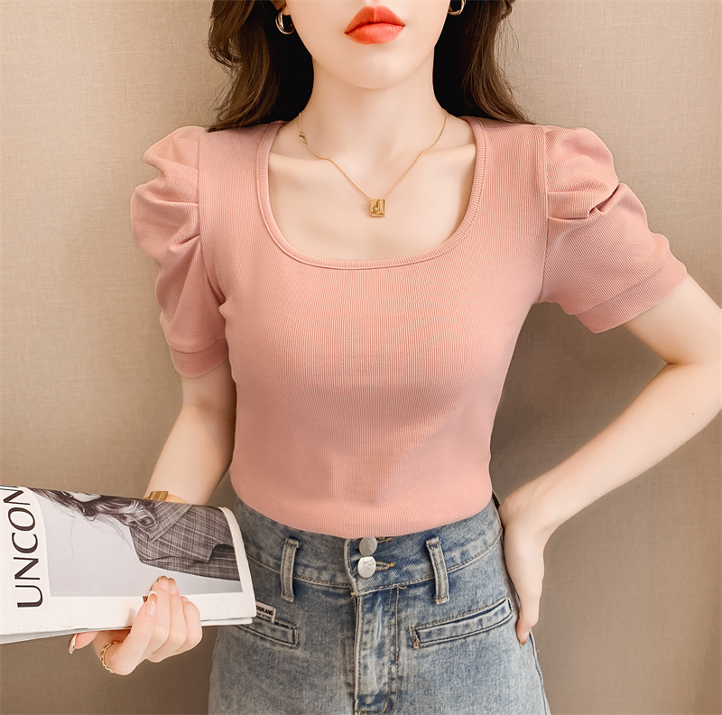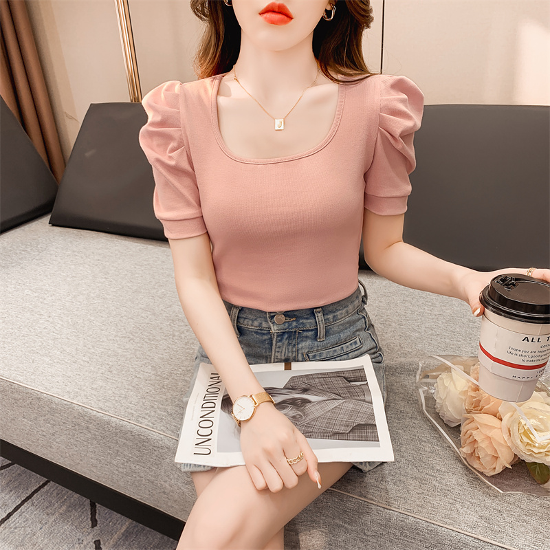 RM7038#夏新款方领泡泡袖短袖T恤女修身 洋气紧身灯笼袖短款上衣