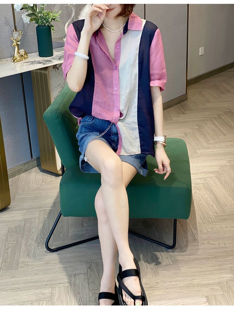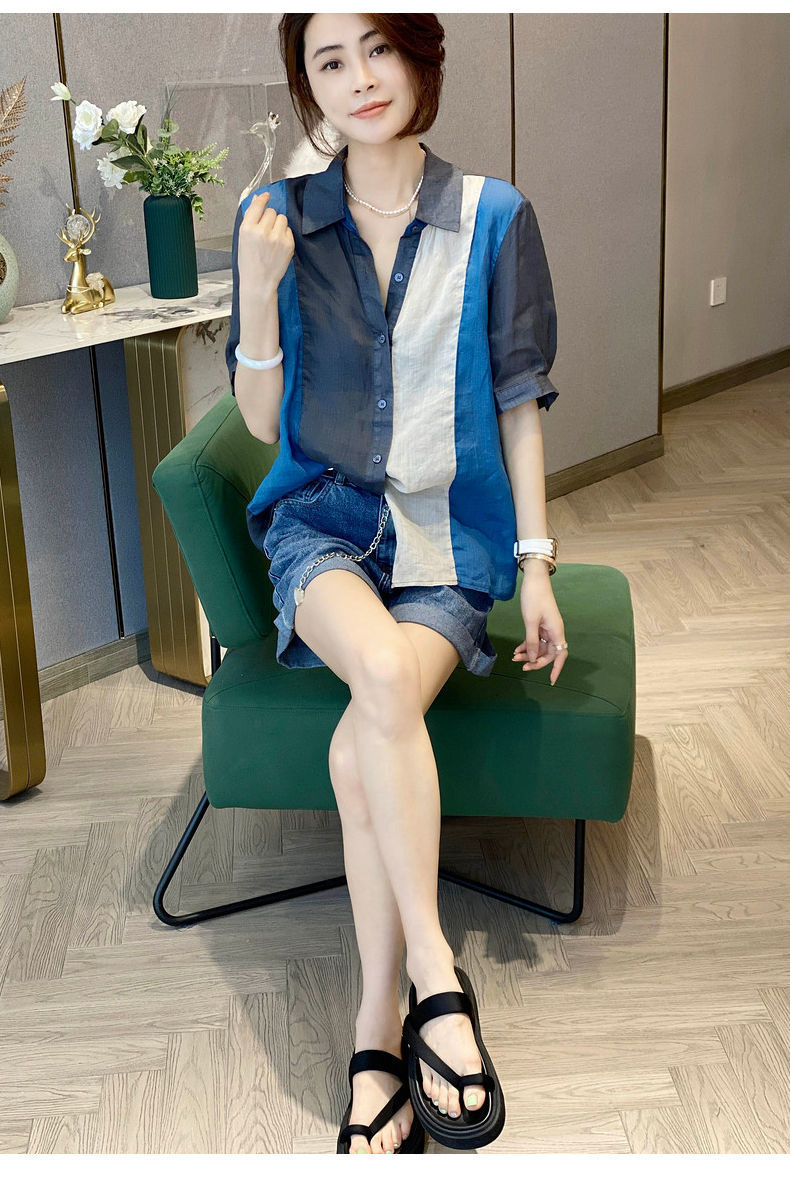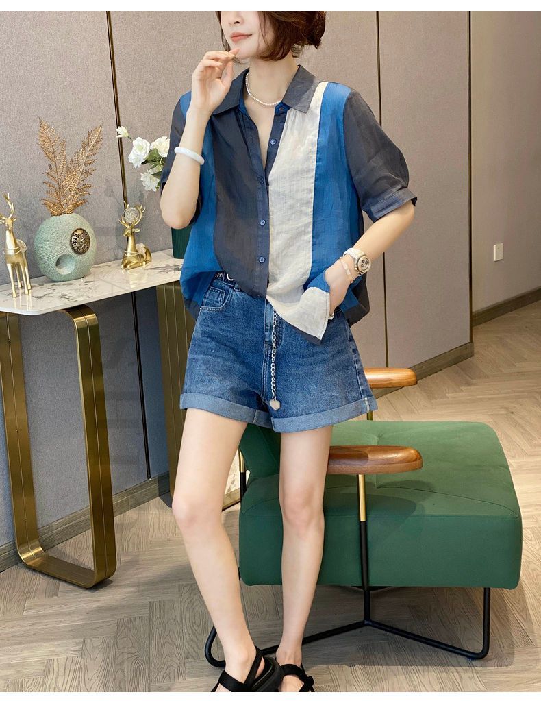 RM7143#夏季时尚新款撞色拼接短袖POLO领衬衫女小众设计感洋气上衣