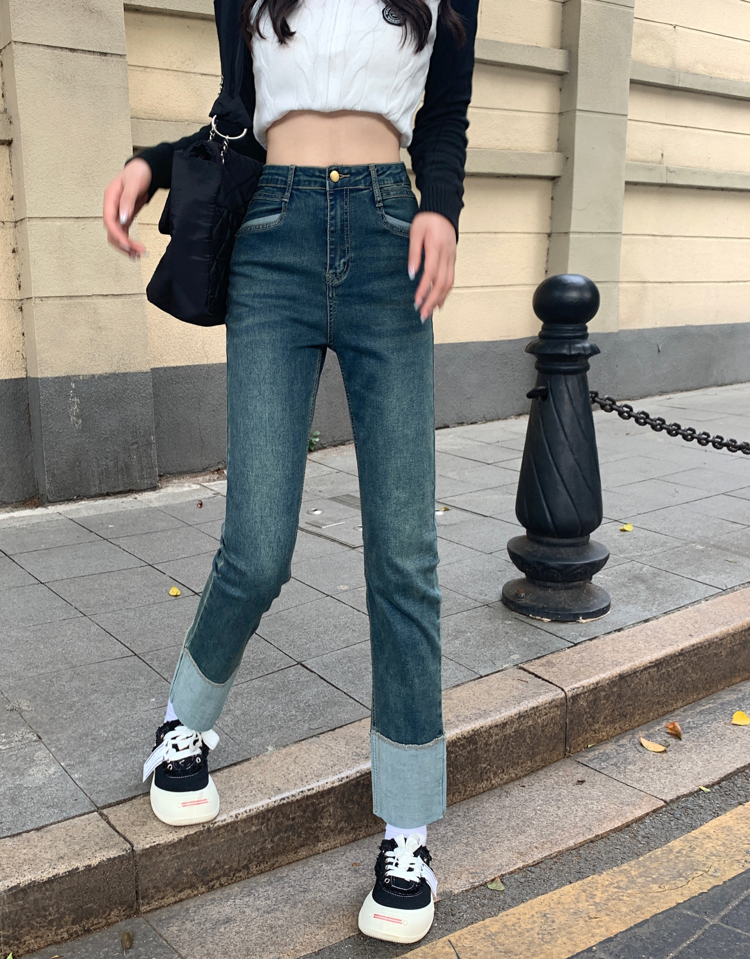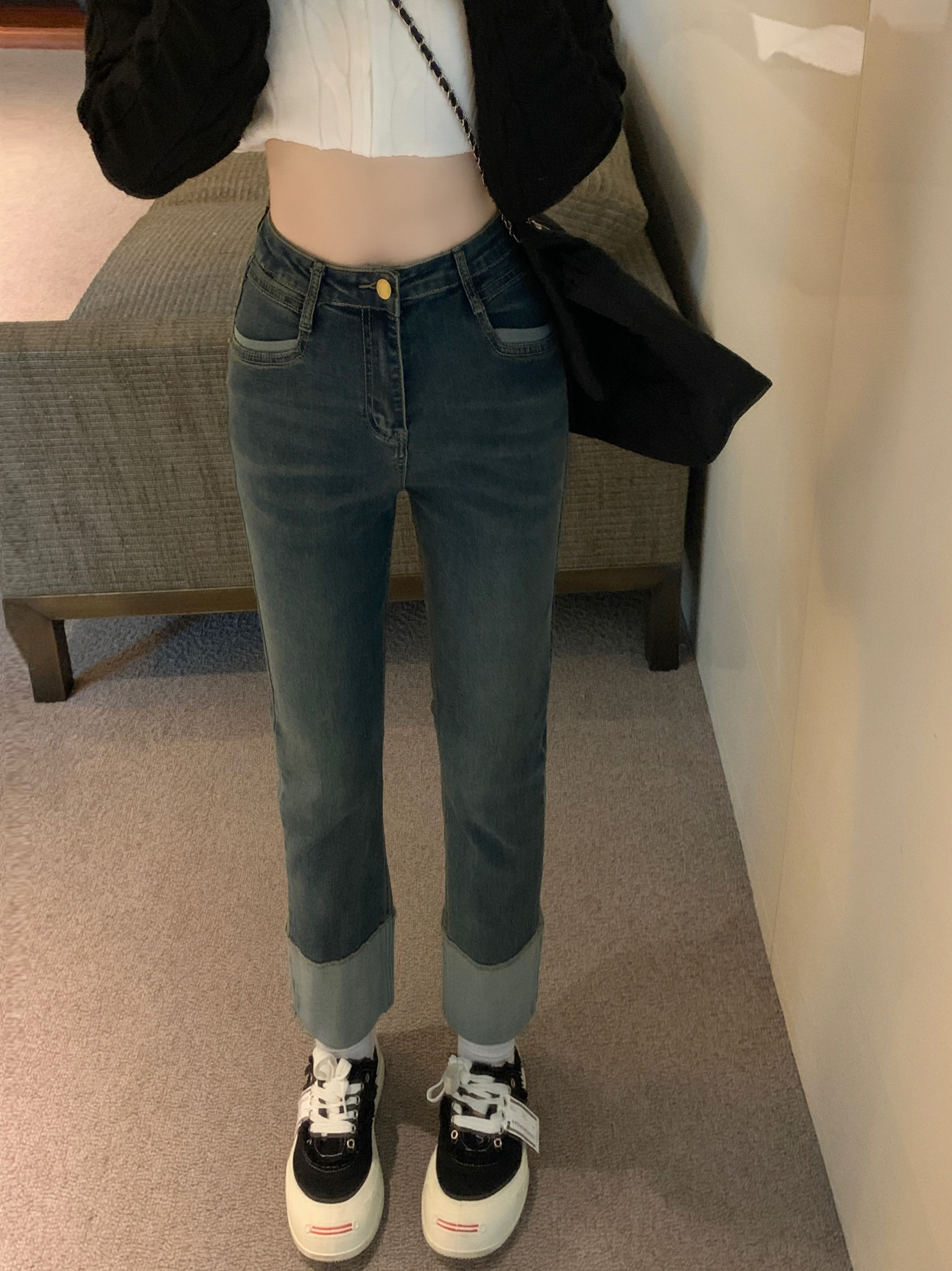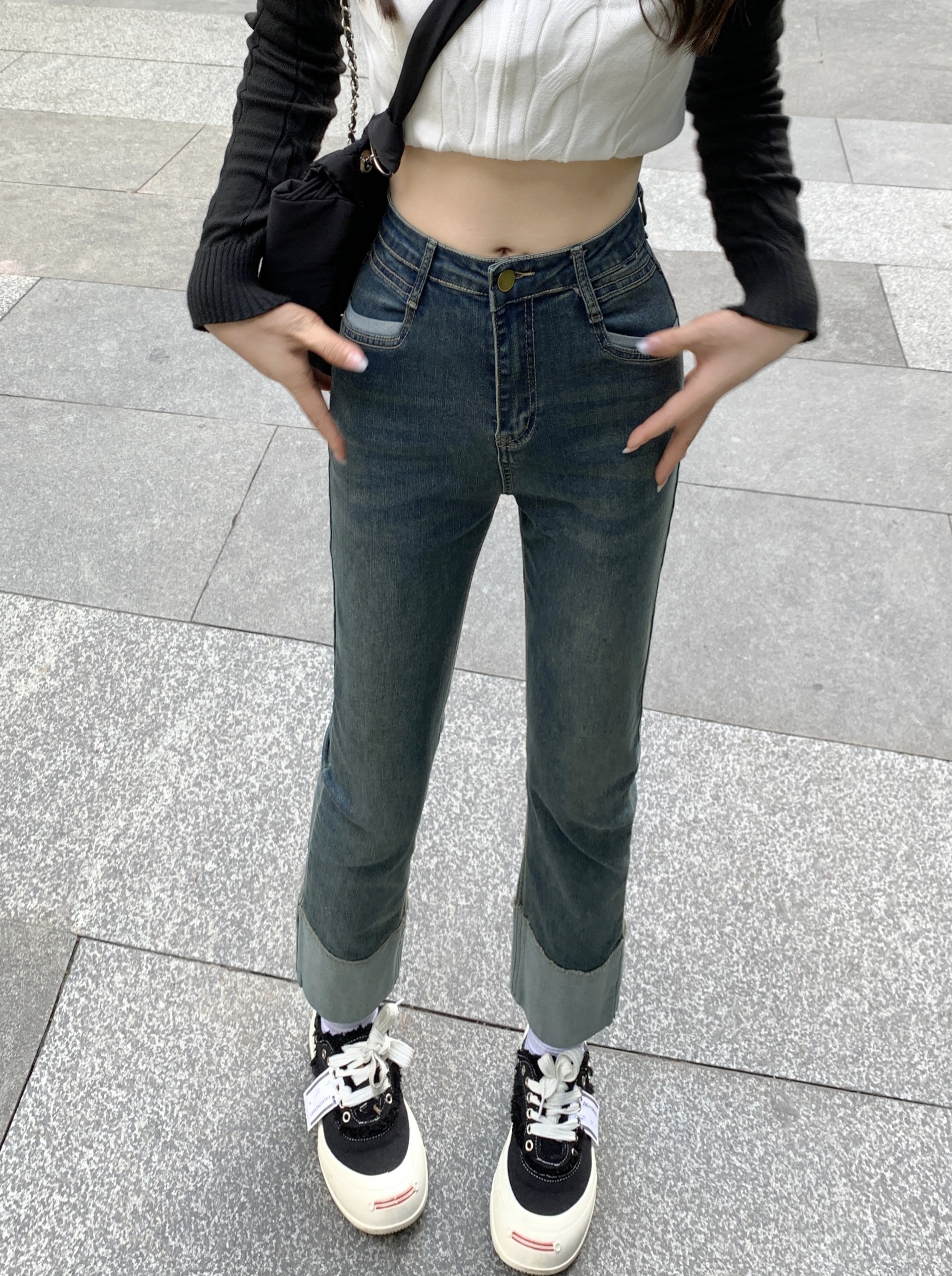 RM7321#高腰复古烟管直筒牛仔裤女宽松设计感2023春款拼接九分裤