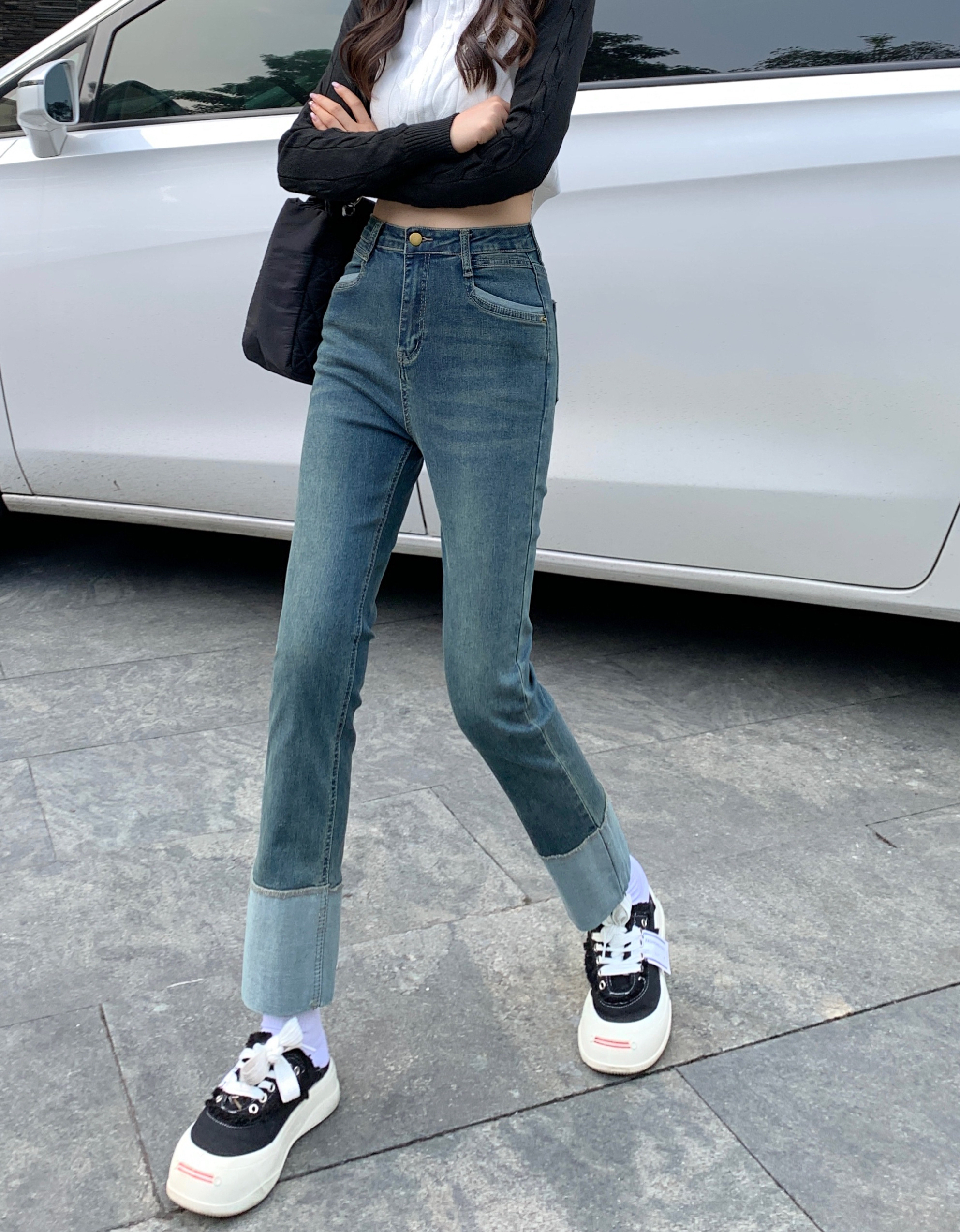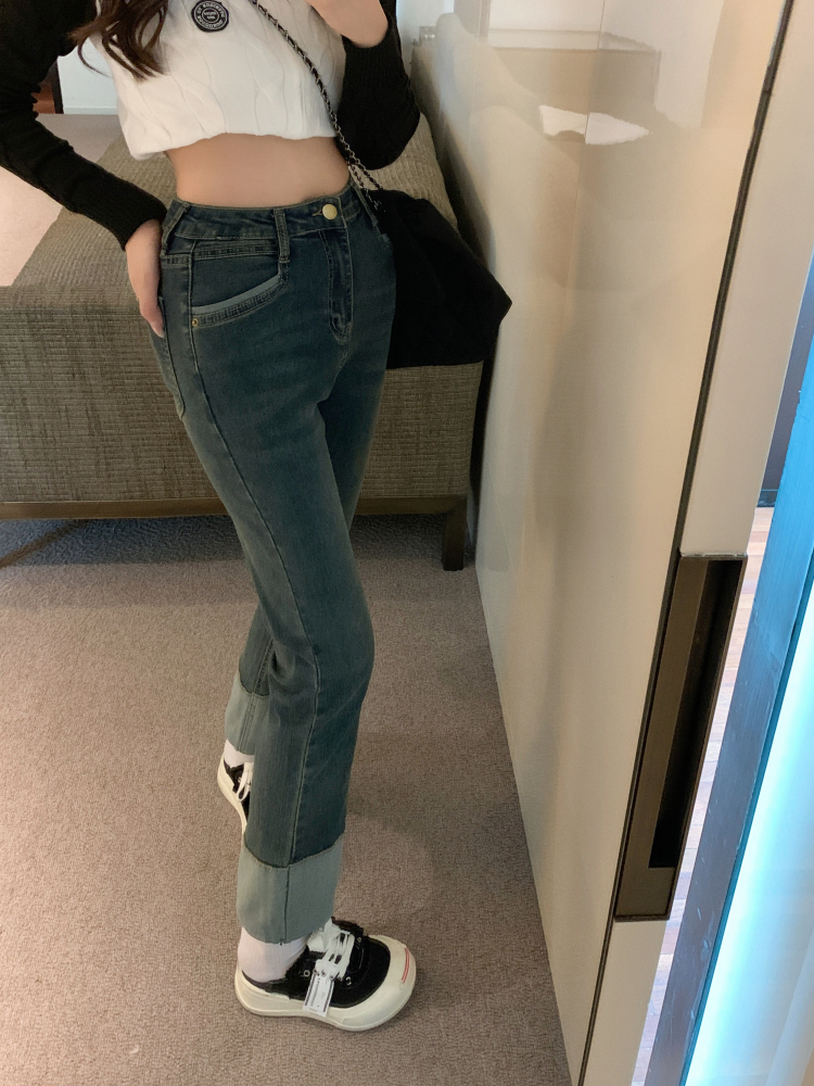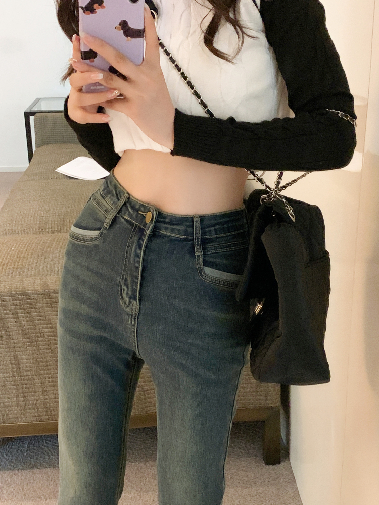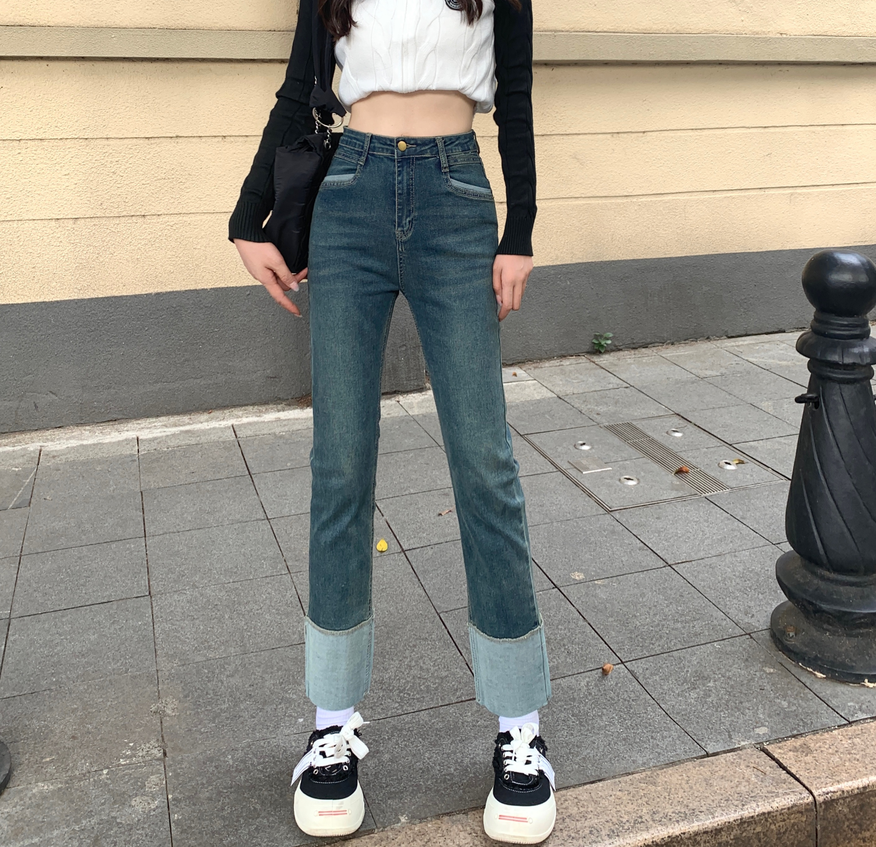 RM7321#高腰复古烟管直筒牛仔裤女宽松设计感2023春款拼接九分裤