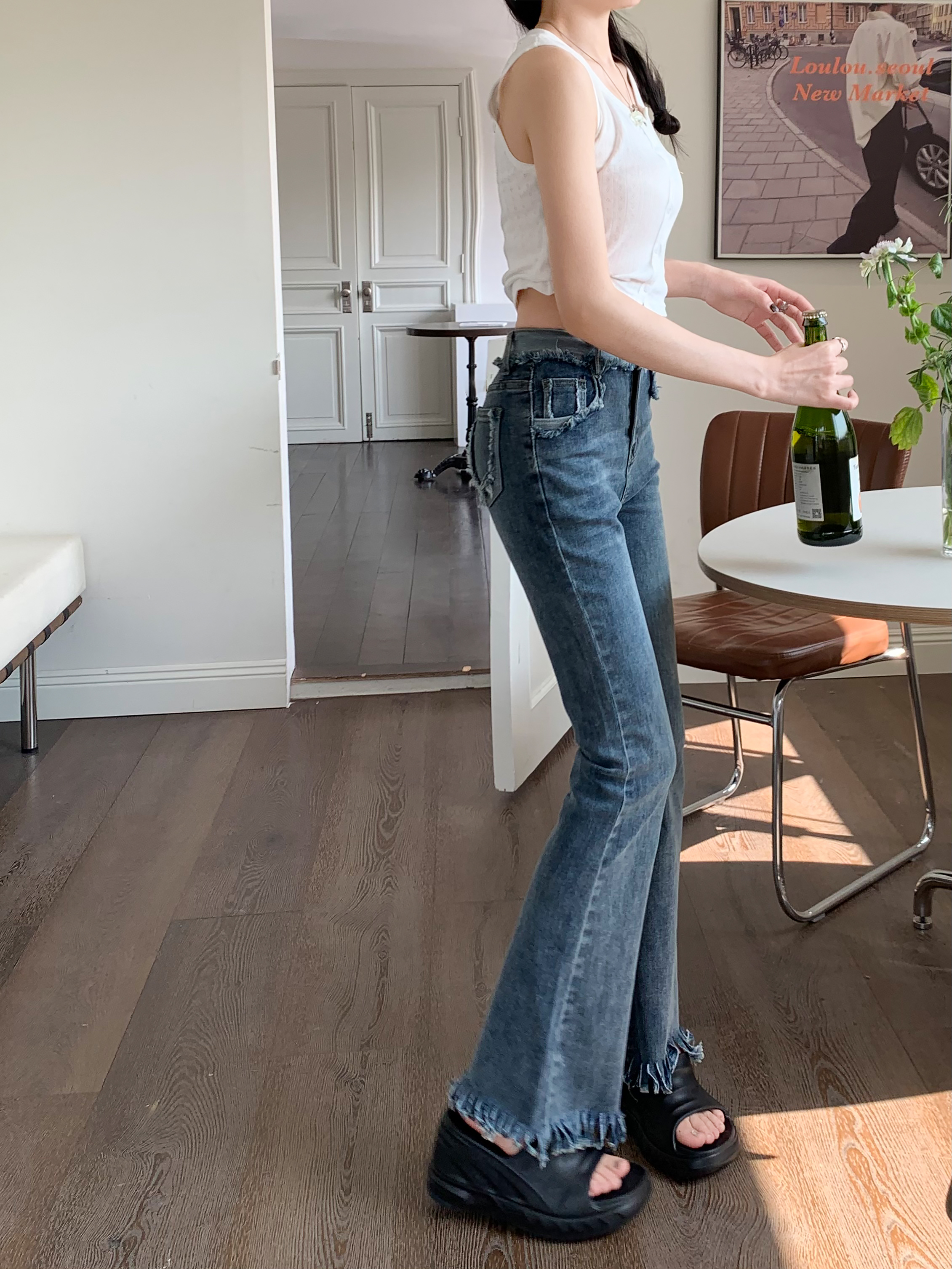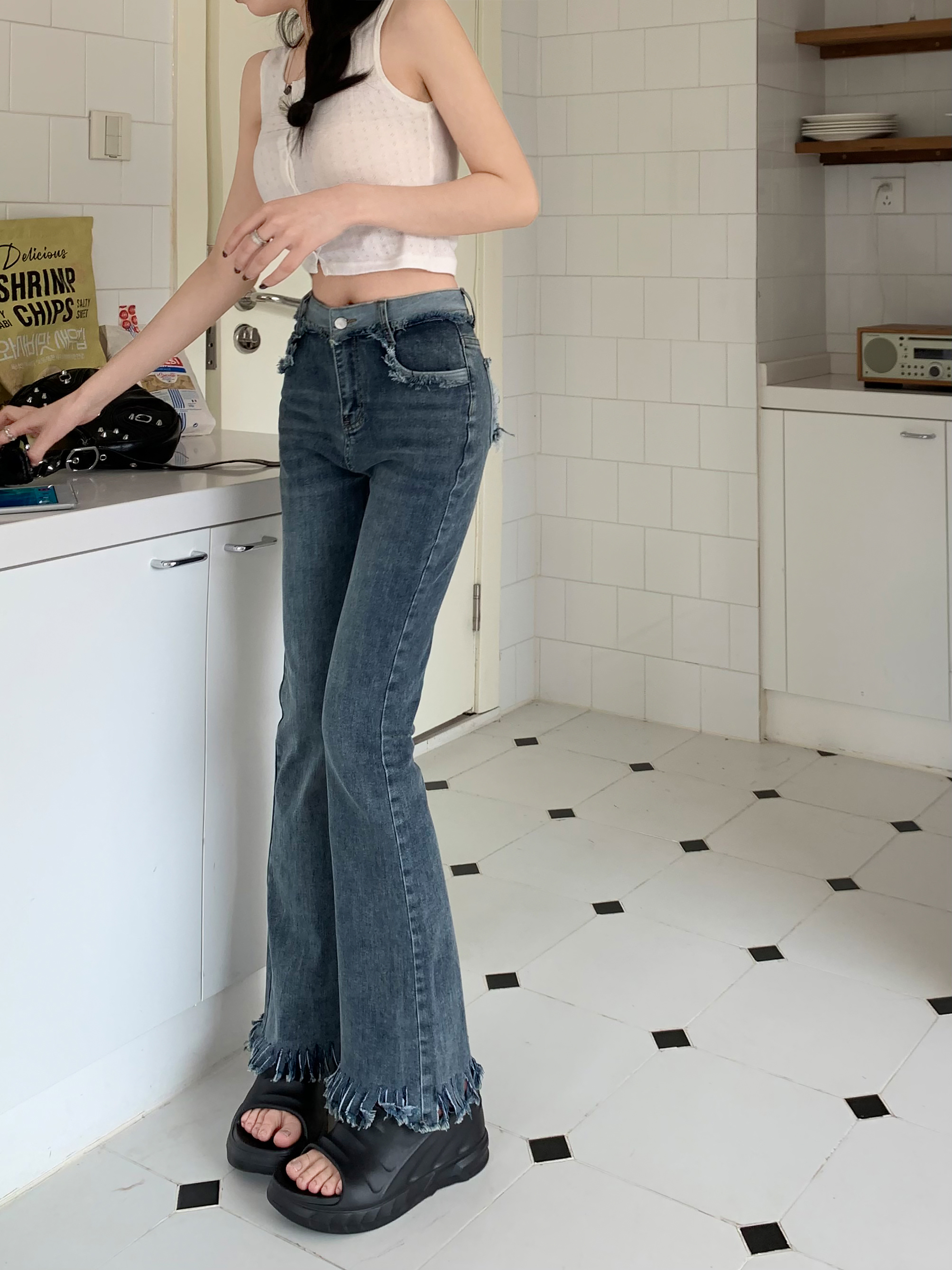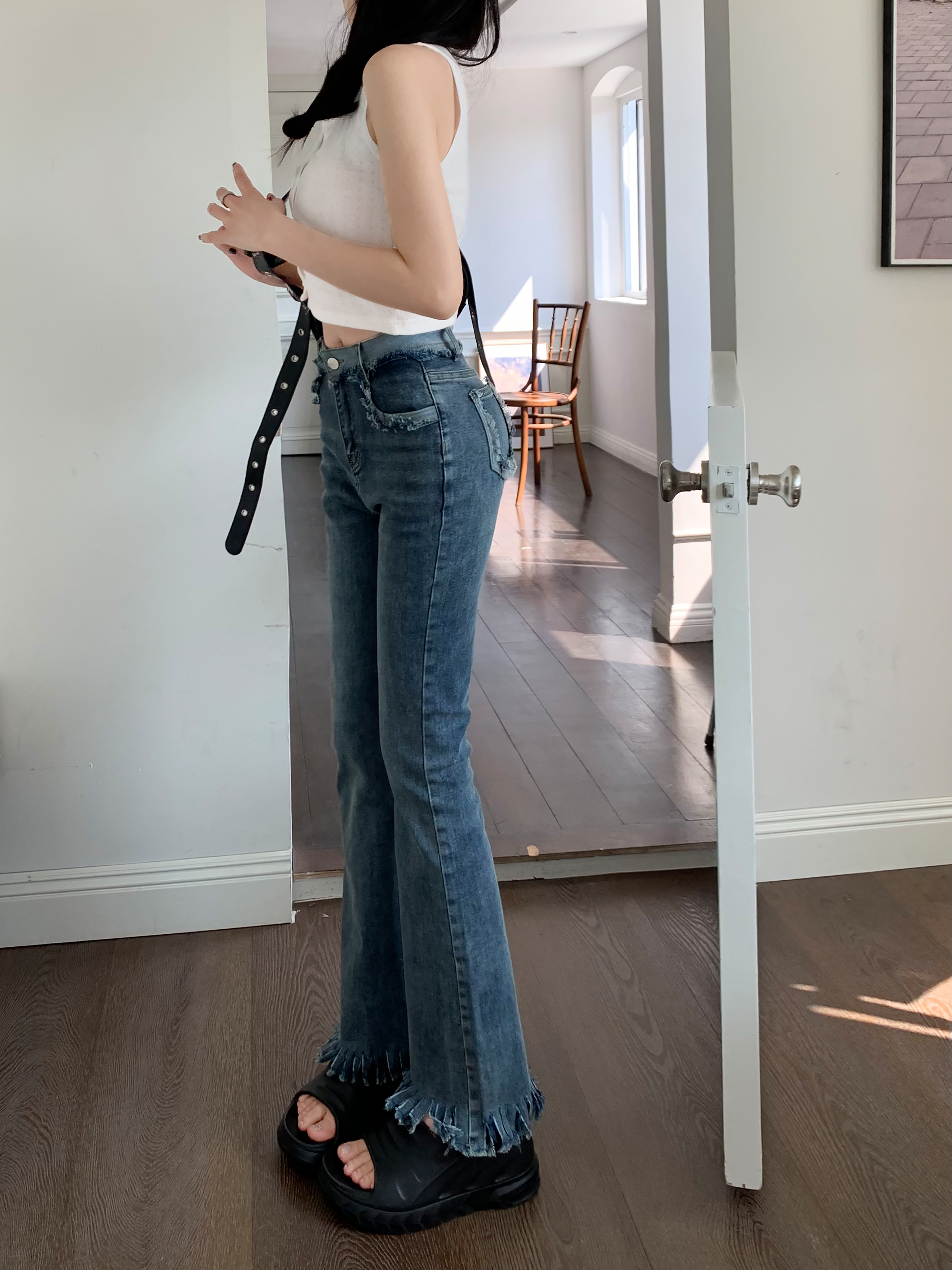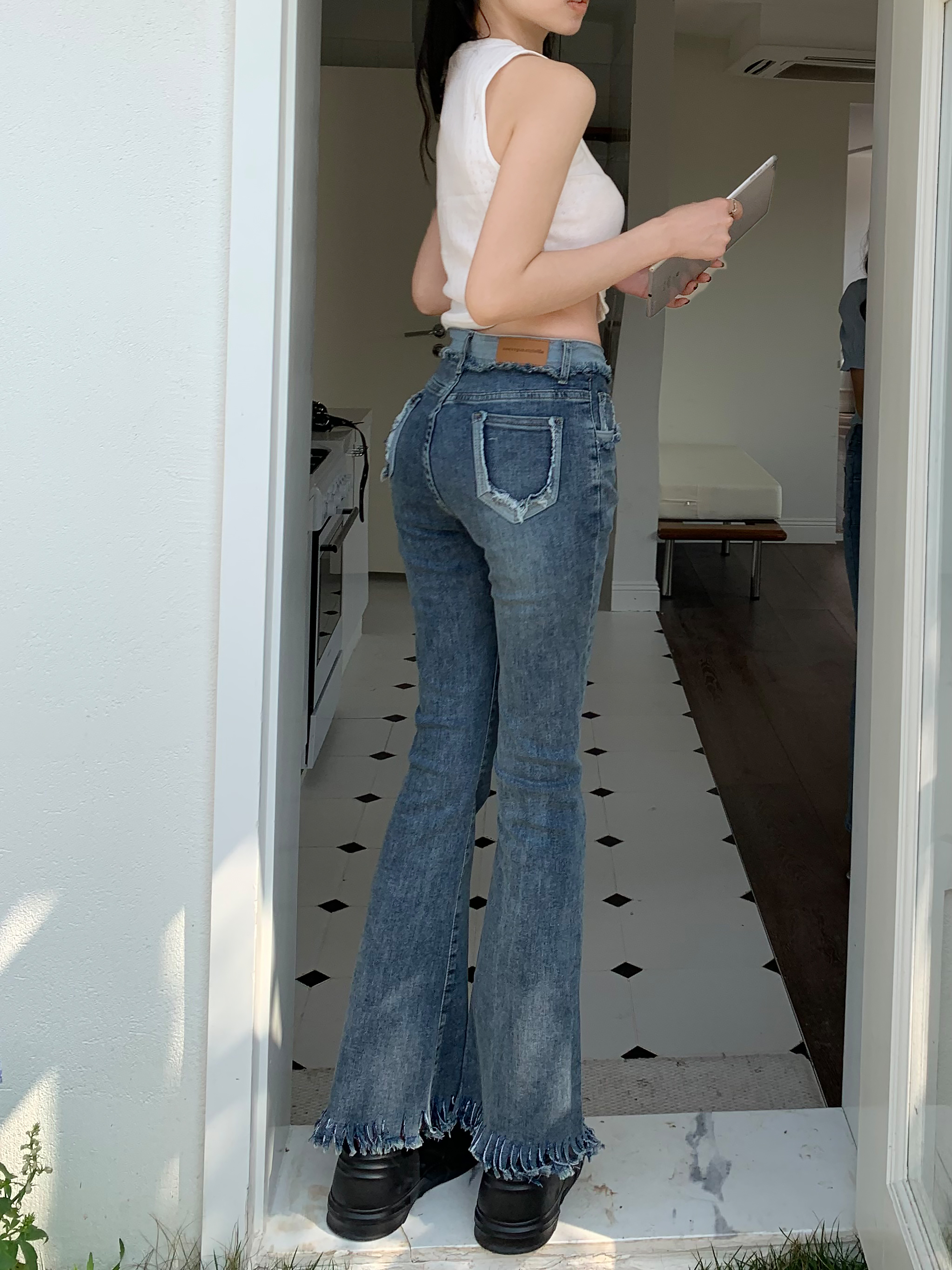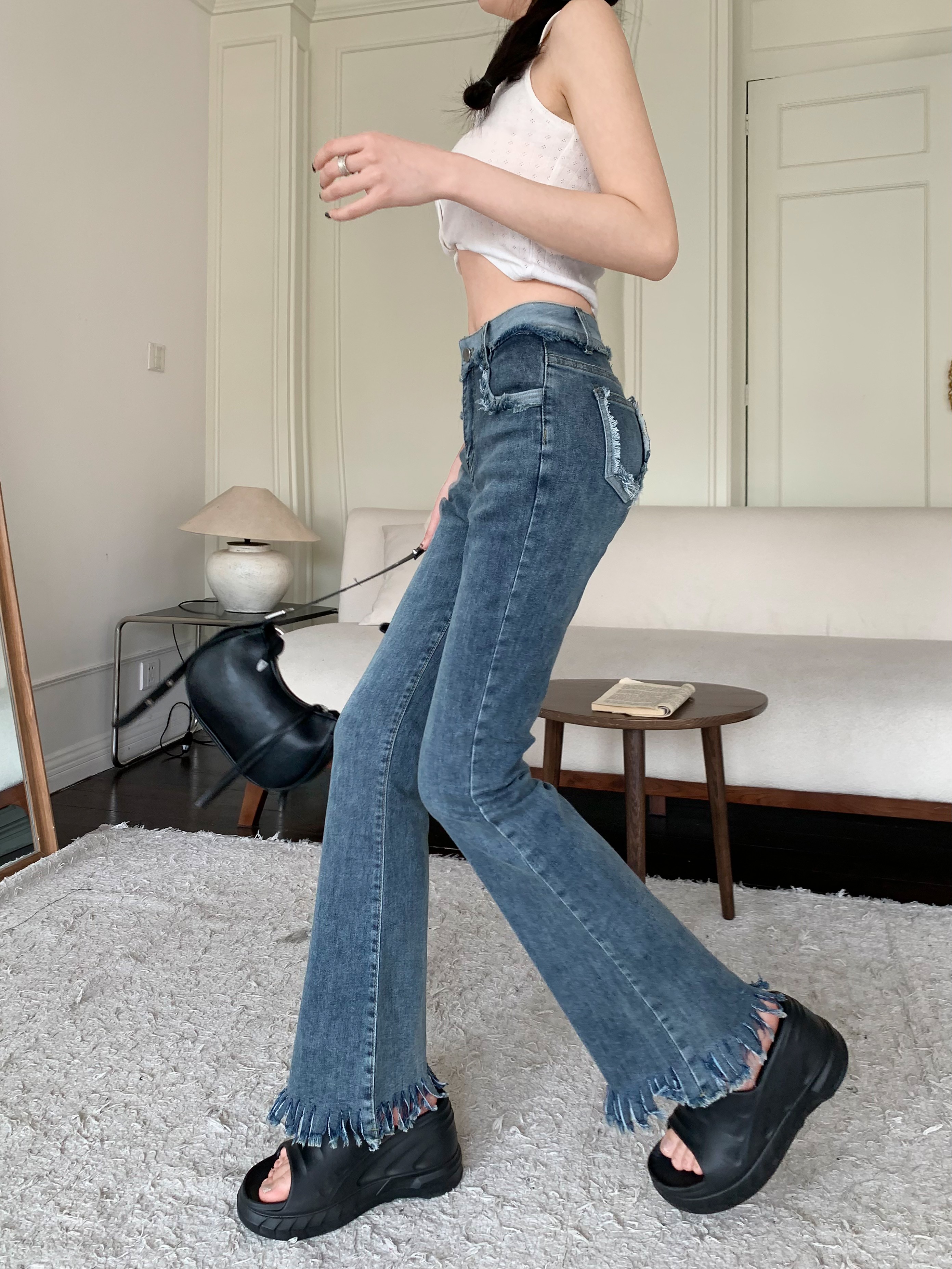 RM7322#复古流苏喇叭裤子2023新款春装高腰显瘦马蹄裤微喇牛仔长裤