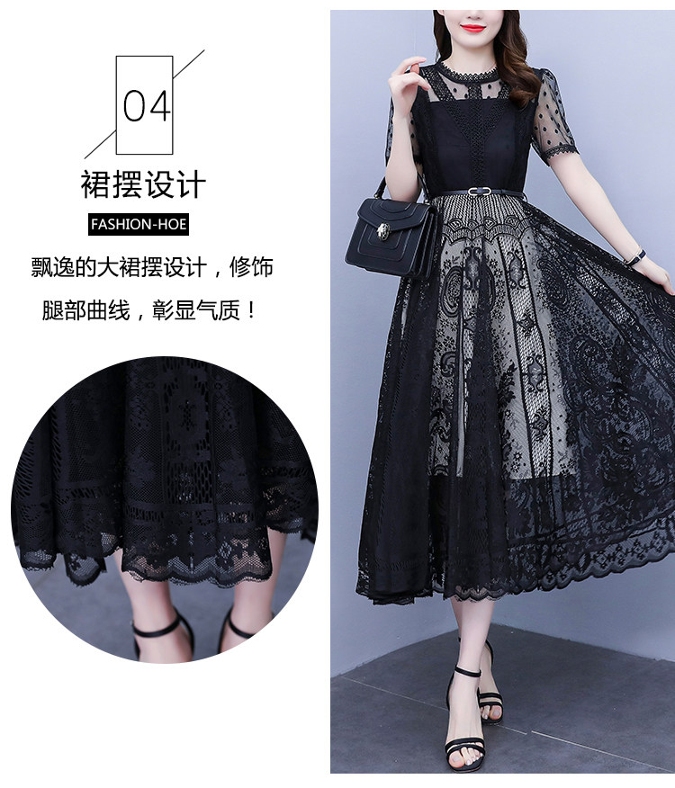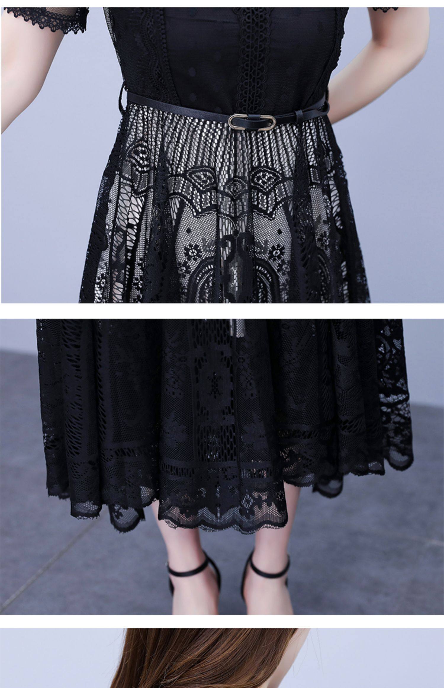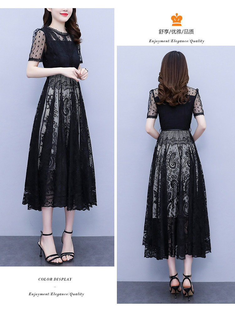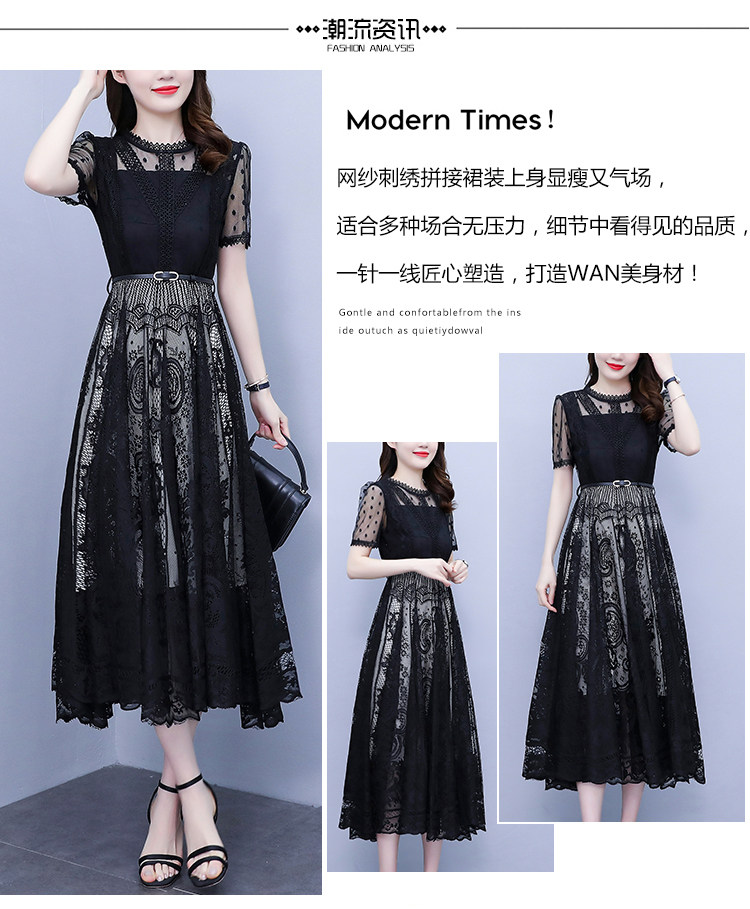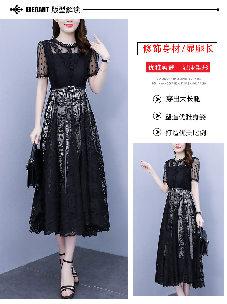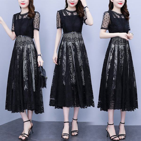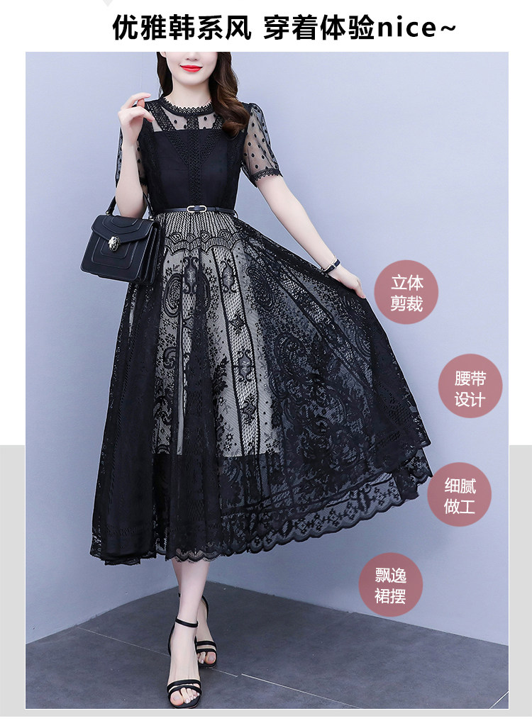 RM7353#夏装新款韩版大码胖mm显瘦法式减龄蕾丝拼接连衣裙小黑裙