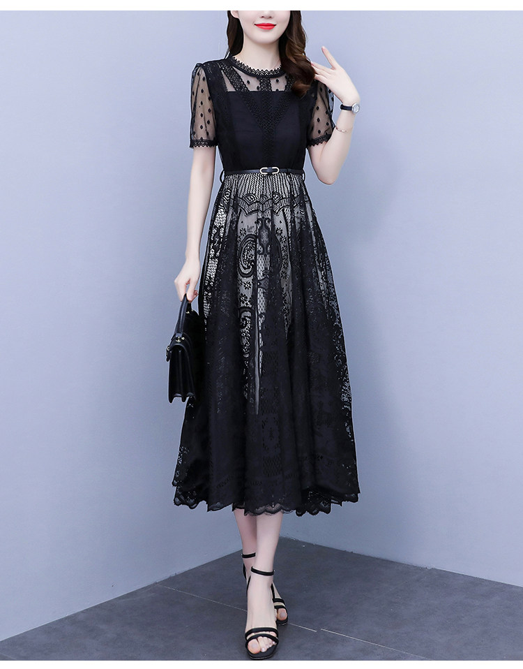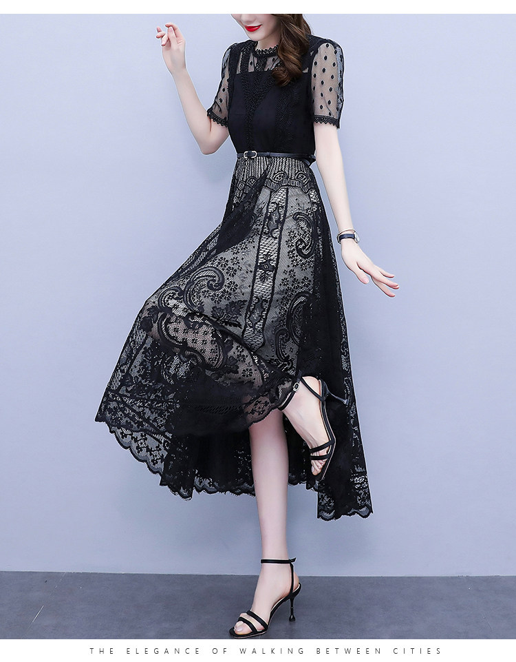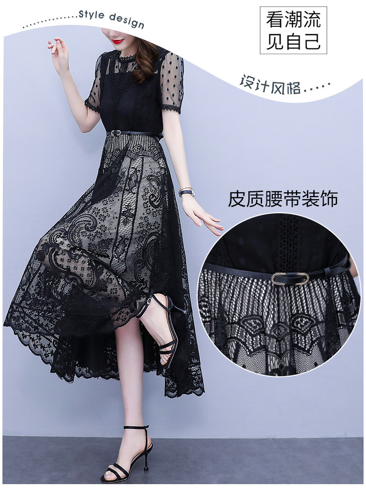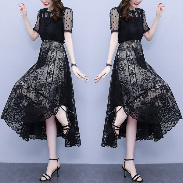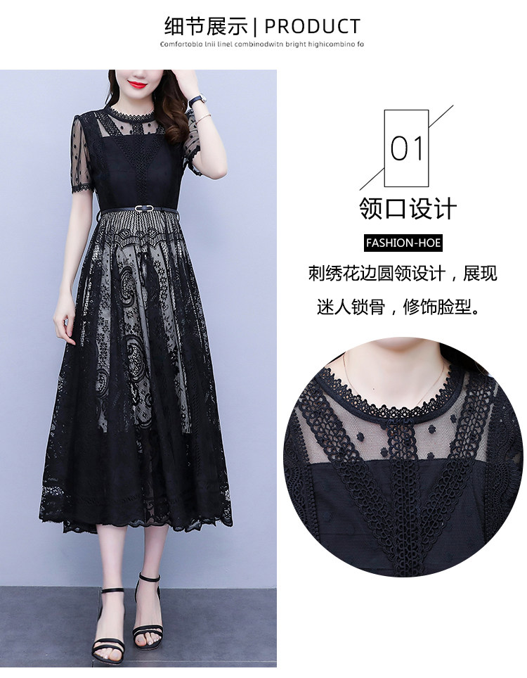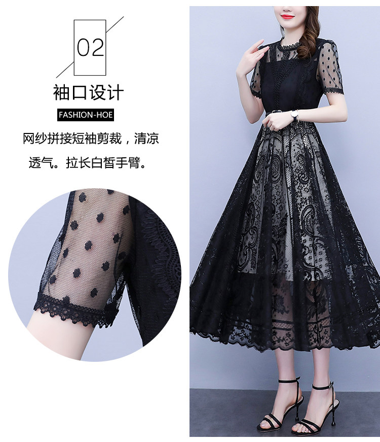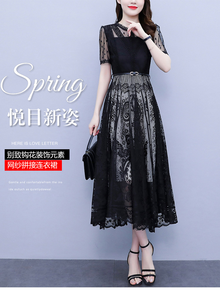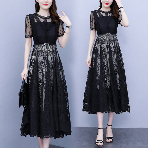RM7353#夏装新款韩版大码胖mm显瘦法式减龄蕾丝拼接连衣裙小黑裙