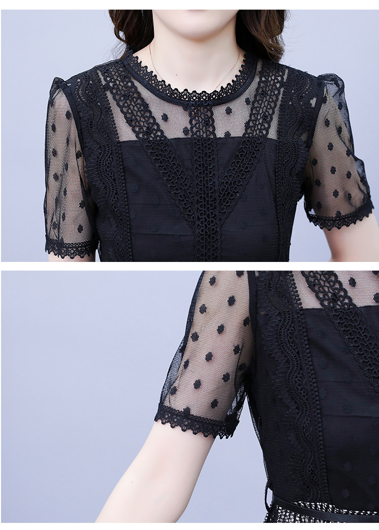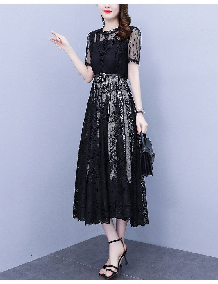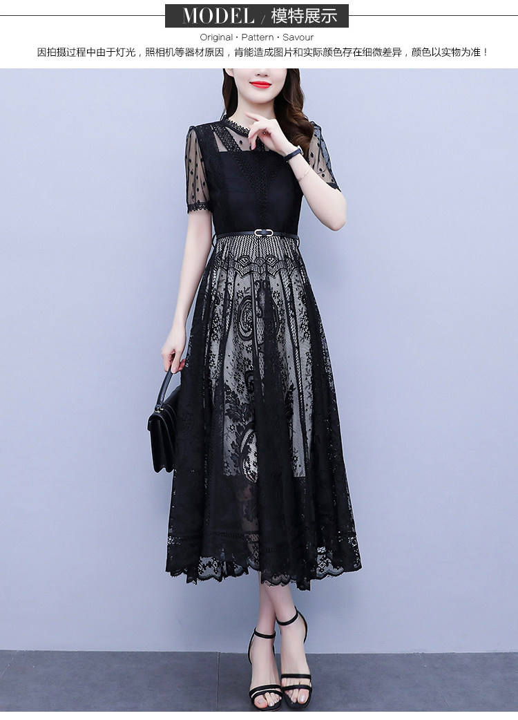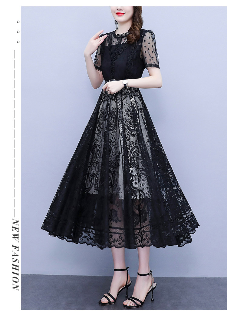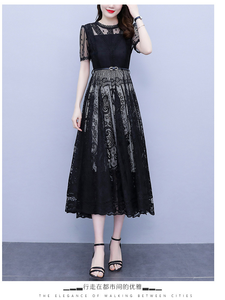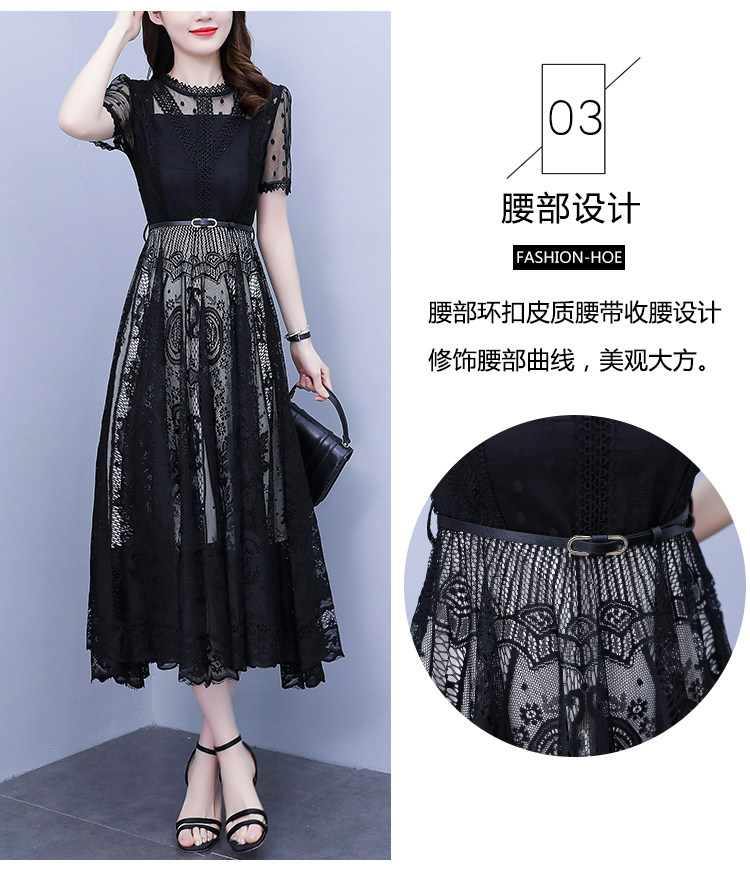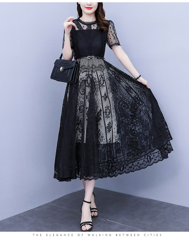 RM7353#夏装新款韩版大码胖mm显瘦法式减龄蕾丝拼接连衣裙小黑裙