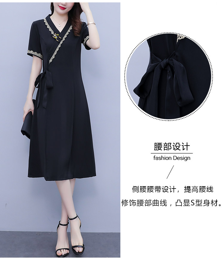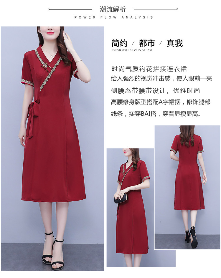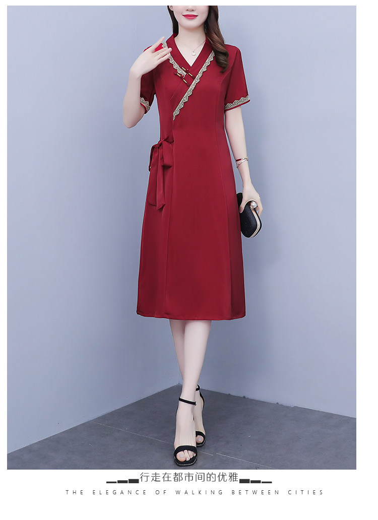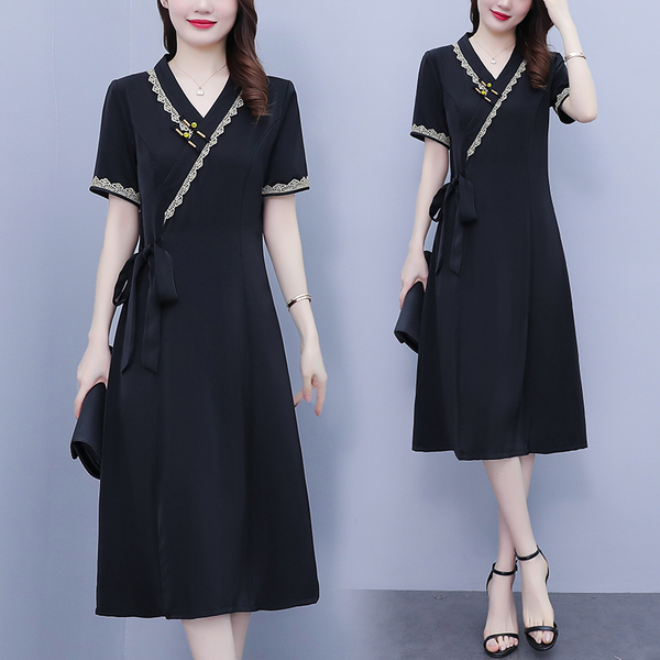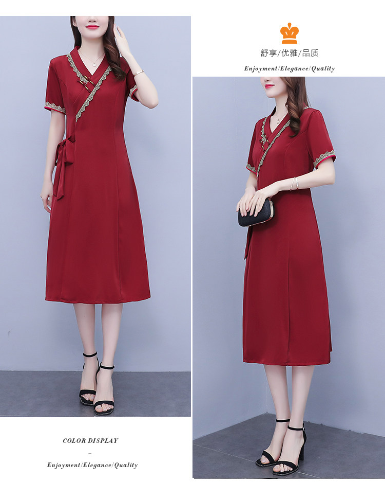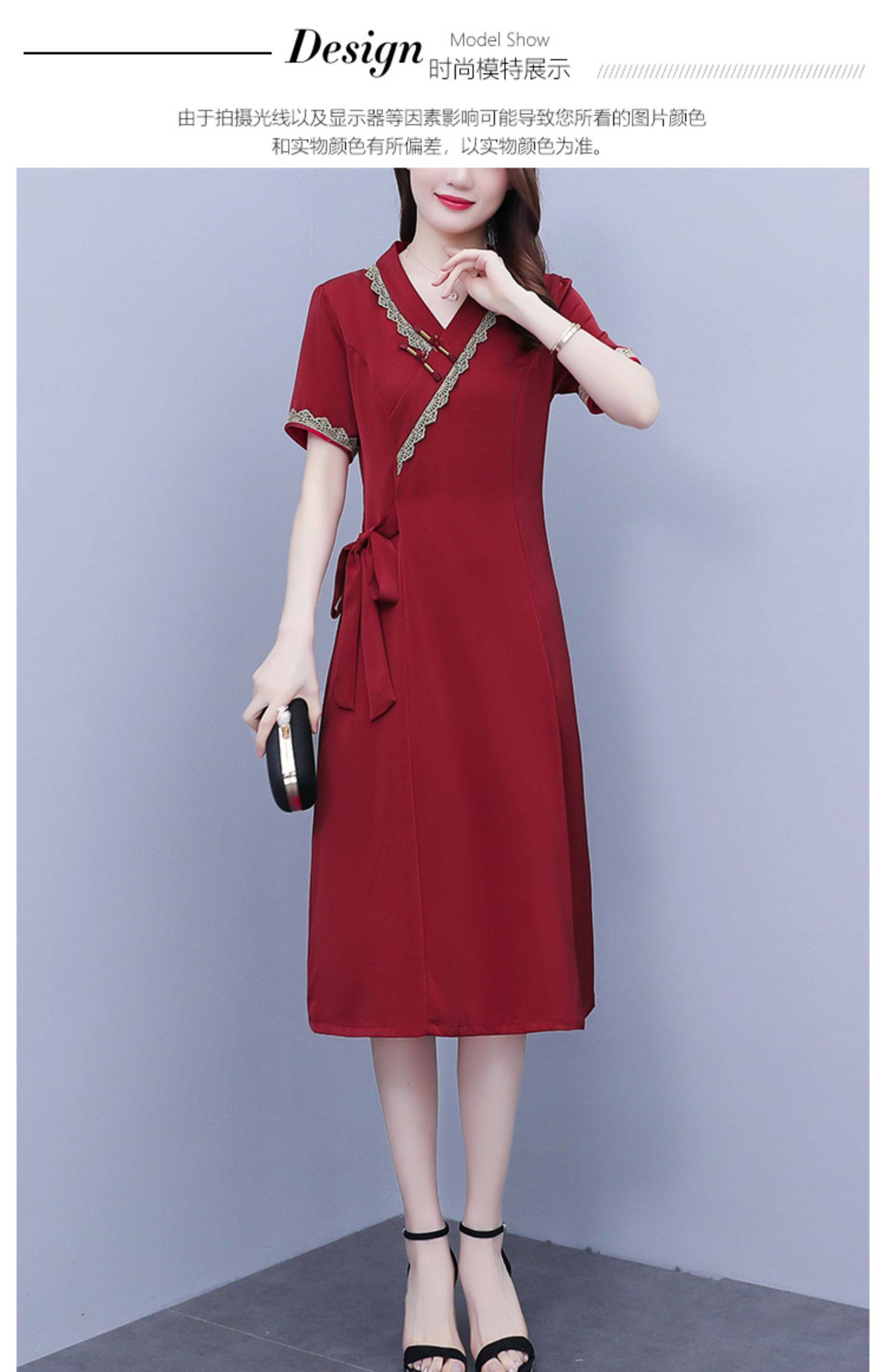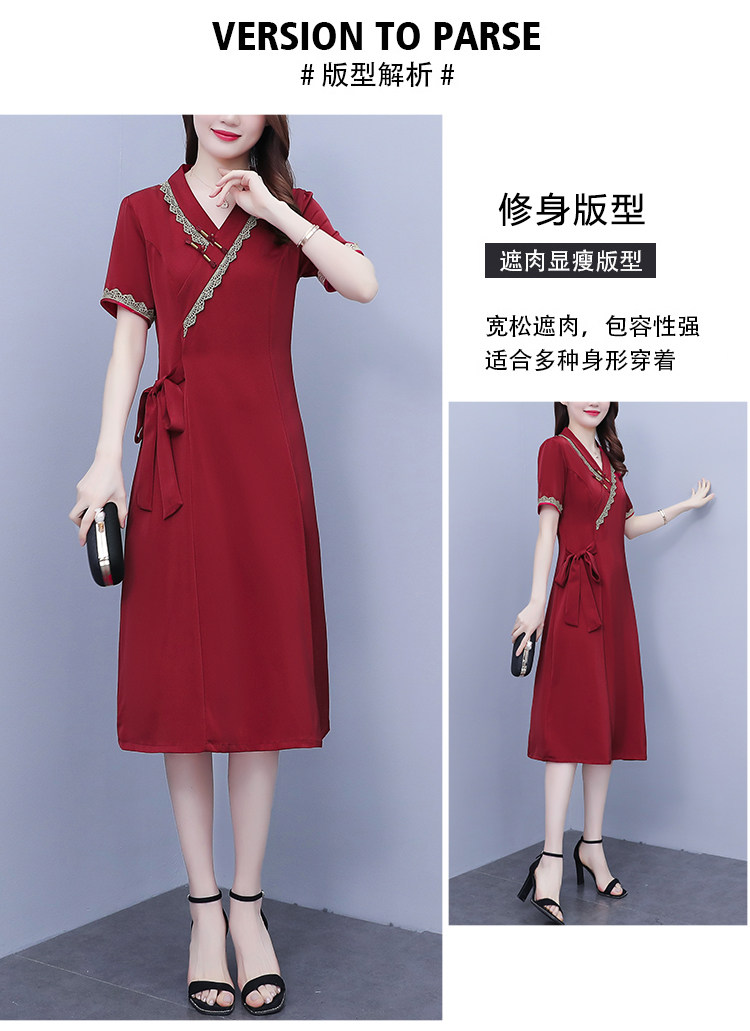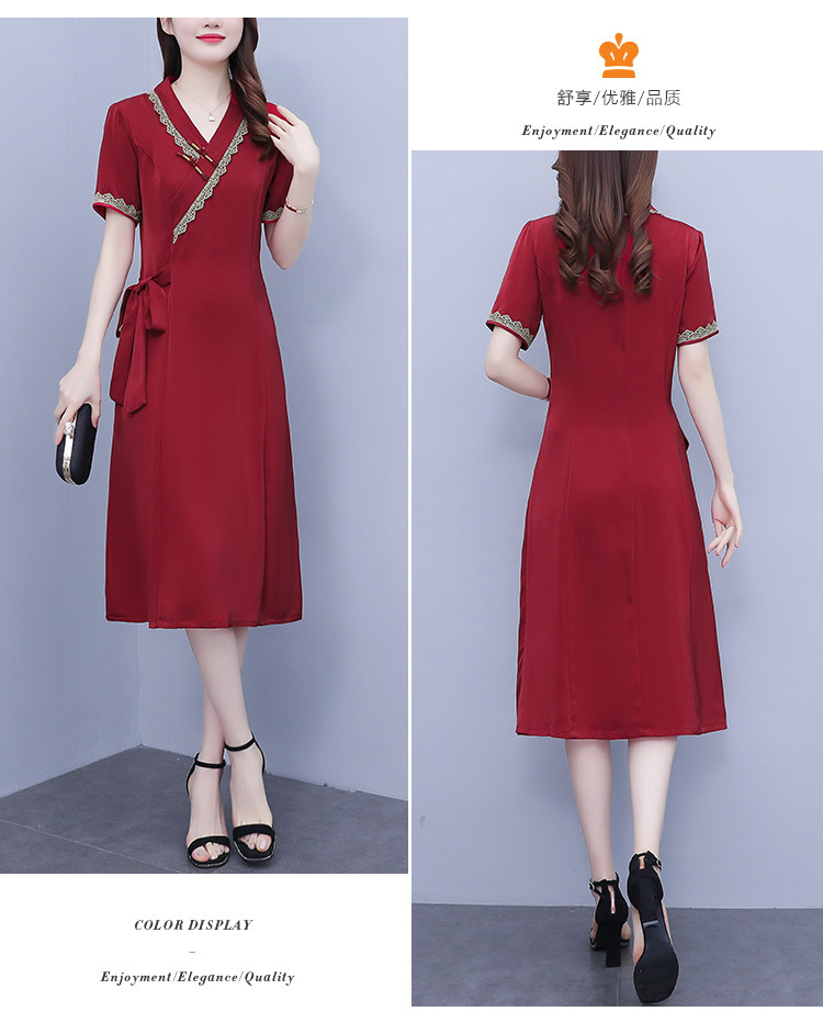 RM7371#新款复古醋酸旗袍改良版V领收腰显瘦气质大裙摆连衣裙