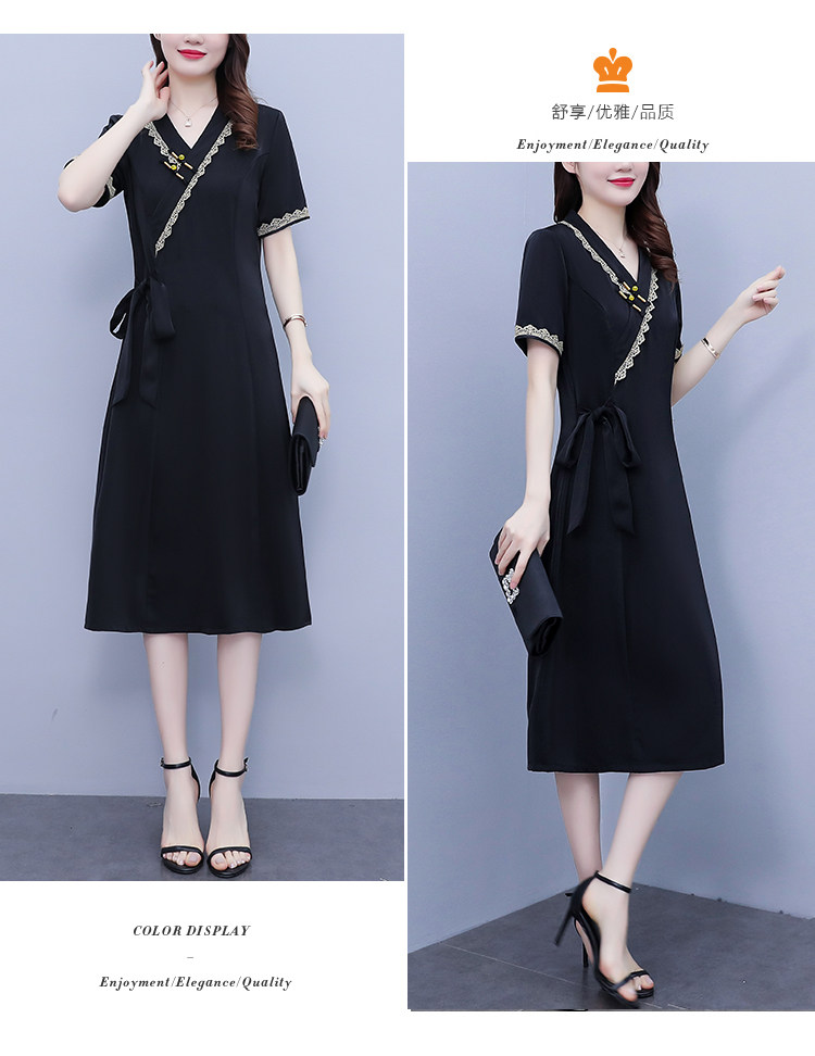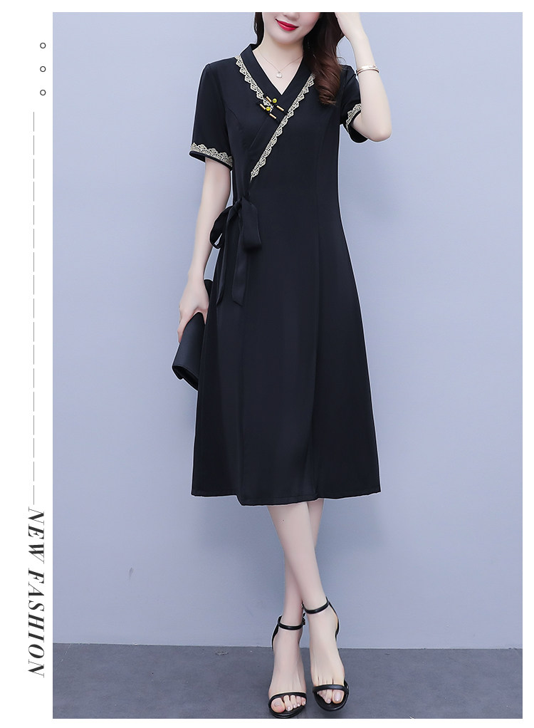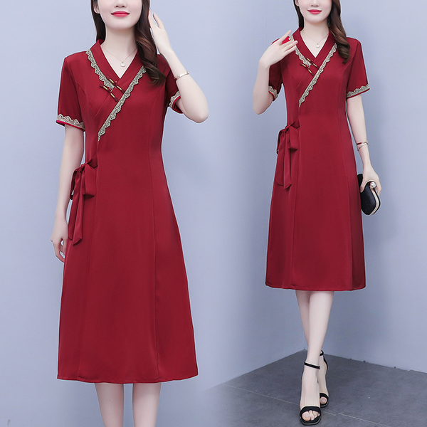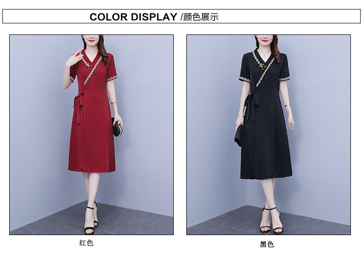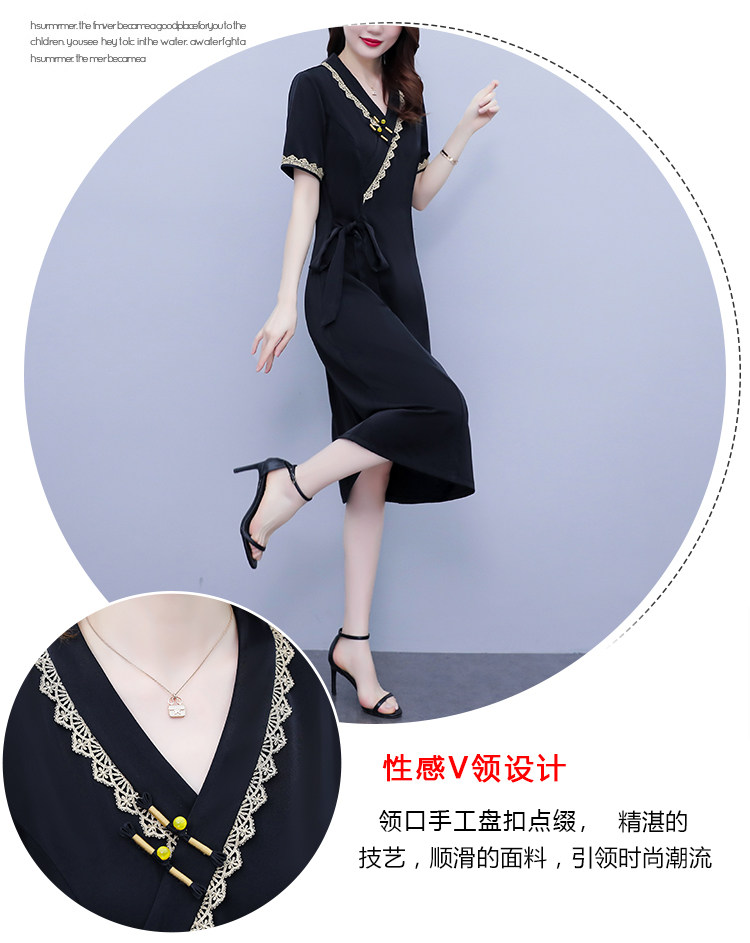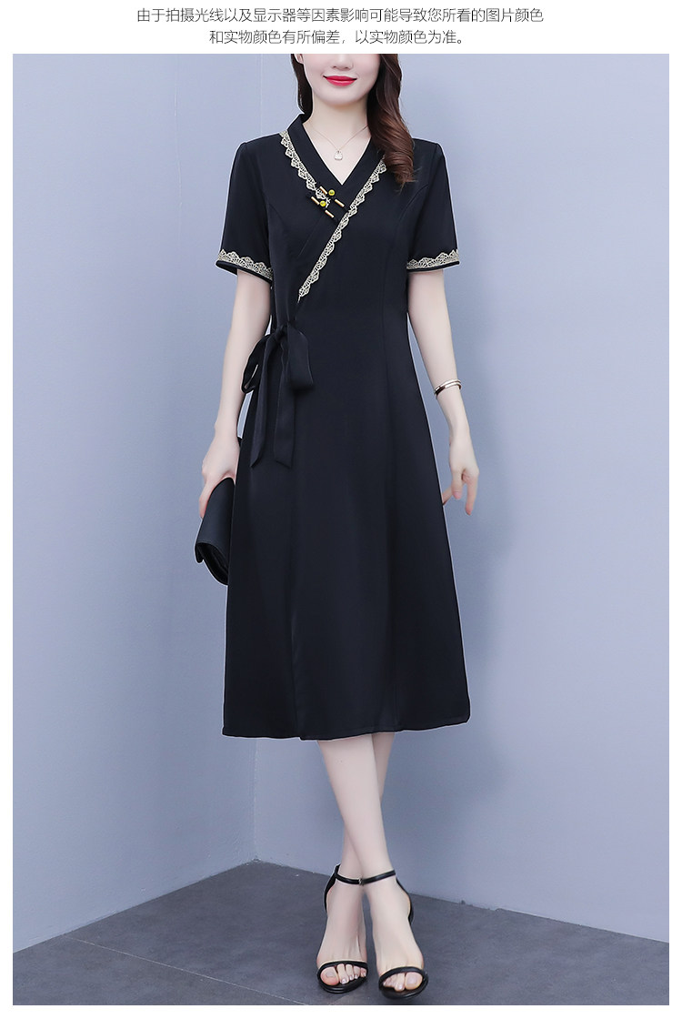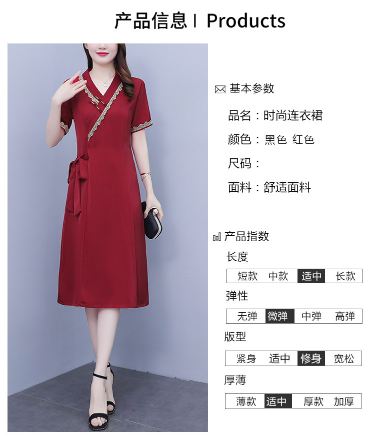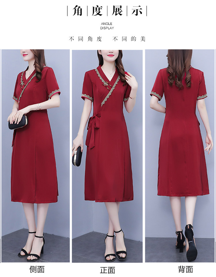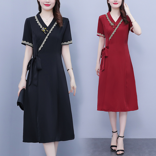 RM7371#新款复古醋酸旗袍改良版V领收腰显瘦气质大裙摆连衣裙