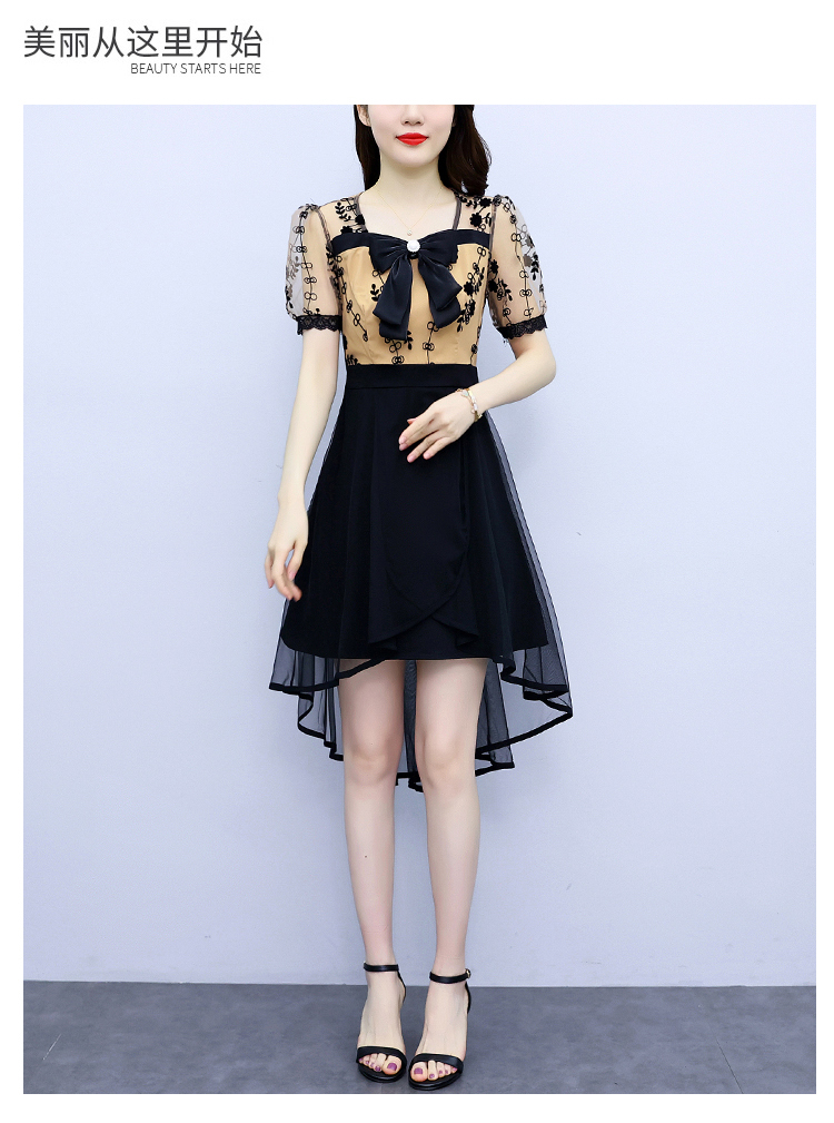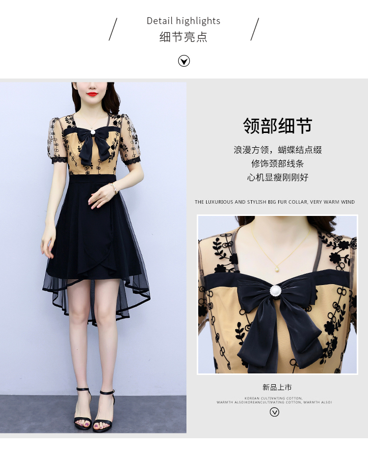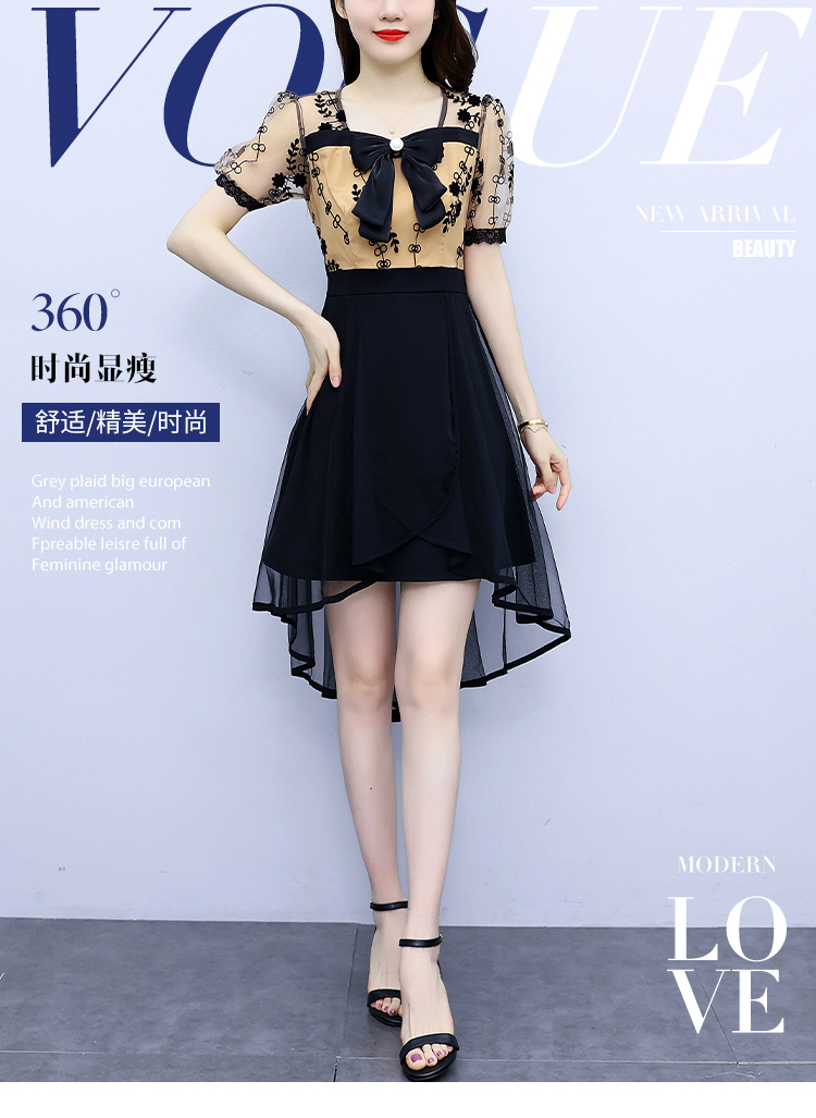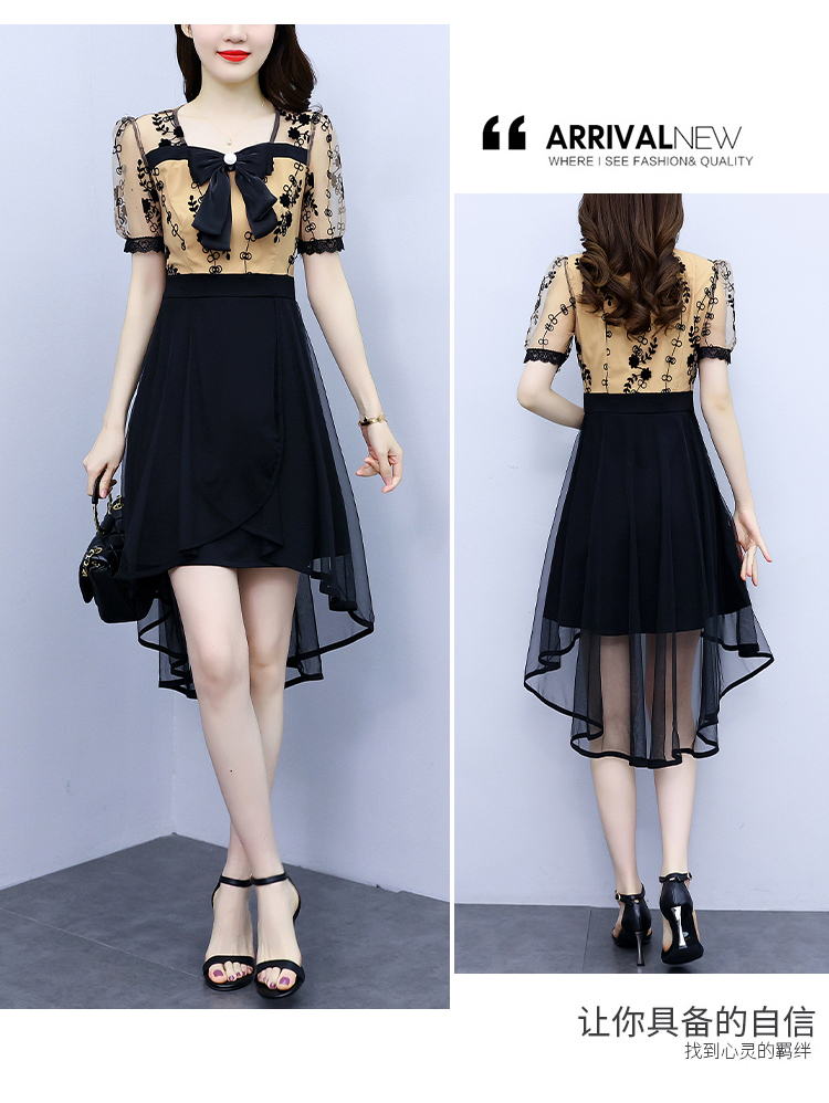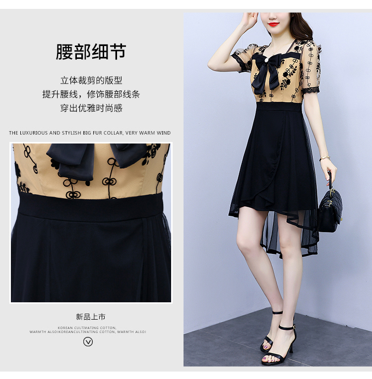 RM7389#大码女装2023夏季新款韩版修身显瘦蝴蝶结网纱拼接遮肉连衣裙
