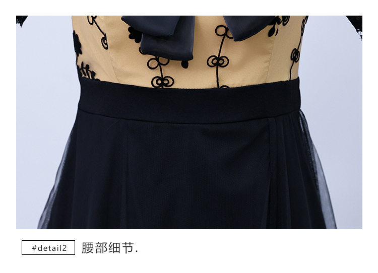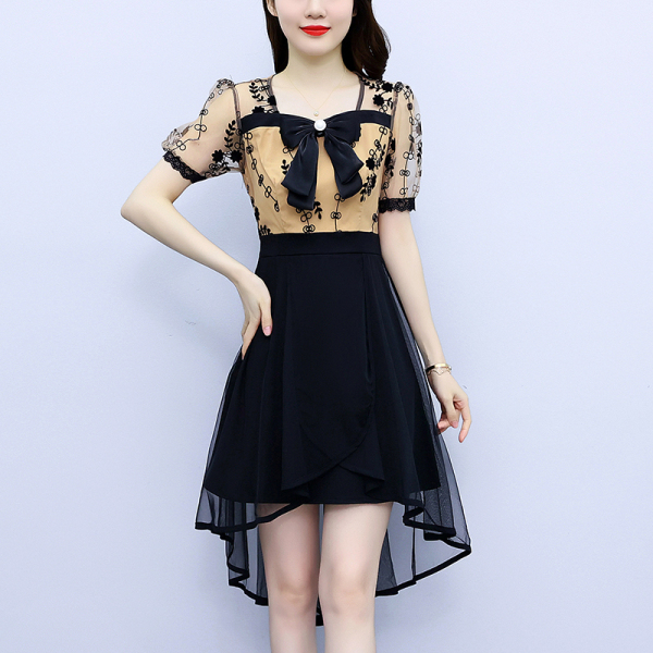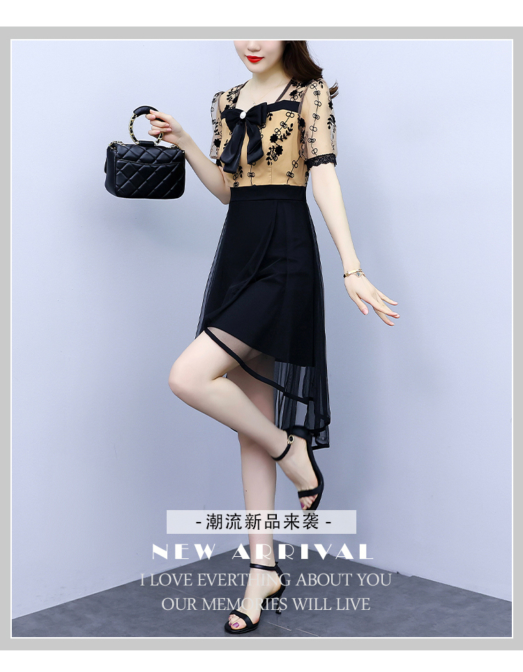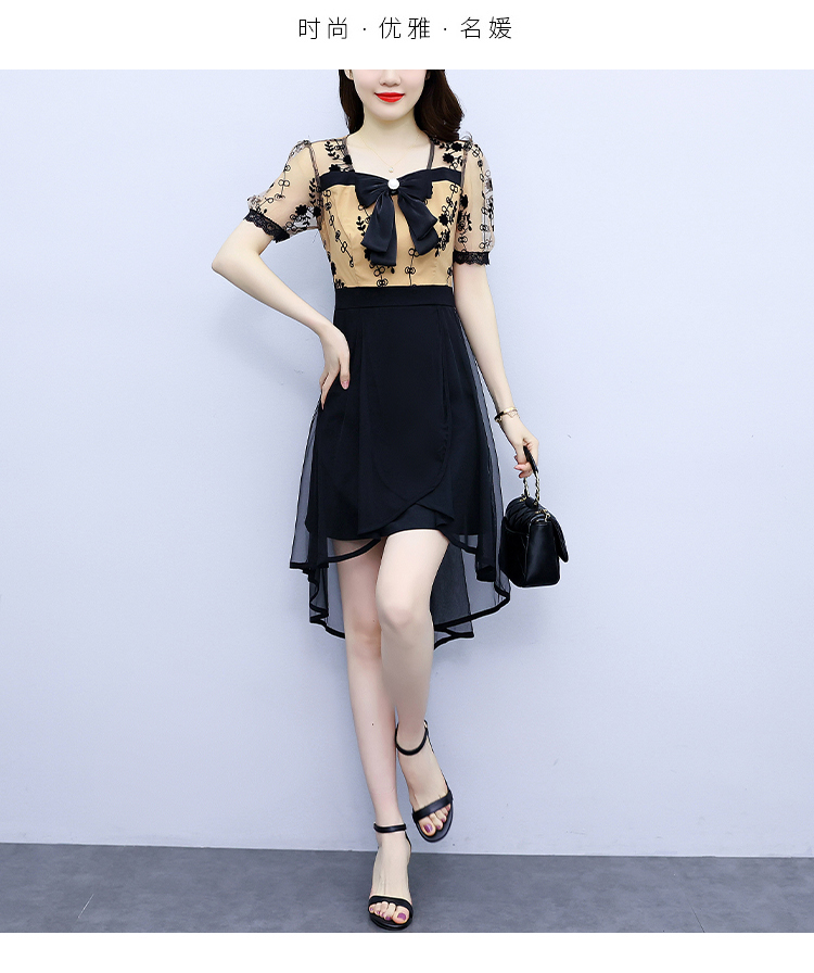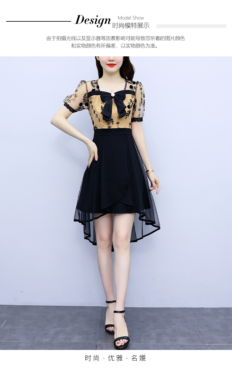 RM7389#大码女装2023夏季新款韩版修身显瘦蝴蝶结网纱拼接遮肉连衣裙