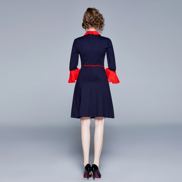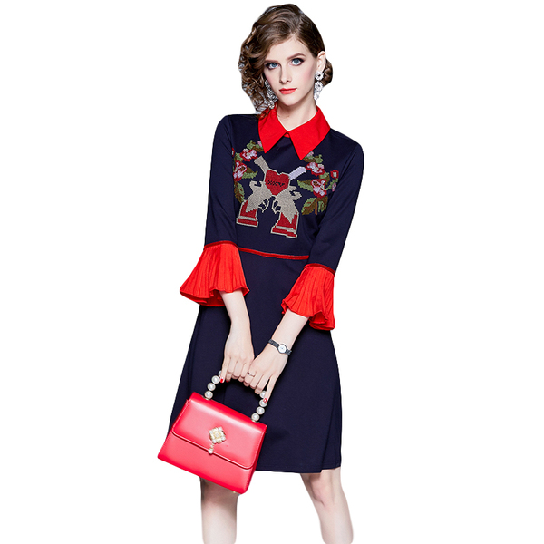 RY1496#重工刺绣拼色喇叭袖秋季连衣裙