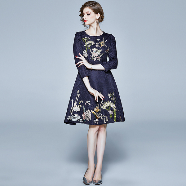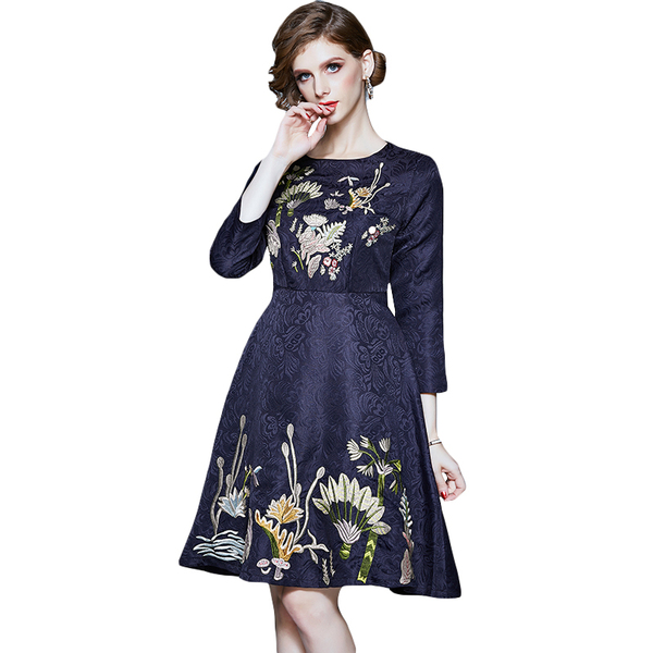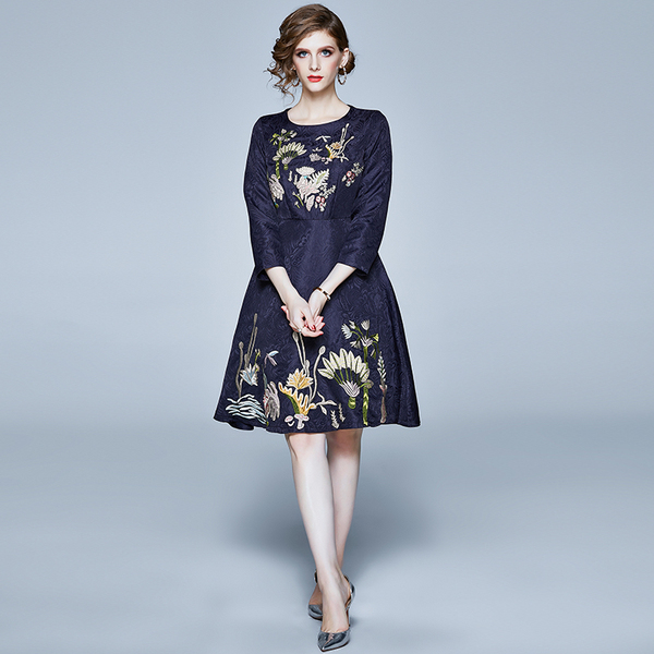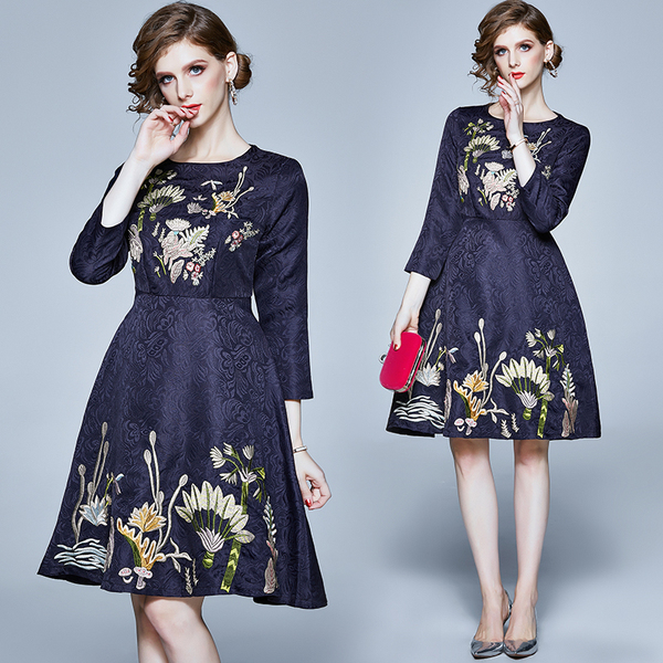 RY1498#提花刺绣水草花朵连衣裙