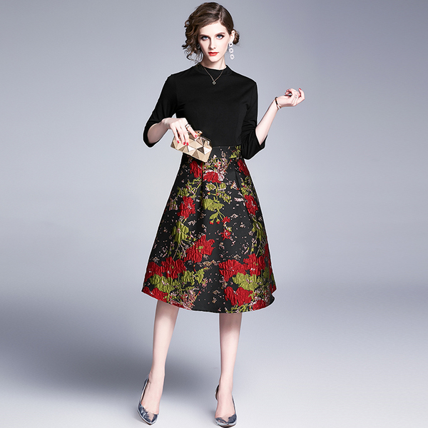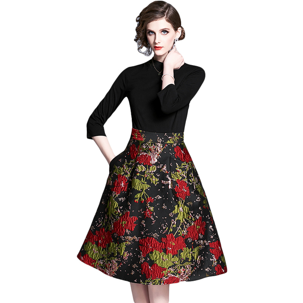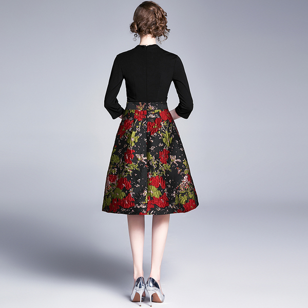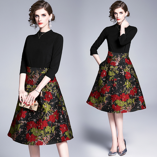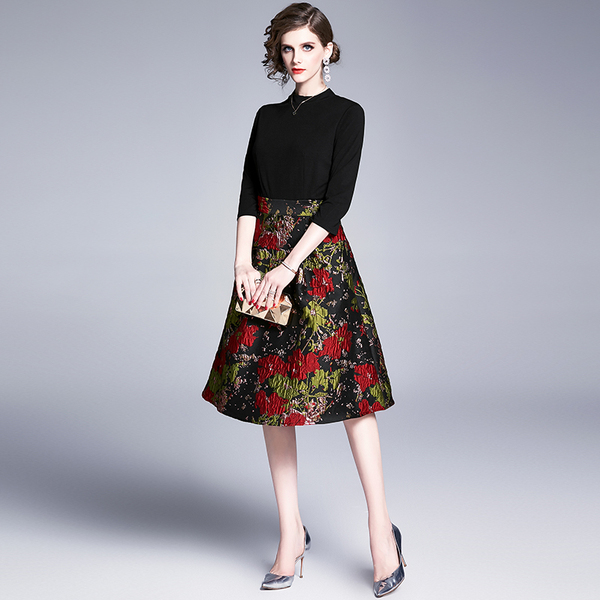 RY1499#提花拼接大摆连衣裙长裙通勤