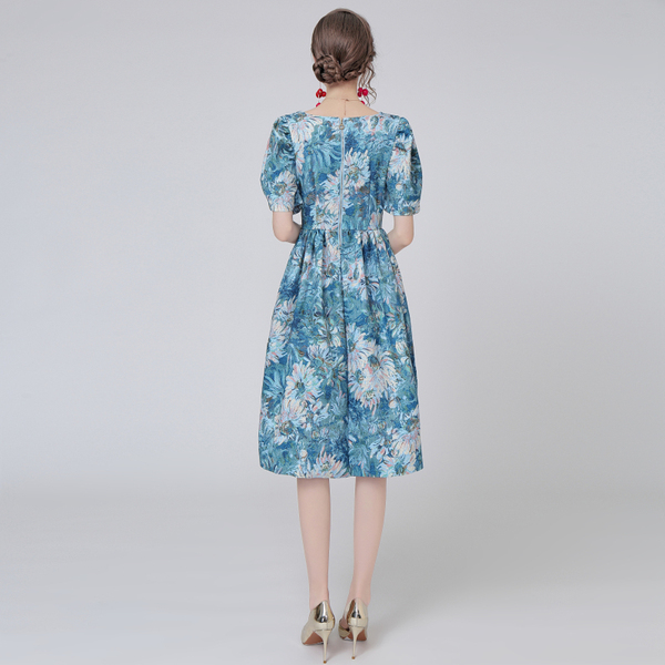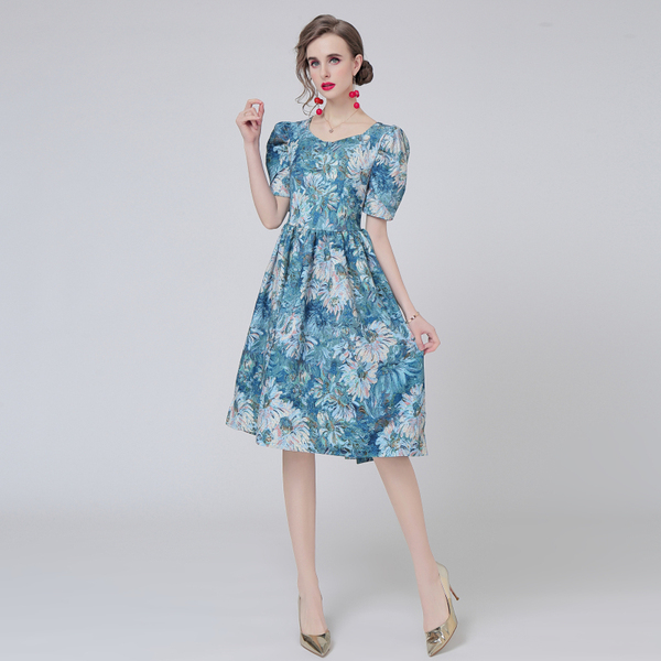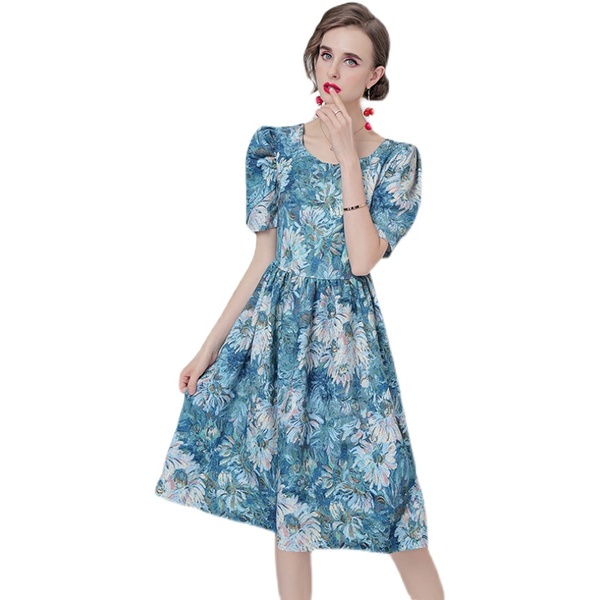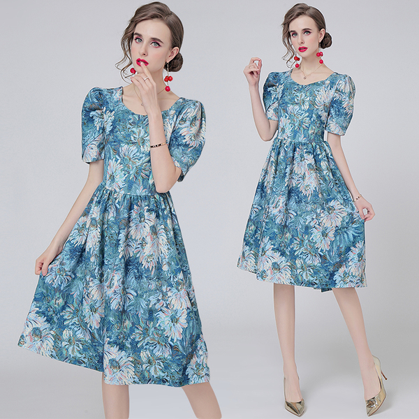 RY1501#花园油画花泡泡袖收腰宫廷法式复古连衣裙少女花色