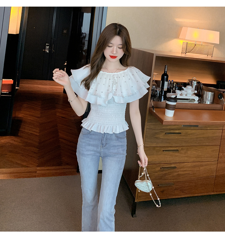 RY1515#欧洲站名媛气质花瓣领上衣重工钉钻荷叶袖蕾丝衫