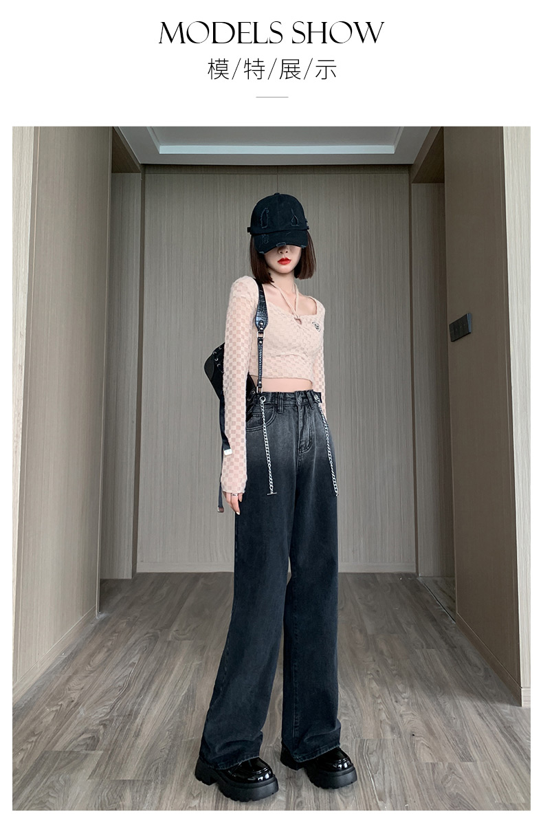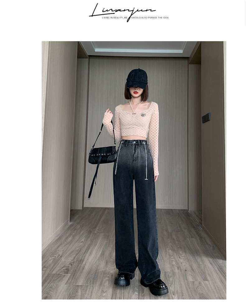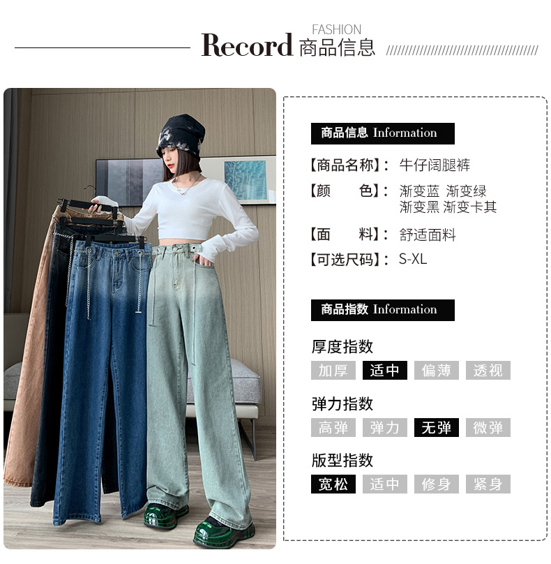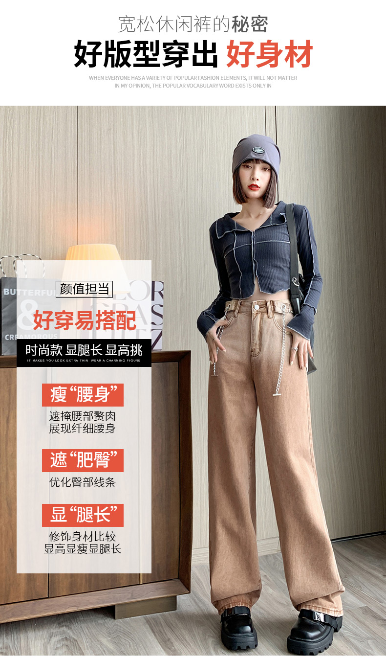 RY1544#渐变阔腿牛仔裤女2023新款链条设计感垂感高腰宽松显瘦直筒拖地裤