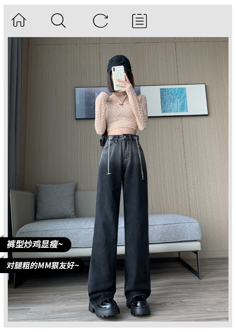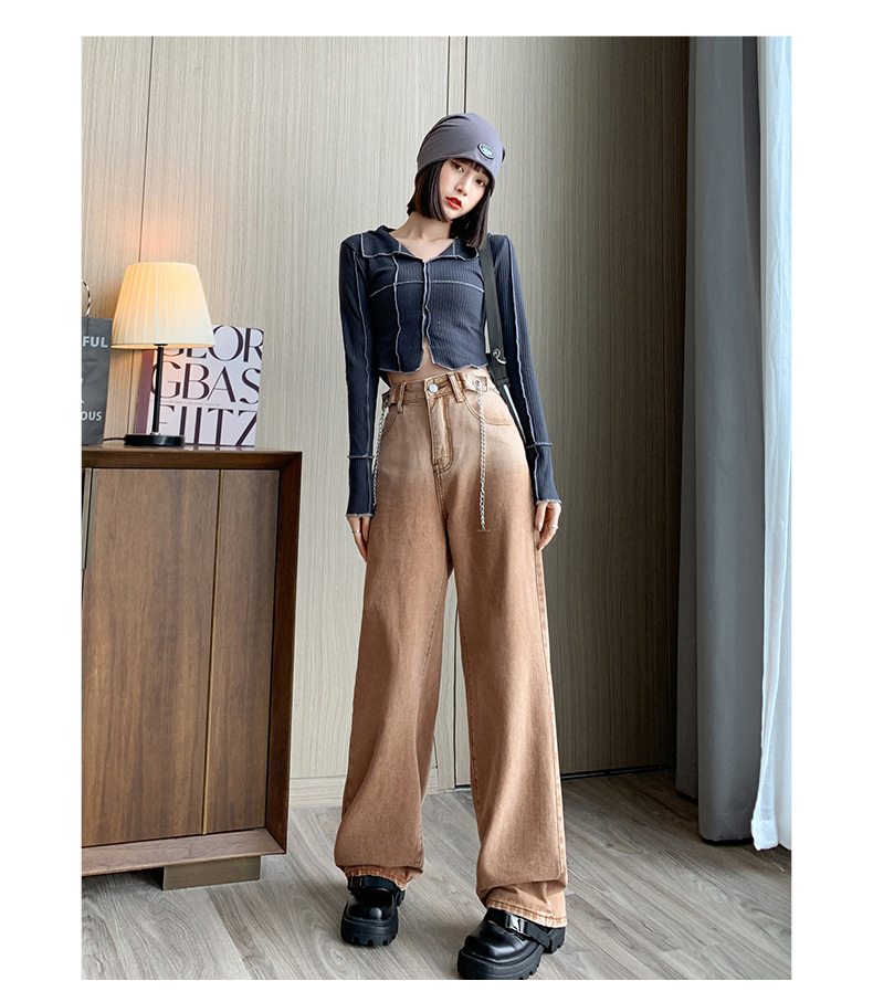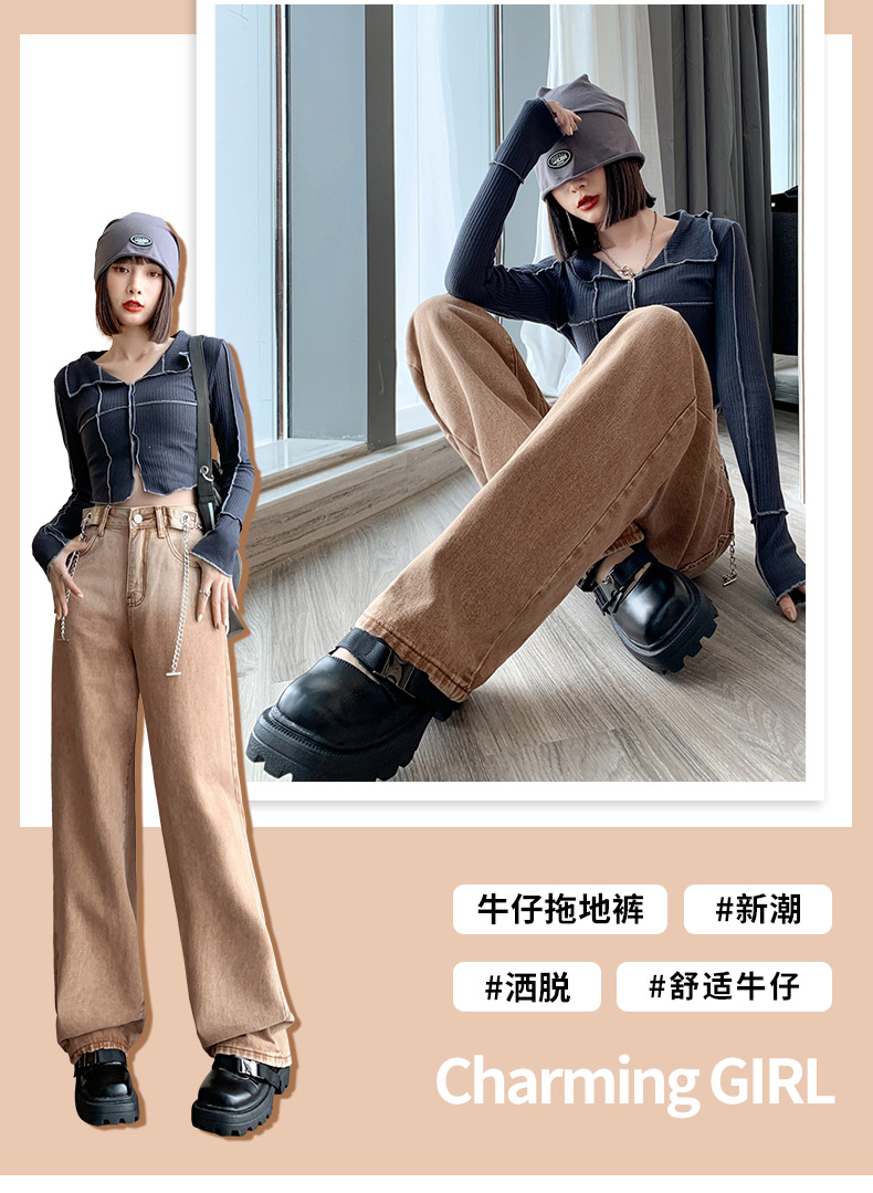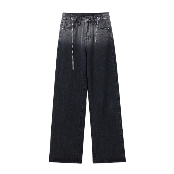 RY1544#渐变阔腿牛仔裤女2023新款链条设计感垂感高腰宽松显瘦直筒拖地裤