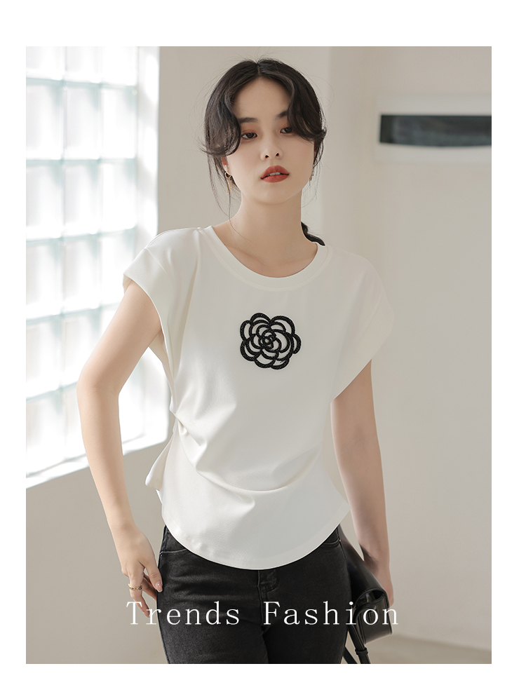 RM7663#设计感山茶花T恤女2023新款夏季收腰显瘦减龄飞飞袖上衣