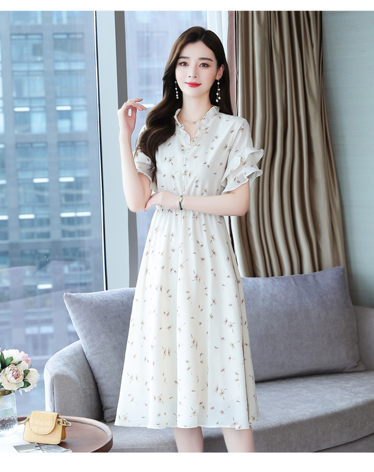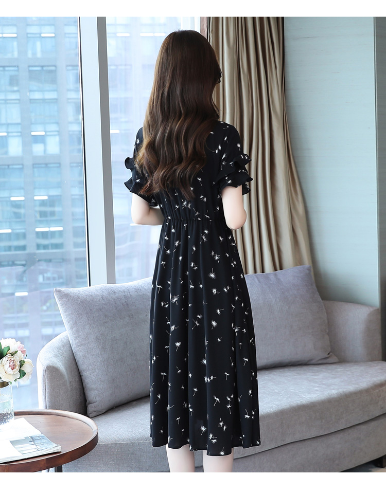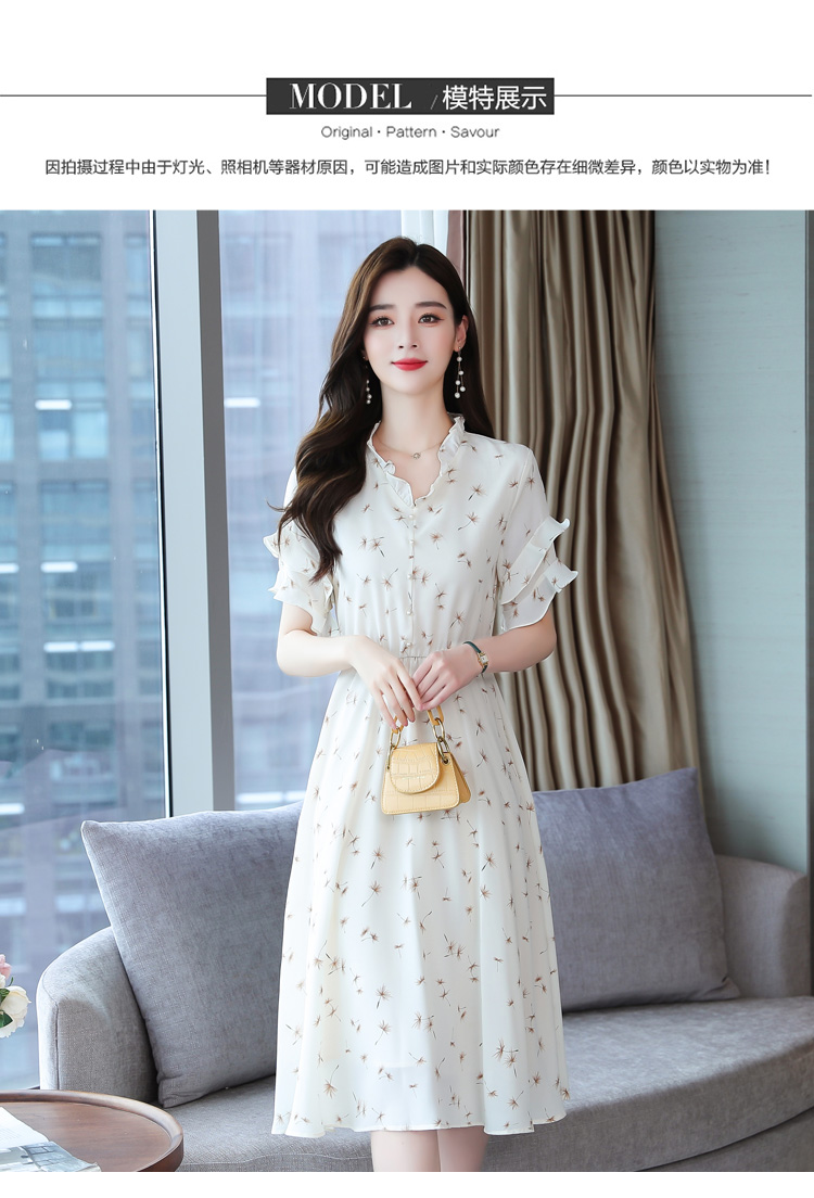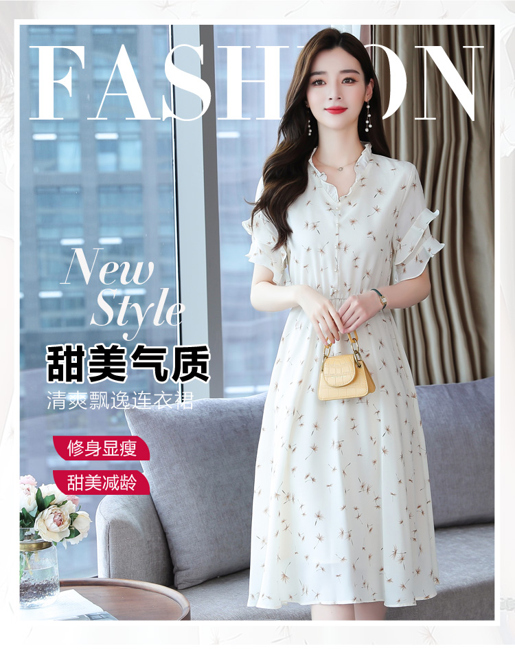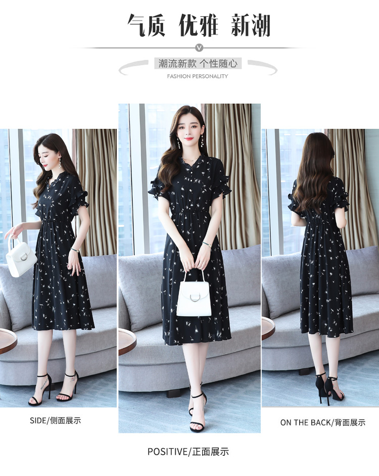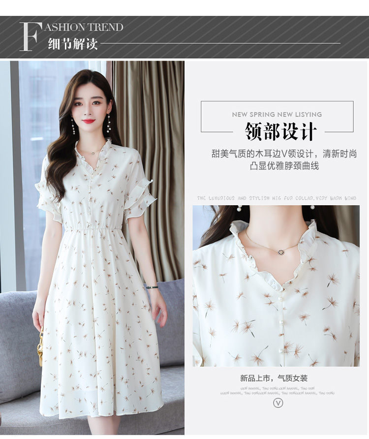 RM7813#碎花连衣裙女中长款2023年夏季复古收腰长裙短袖雪纺裙子气质