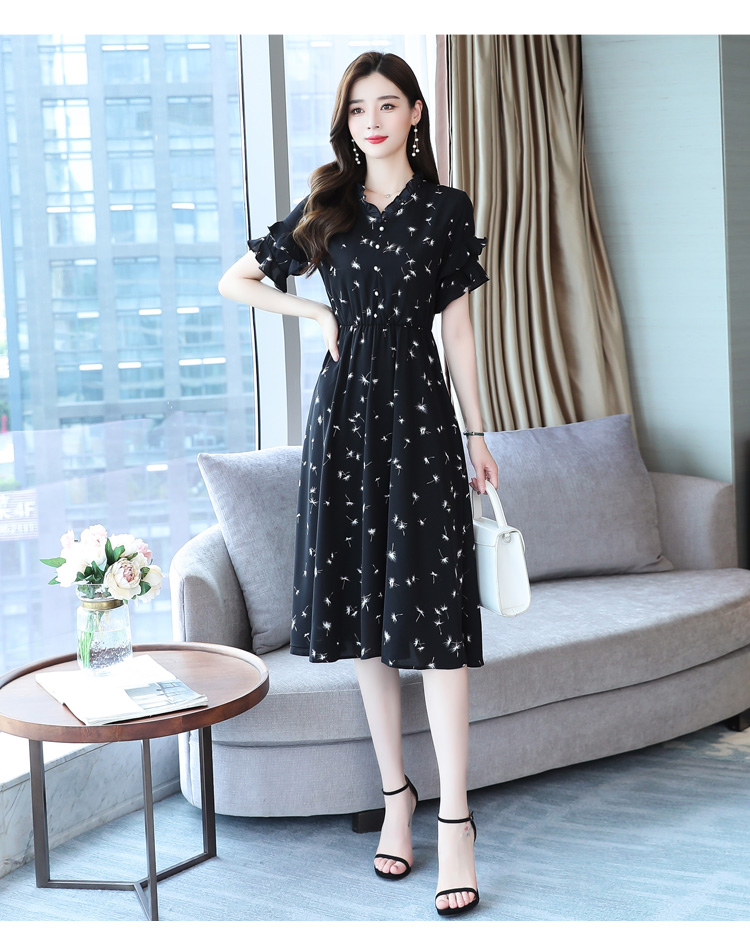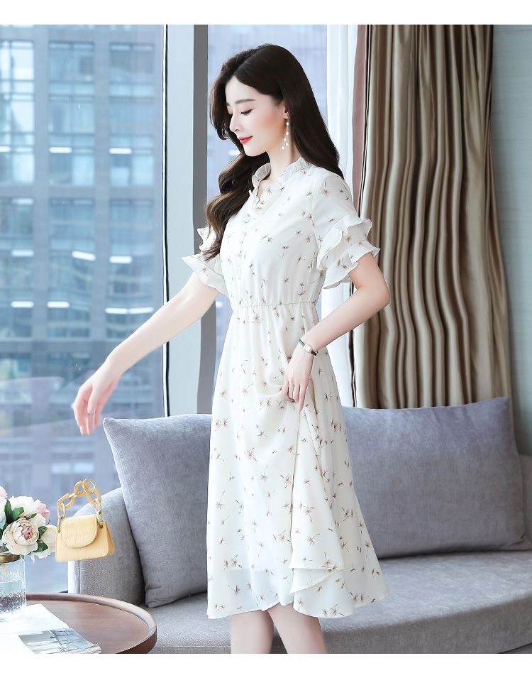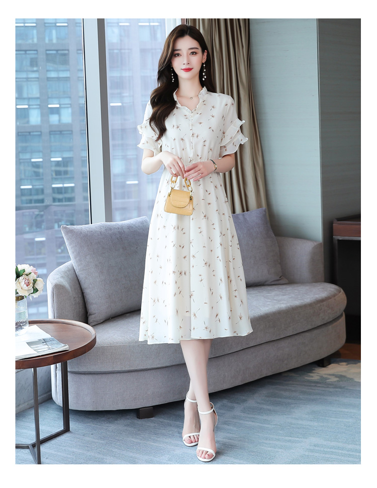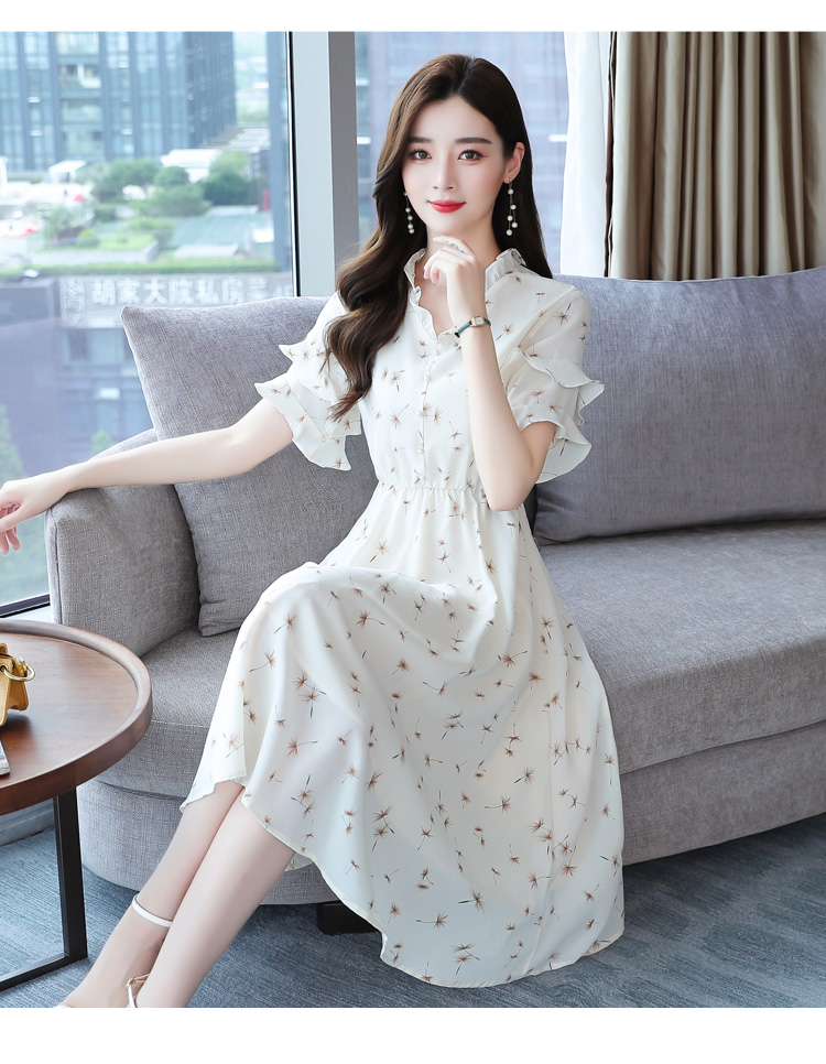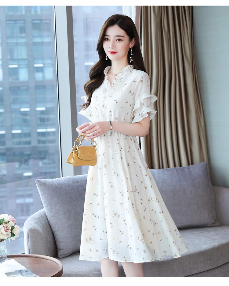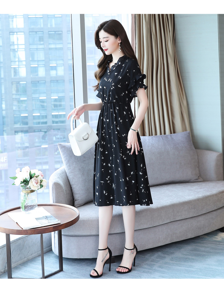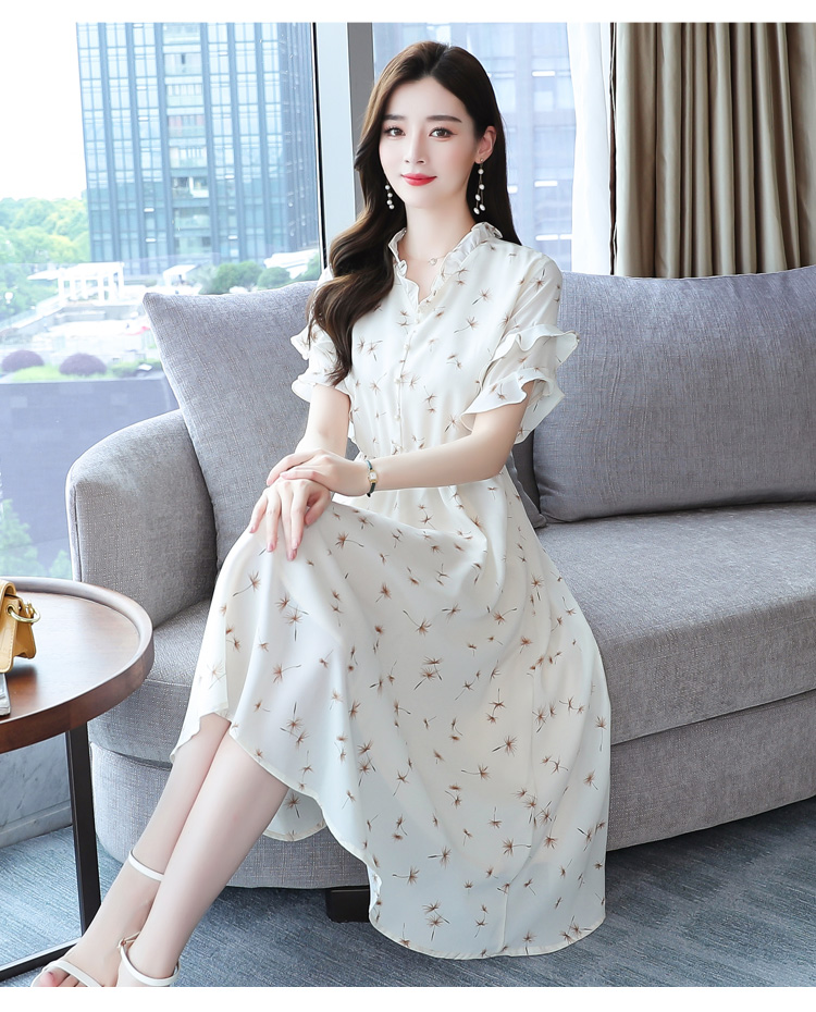 RM7813#碎花连衣裙女中长款2023年夏季复古收腰长裙短袖雪纺裙子气质