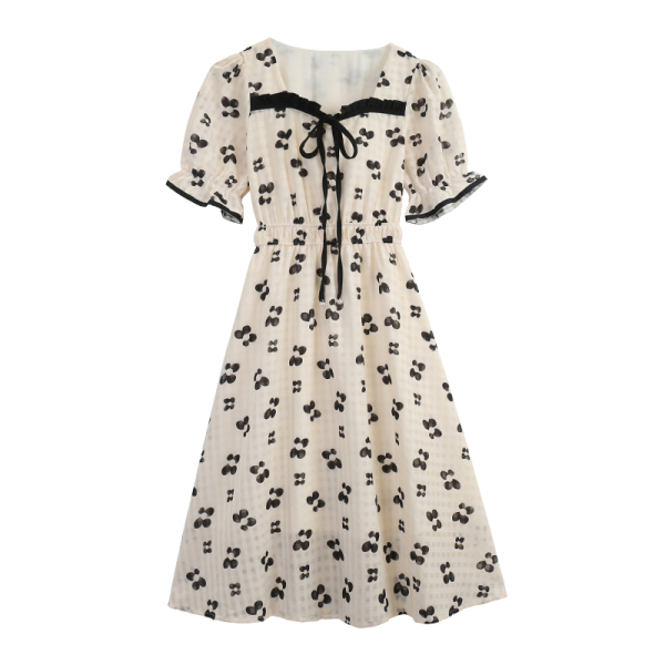 RM7820#新款夏装淑女雪纺印花裙子女装系带收腰V型宽松A字连衣裙