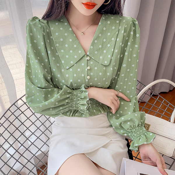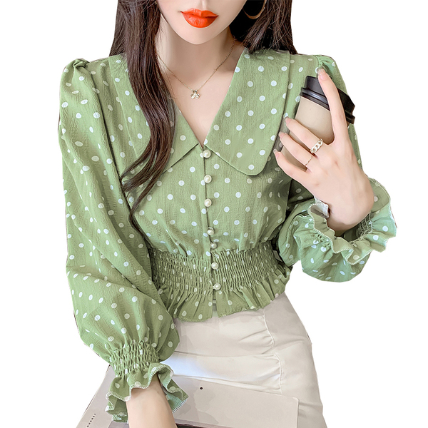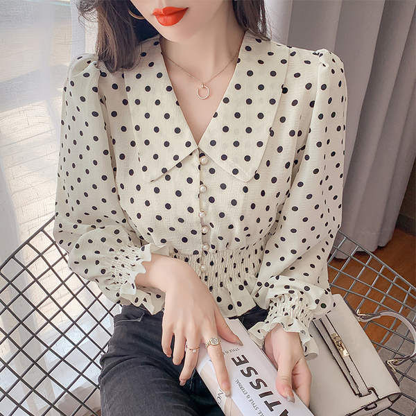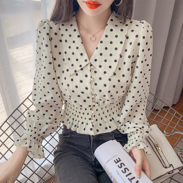 RY1449#长袖新款法式气质淑女风V领波点衬衫百搭收腰显瘦上衣女