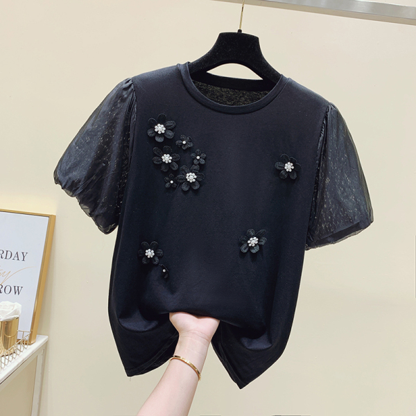 RM7832#新款设计感泡泡袖立体花朵短袖t恤女百搭小众重工上衣夏