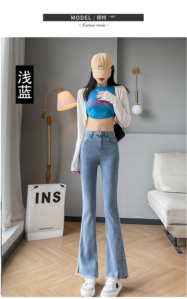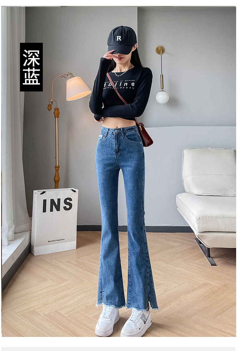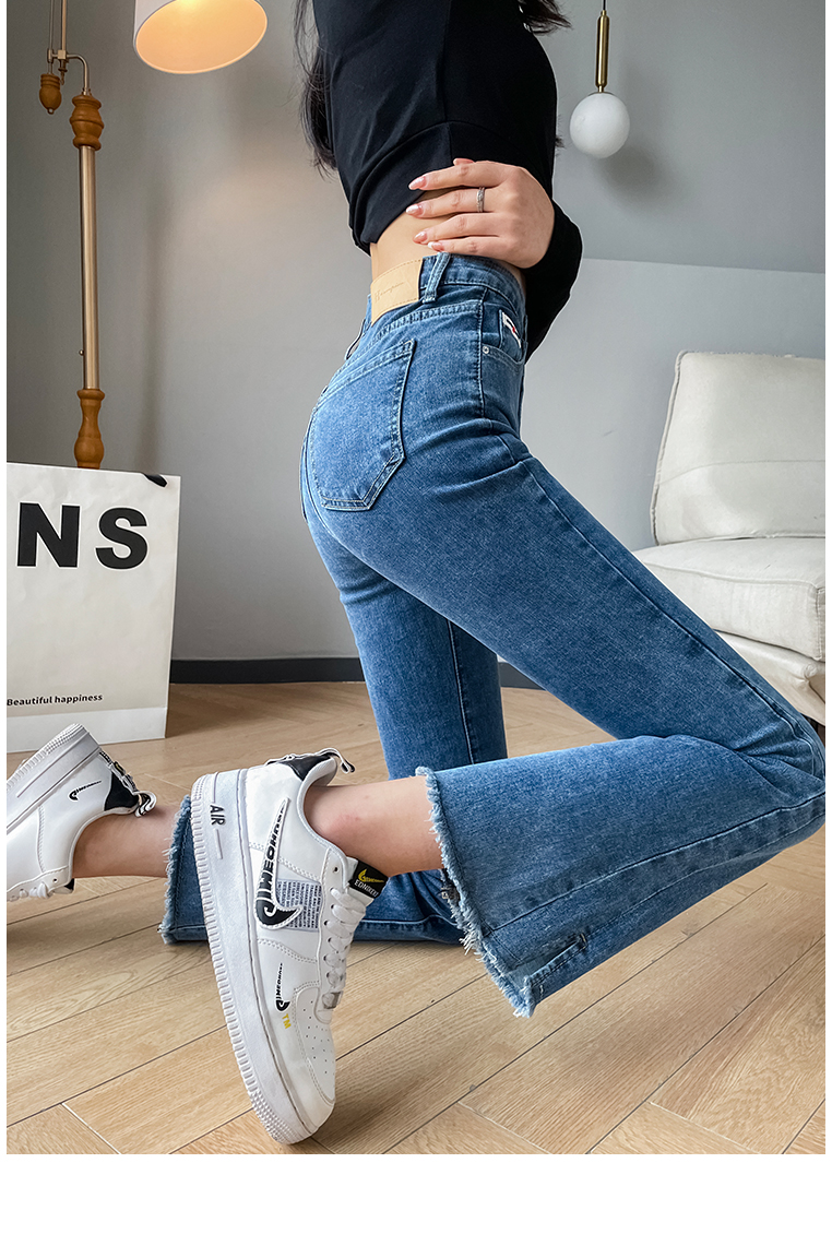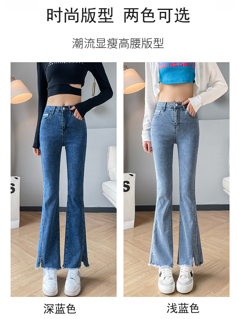 RM7963#微喇牛仔裤女春秋季2023新款高腰弹力九分小个子喇叭开叉毛边裤子