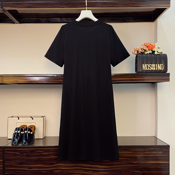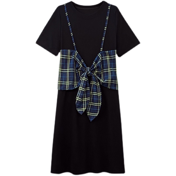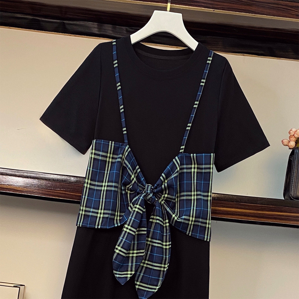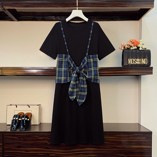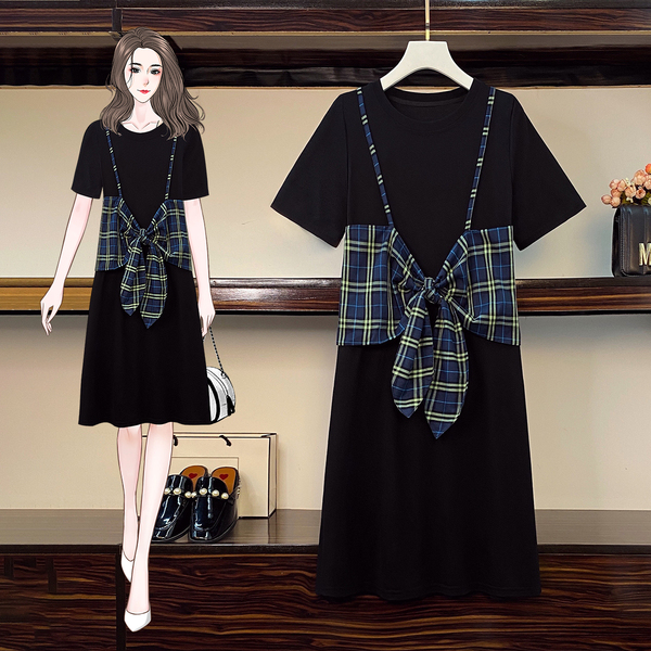 RM8042#夏季新款胖MM纯棉T恤显瘦拼接格子假两件黑色减龄连衣裙