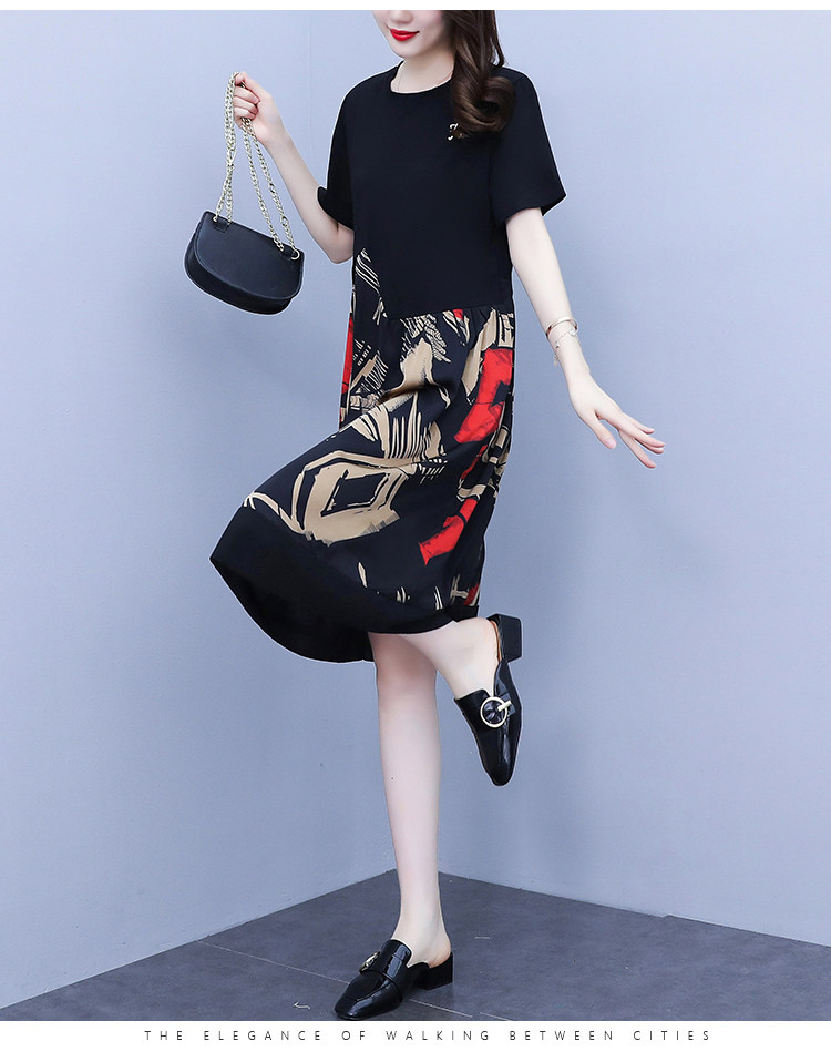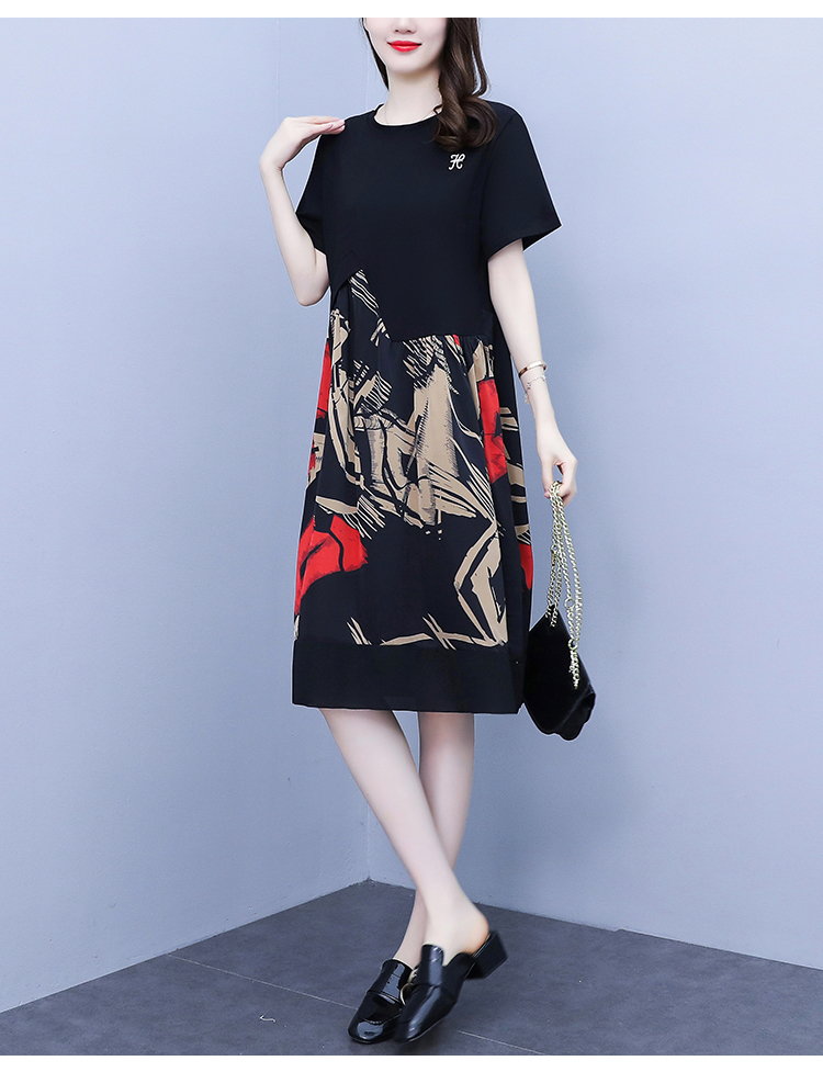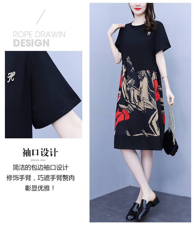RM8466#大码女装2023夏季新款胖妹妹宽松显瘦时尚拼接印花圆领短袖连衣裙