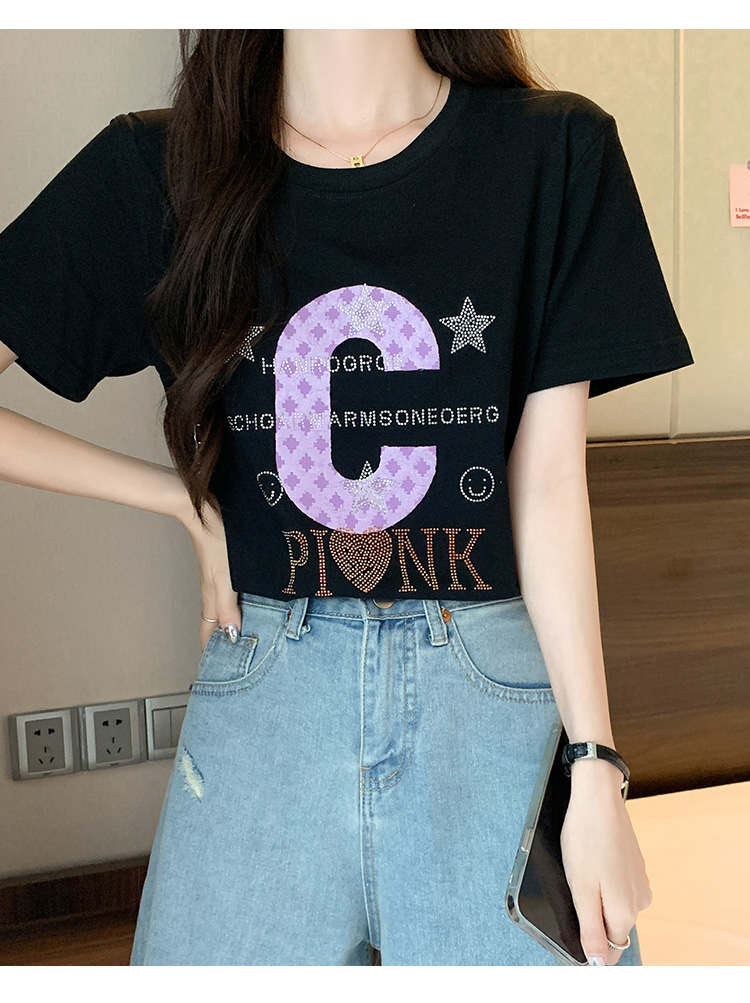 RM8480#重工烫钻短袖t恤女夏胖mm显瘦遮肚甜辣风不规则褶皱短款上衣