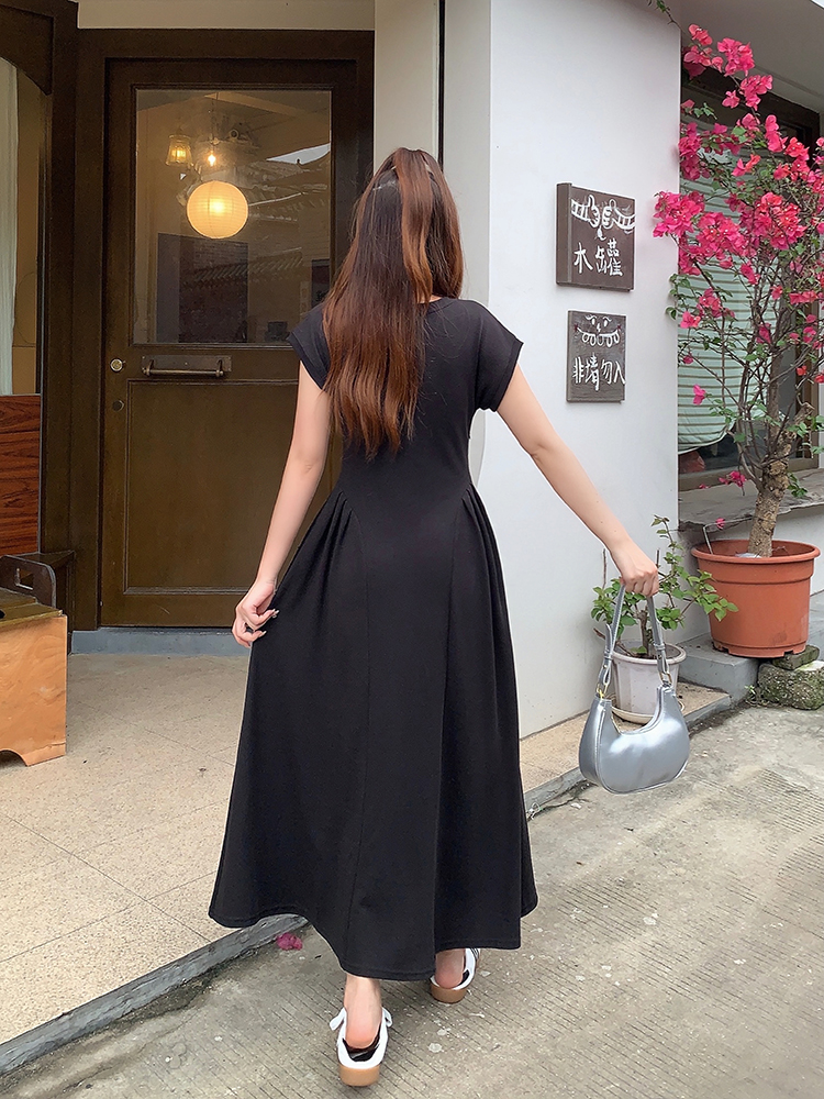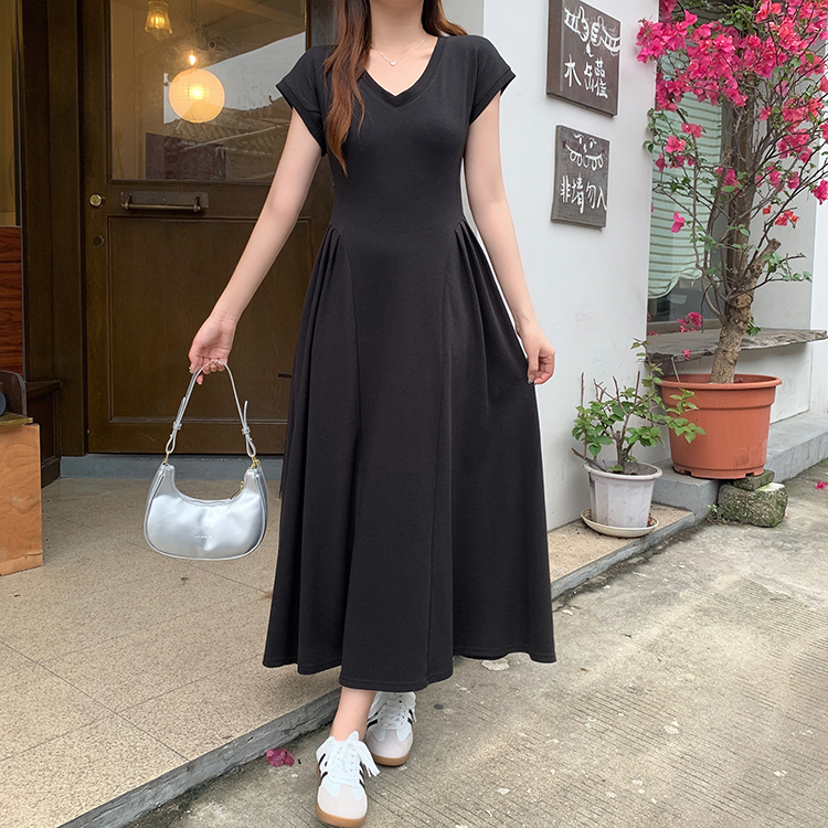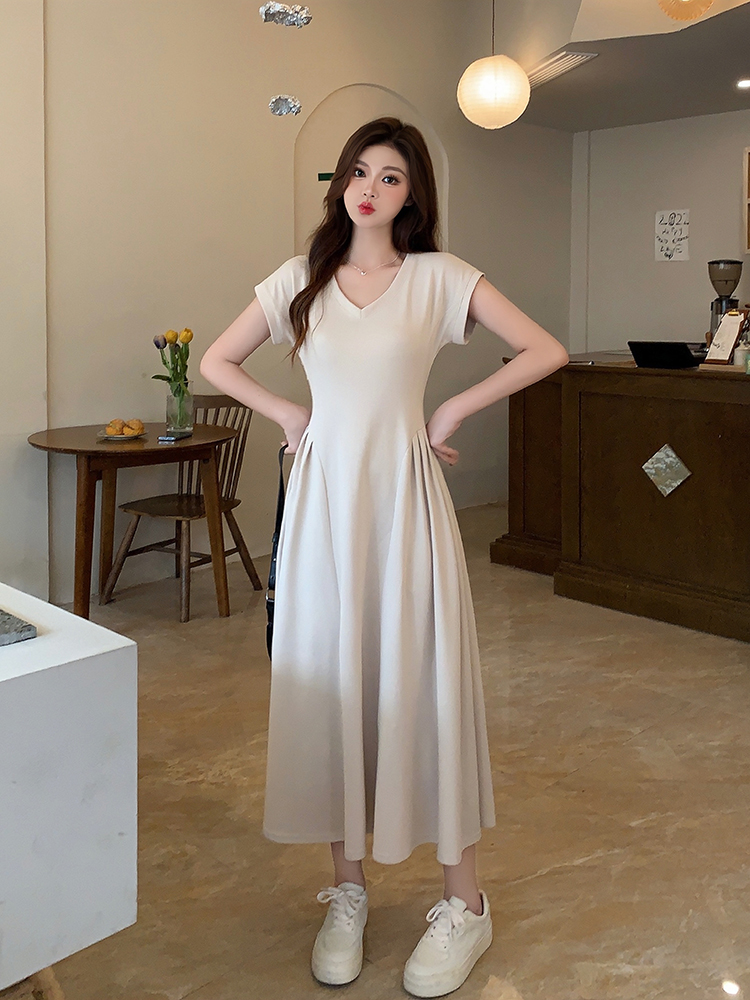 RM8497#夏装新款胖mm时尚显瘦高级感收腰折皱修身V领连衣裙