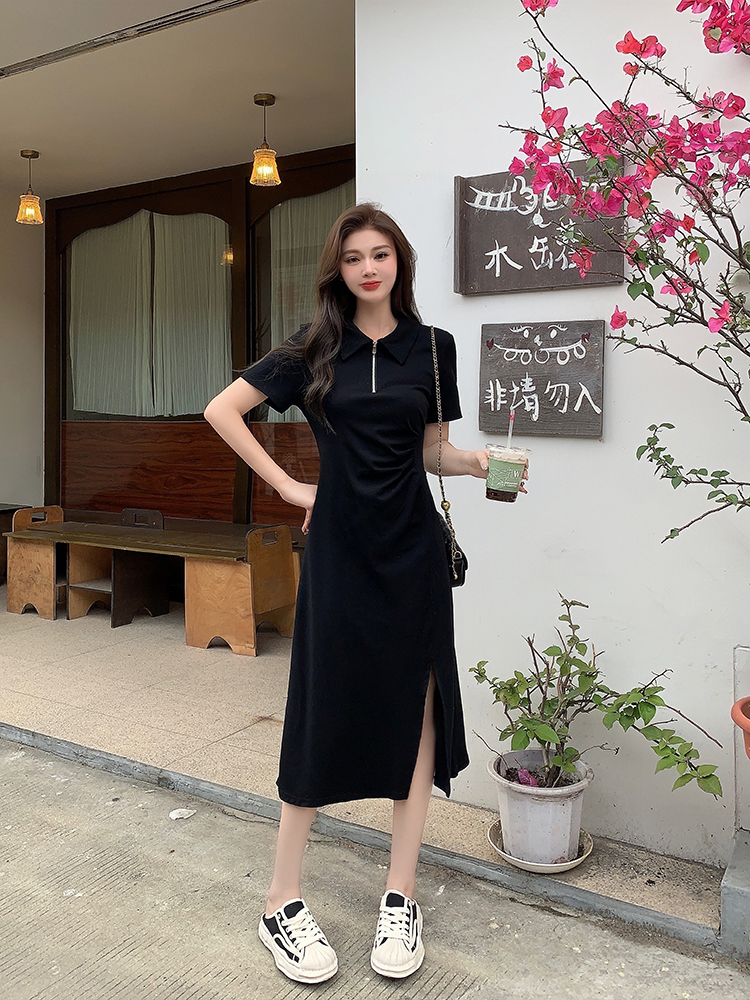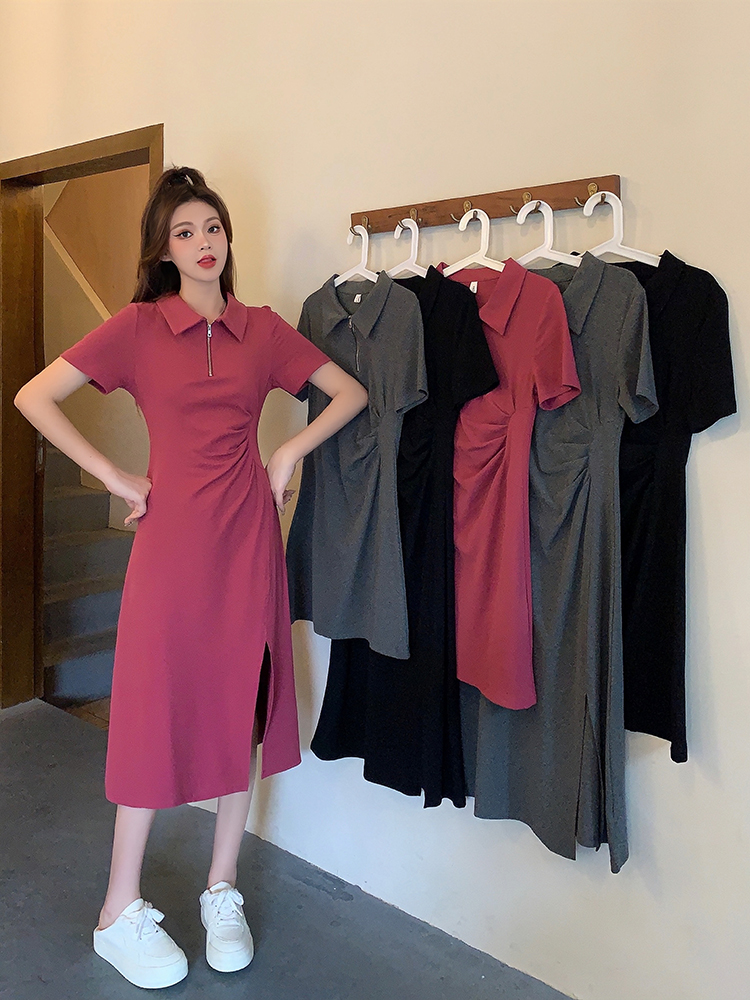 RM8498#夏装新款胖mm时尚显瘦休闲半开领折皱开叉连衣裙
