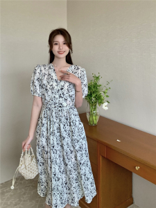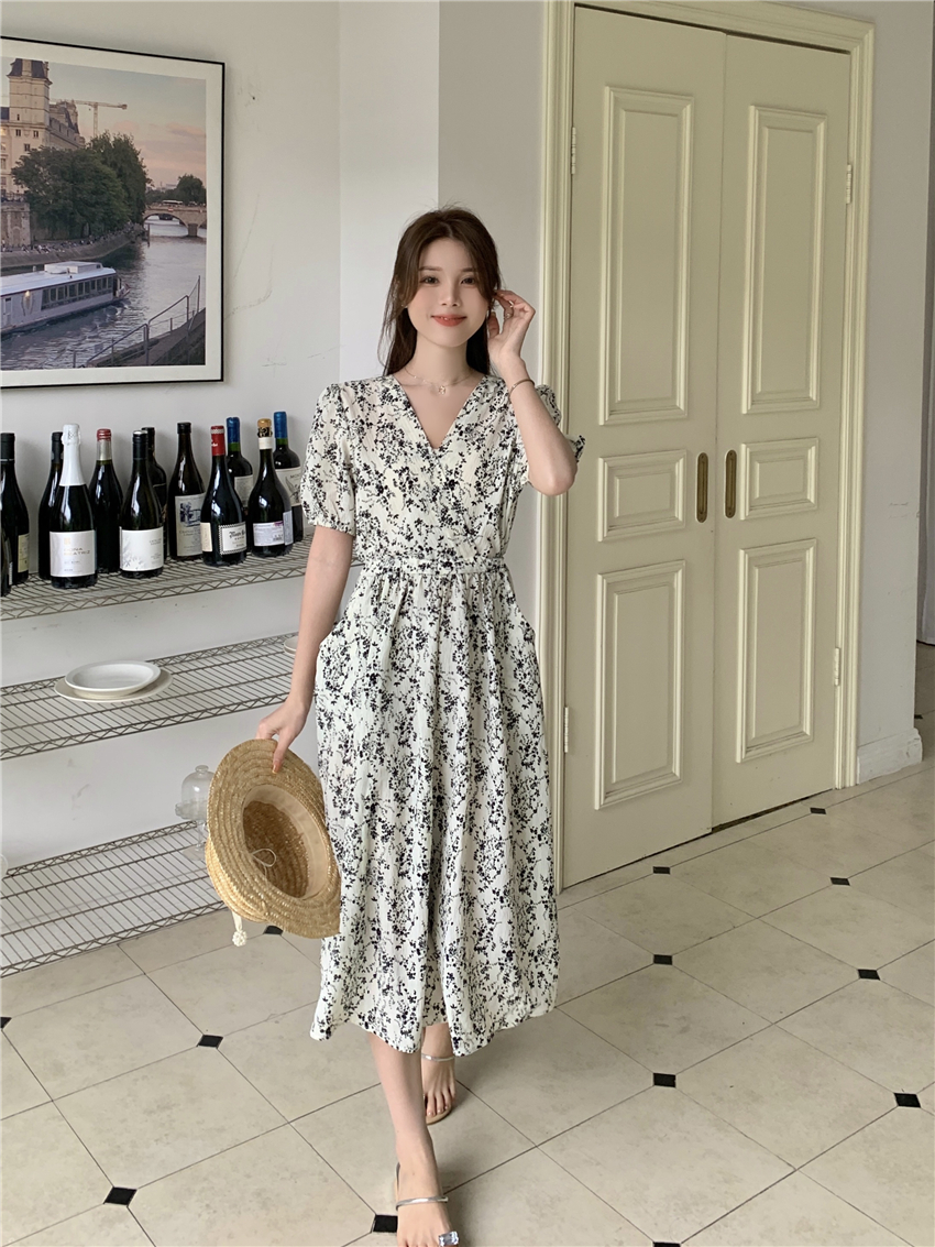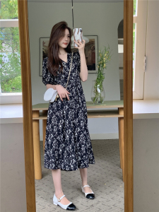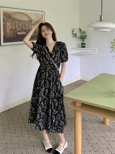 RM8544#法式淑女收腰显瘦连衣裙女夏装水墨画设计感碎花V领中长裙子