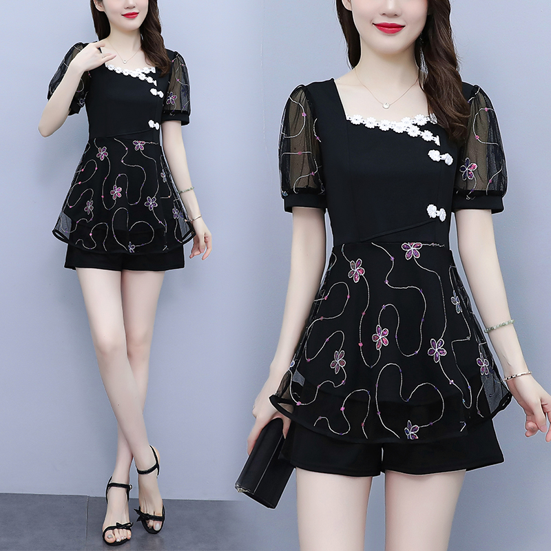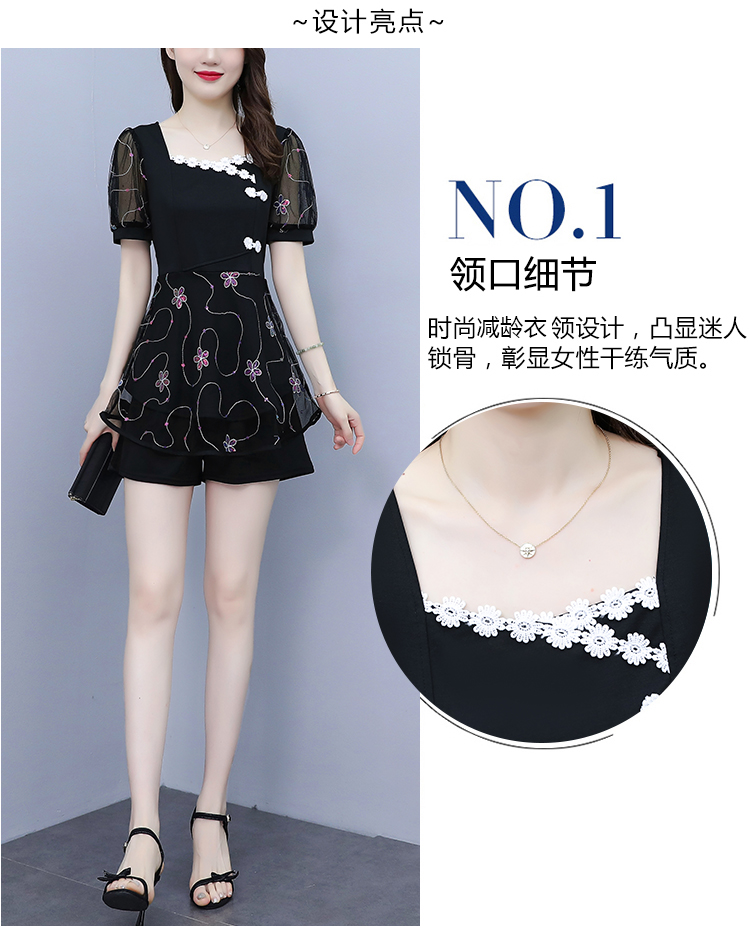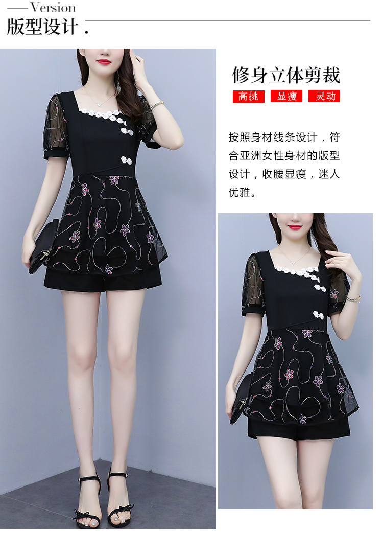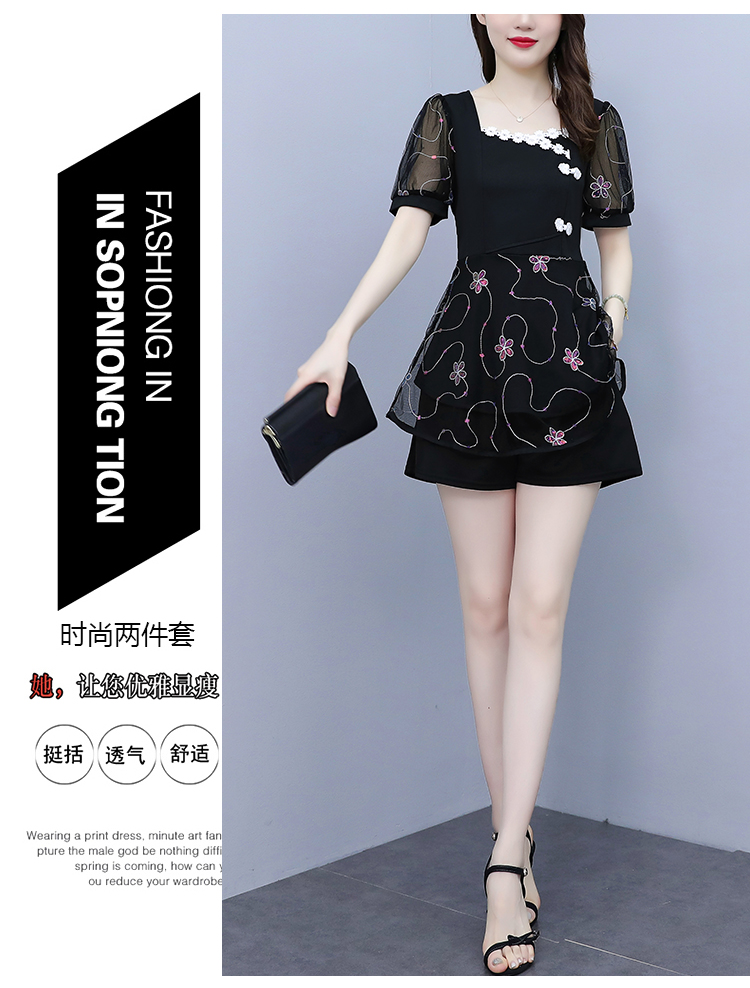 RM8655#大码2023夏季新款改良旗袍刺绣套装方领洋气显瘦减龄两件套