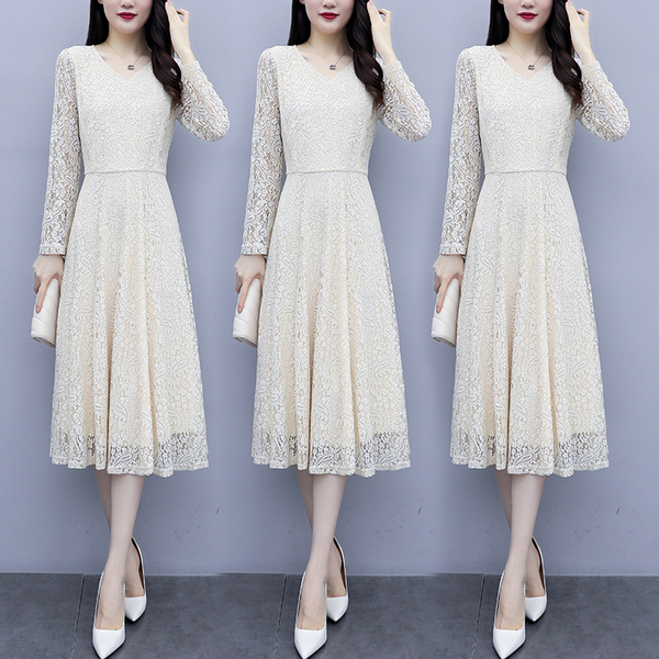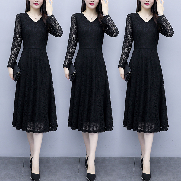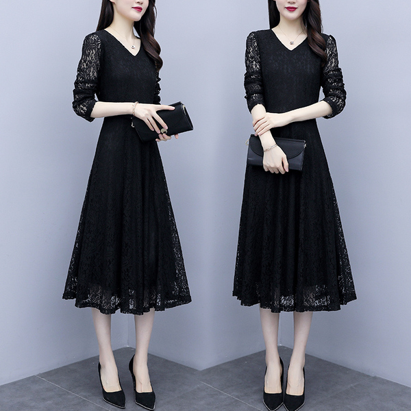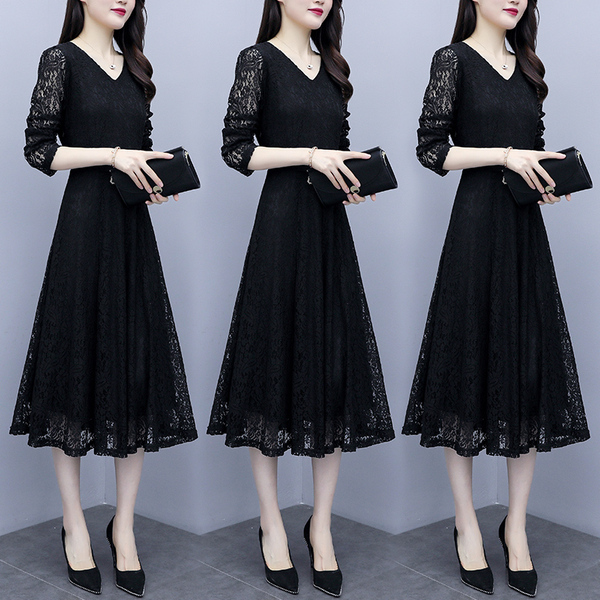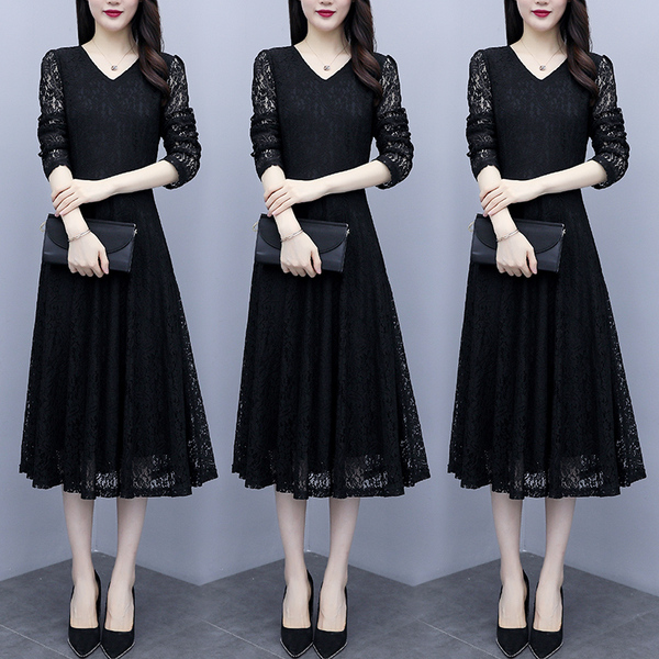 RY1462#秋装大码女装新款裙子连衣裙蕾丝中长款a字裙女