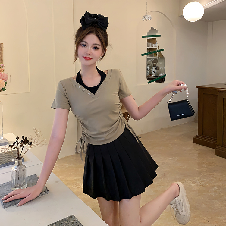 RM8909#夏装新款胖mm时尚百搭显瘦设计感挂脖抽绳假两件短袖T恤