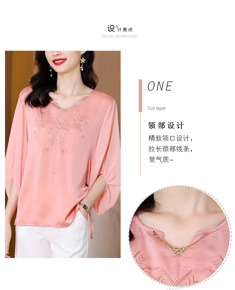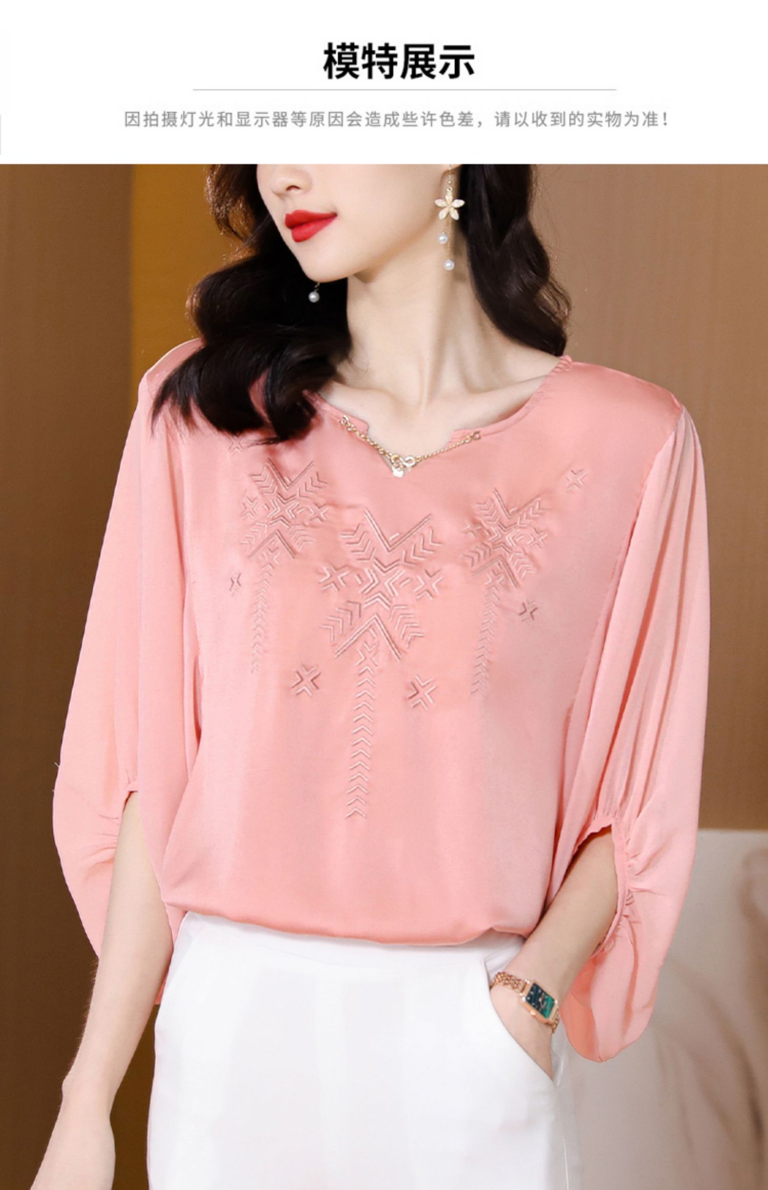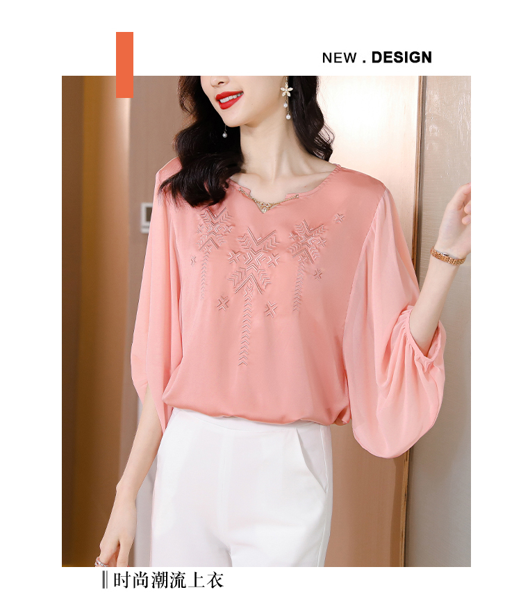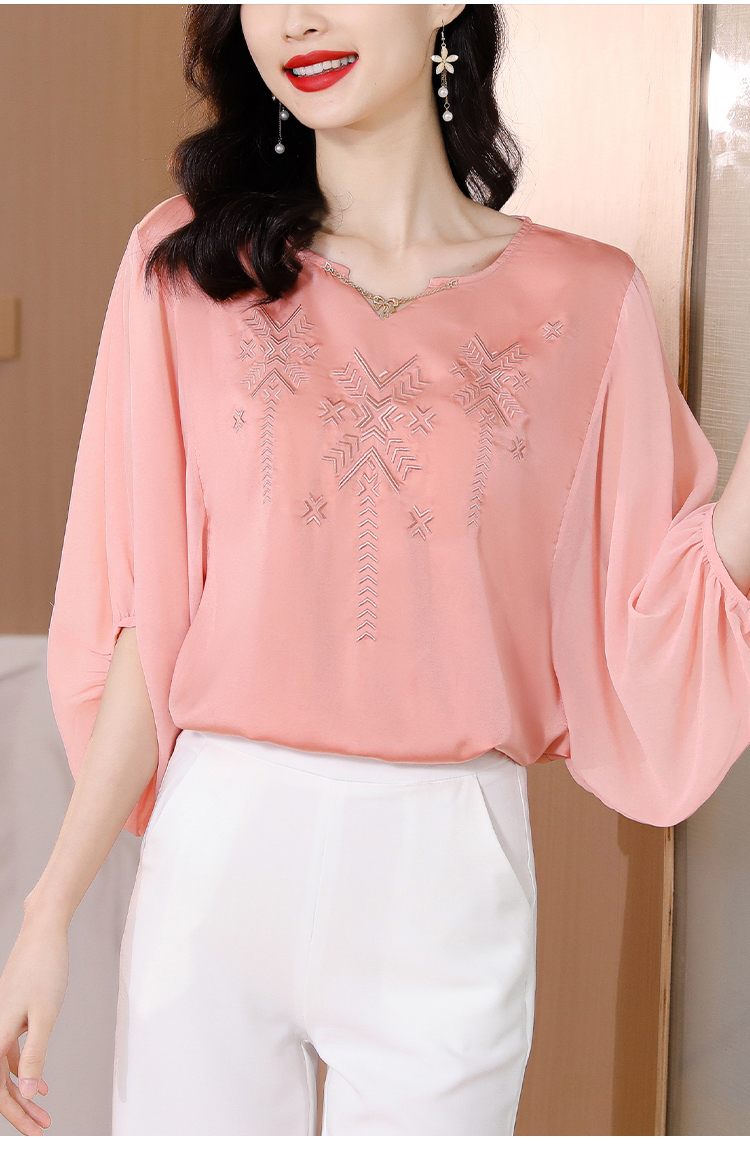 RM8919#t恤女夏季2023新款法式小众V领刺绣宽松灯笼袖桑蚕丝粉色上衣