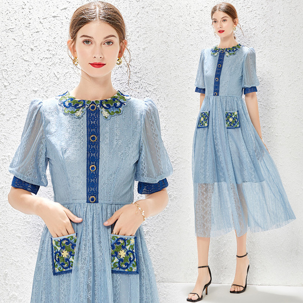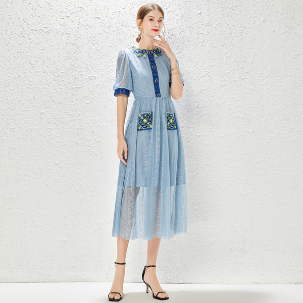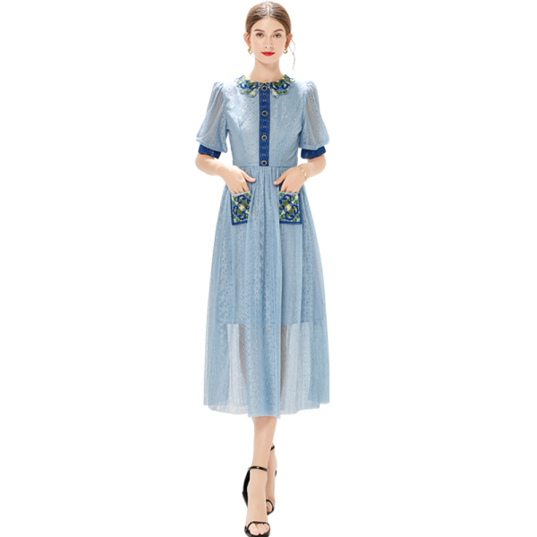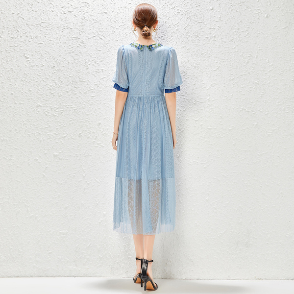 RM9016#蓝色法式复古泡泡袖水溶蕾丝刺绣拼接收腰连衣裙