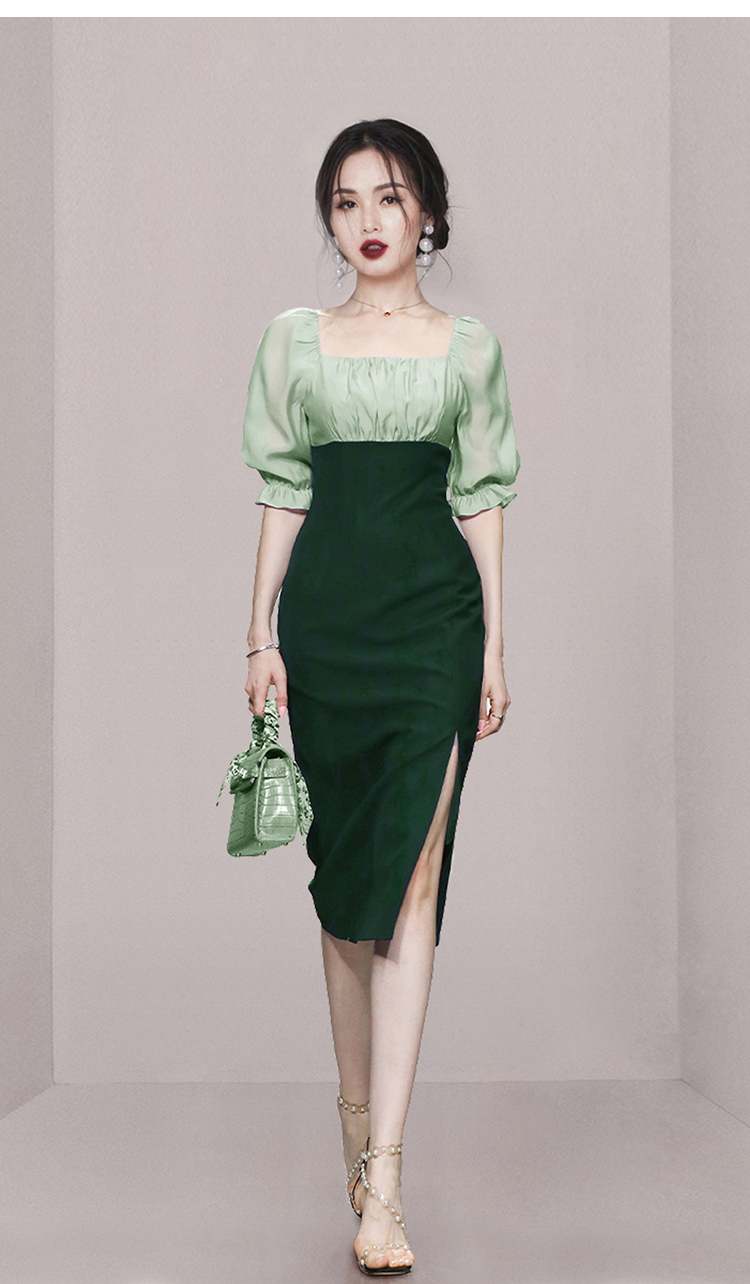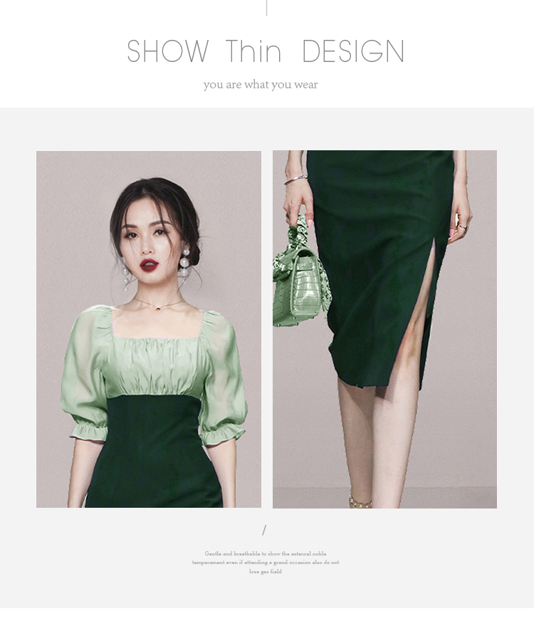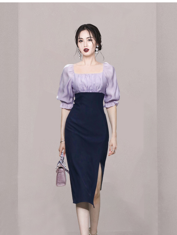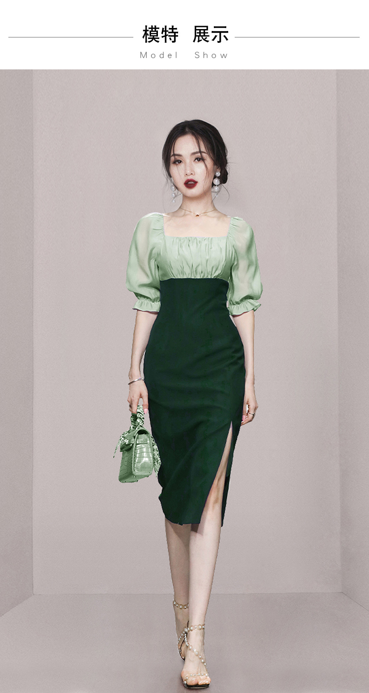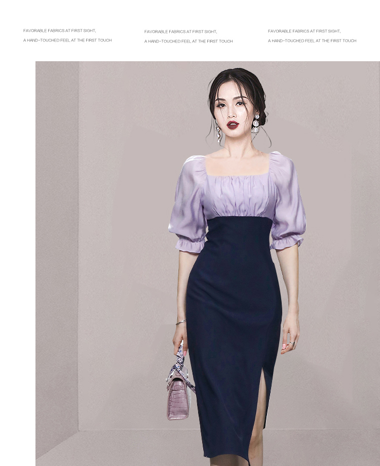 RM9265#夏新款撞色气质方领泡泡袖修身显瘦轻奢流行通勤连衣裙