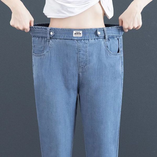 RM9373#抖音爆款现货高腰天丝哈伦牛仔裤女夏新宽松直筒休闲九分裤松紧腰