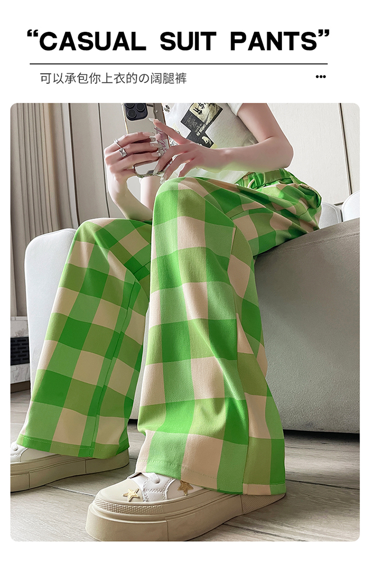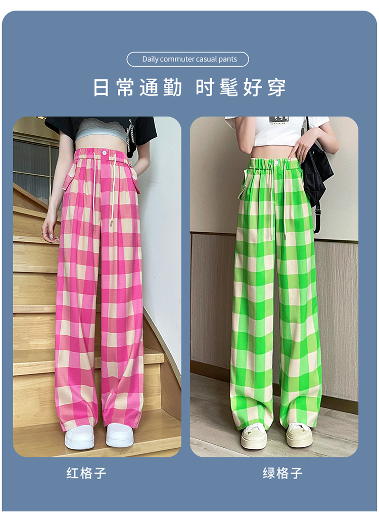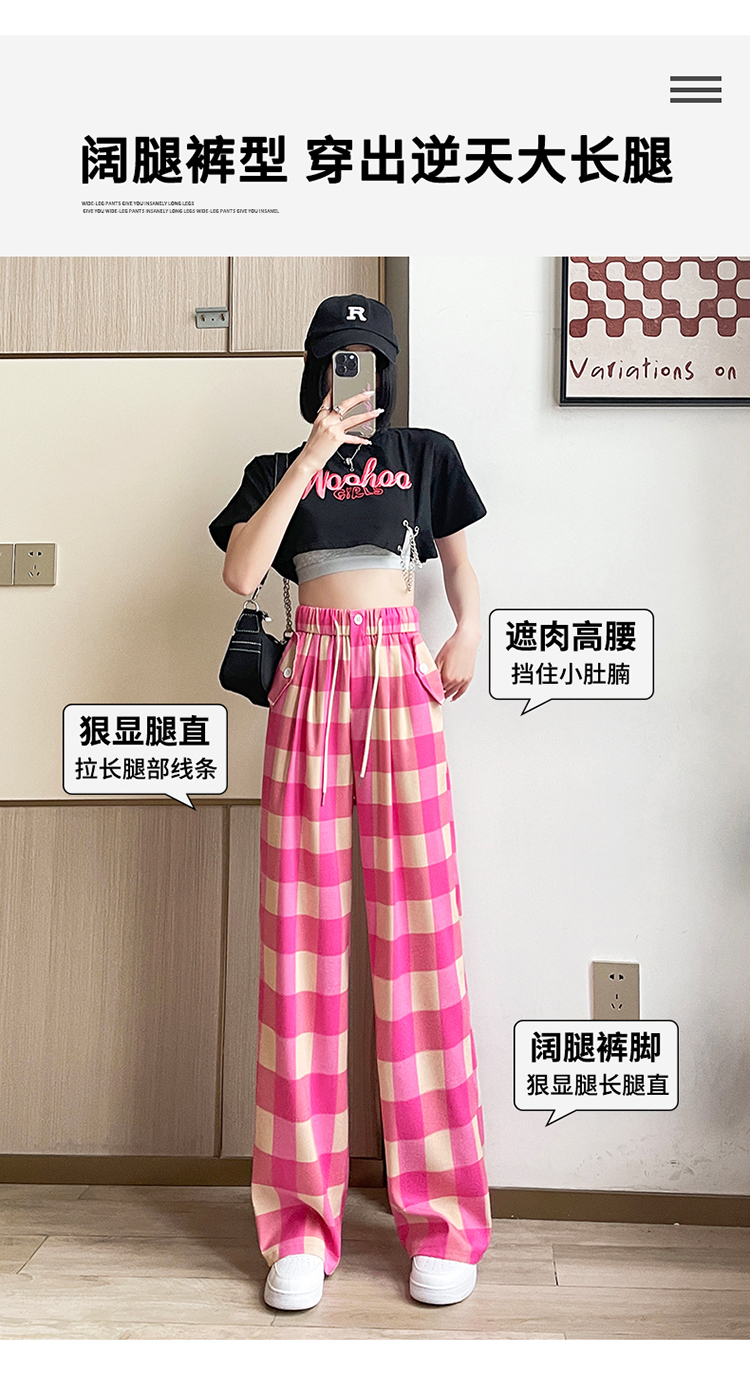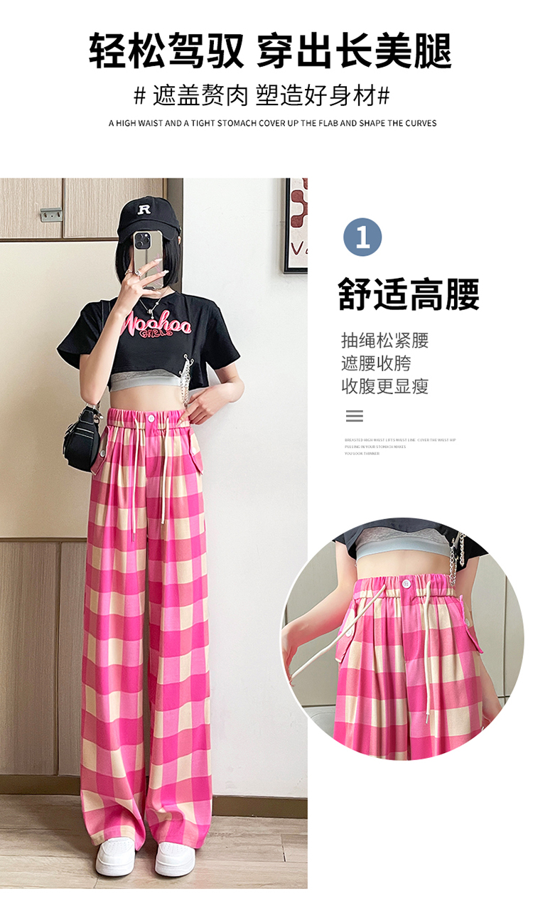 RM9440#春夏粉色格子休闲裤女复古宽松慵懒风直筒阔腿裤拖地裤