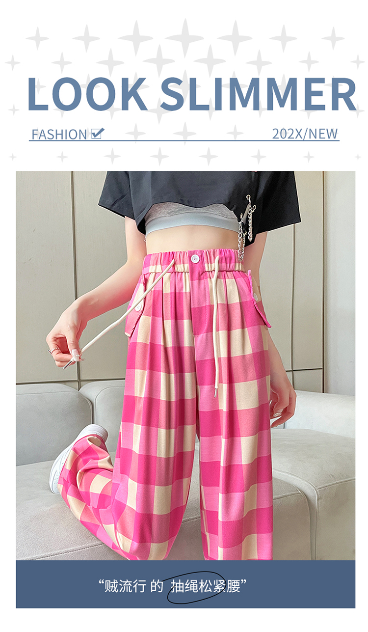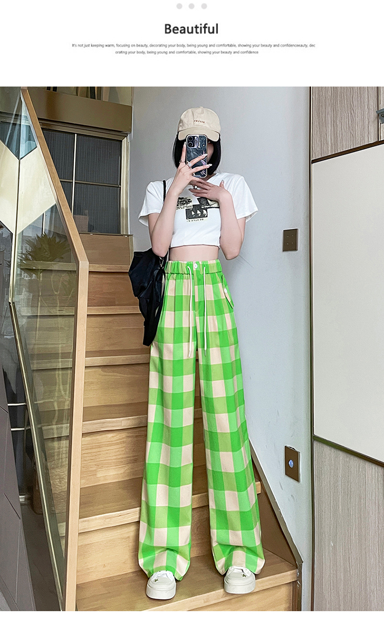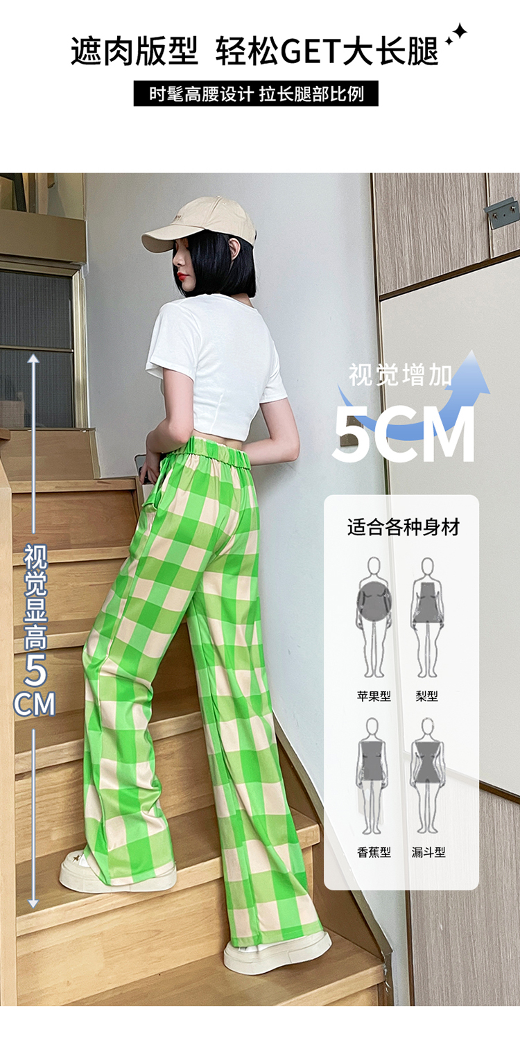 RM9440#春夏粉色格子休闲裤女复古宽松慵懒风直筒阔腿裤拖地裤
