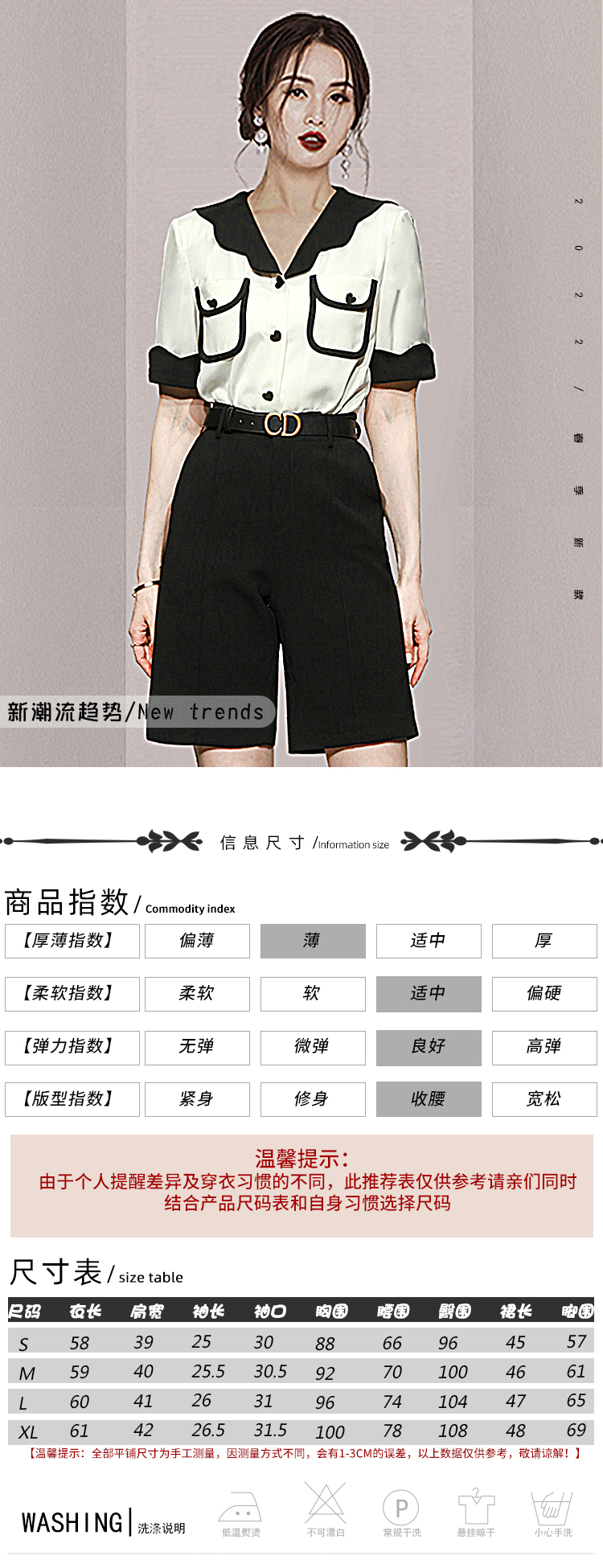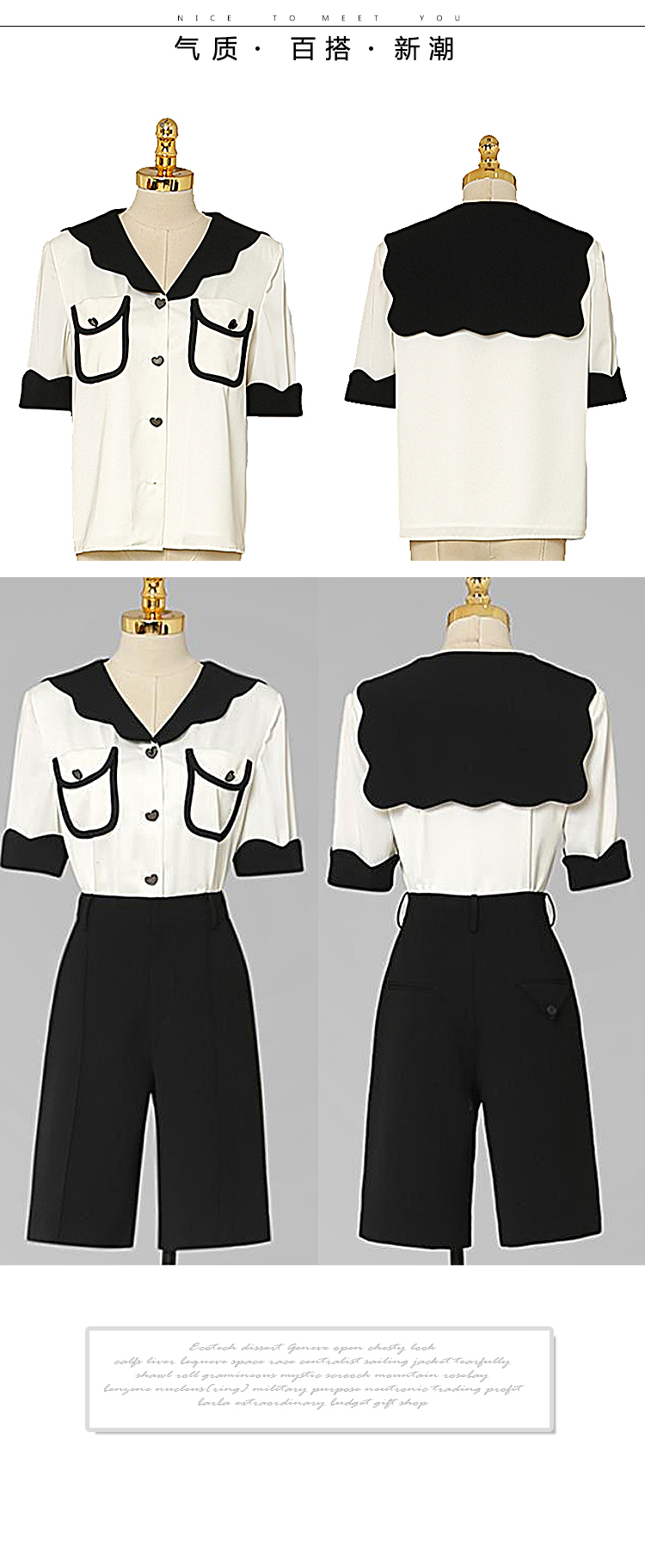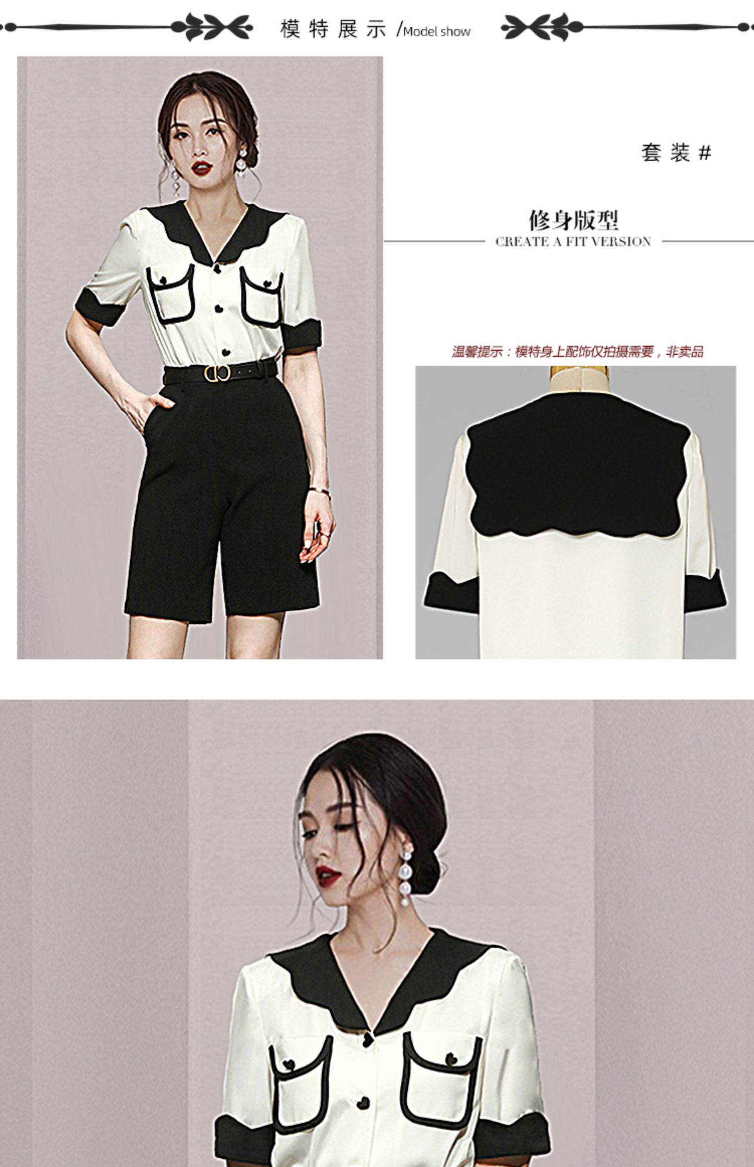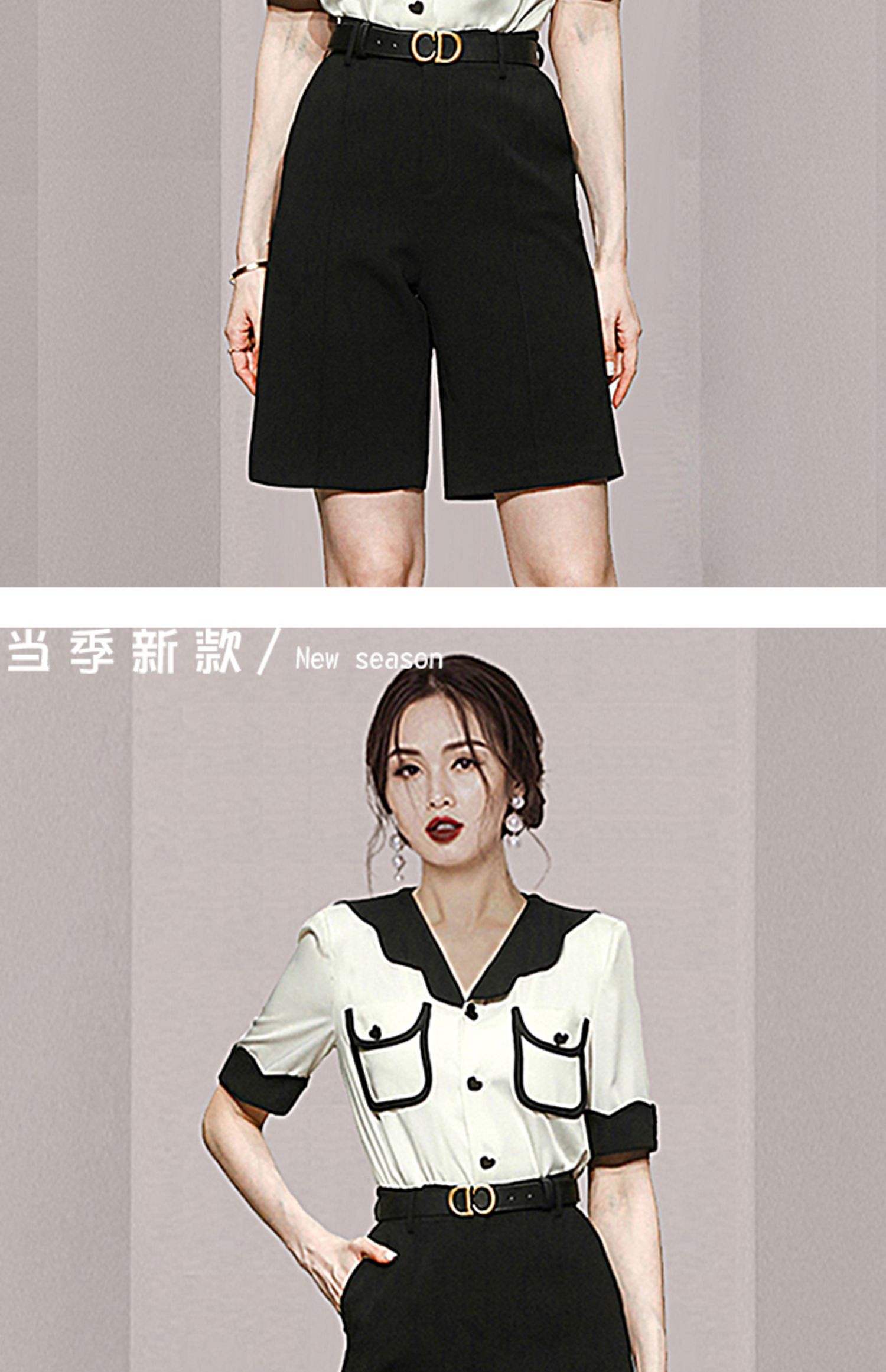 RM9640#夏季新款气质波浪花瓣翻领直筒型短袖衬衣五分短裤套装