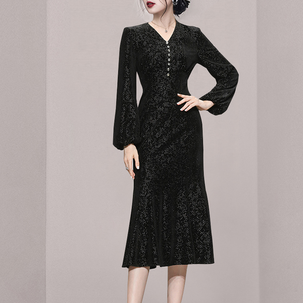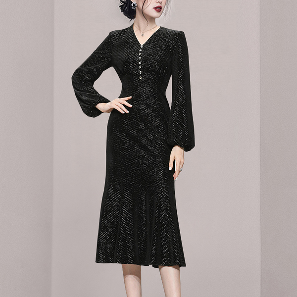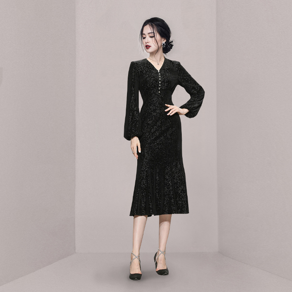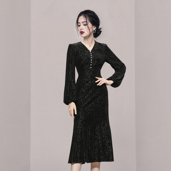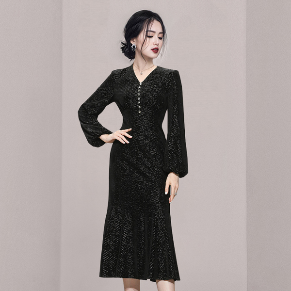 RM9642#新款气质V领钻扣灯笼袖波浪鱼尾亮丝黑色丝绒连衣裙